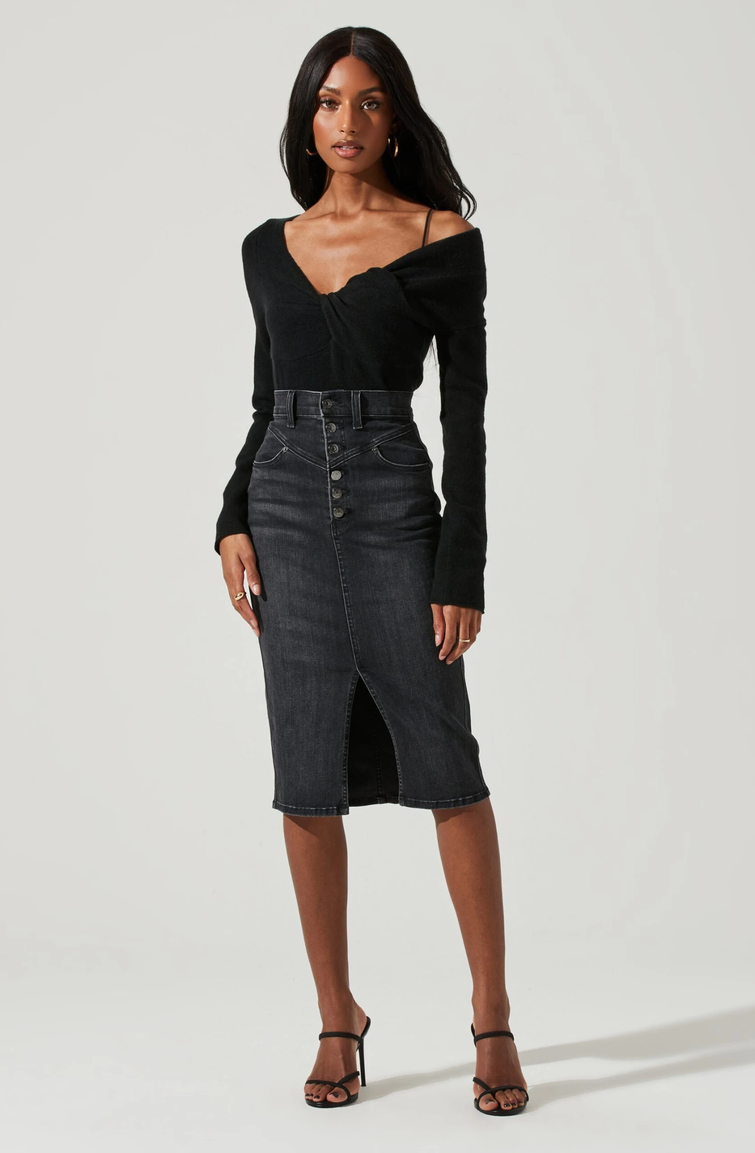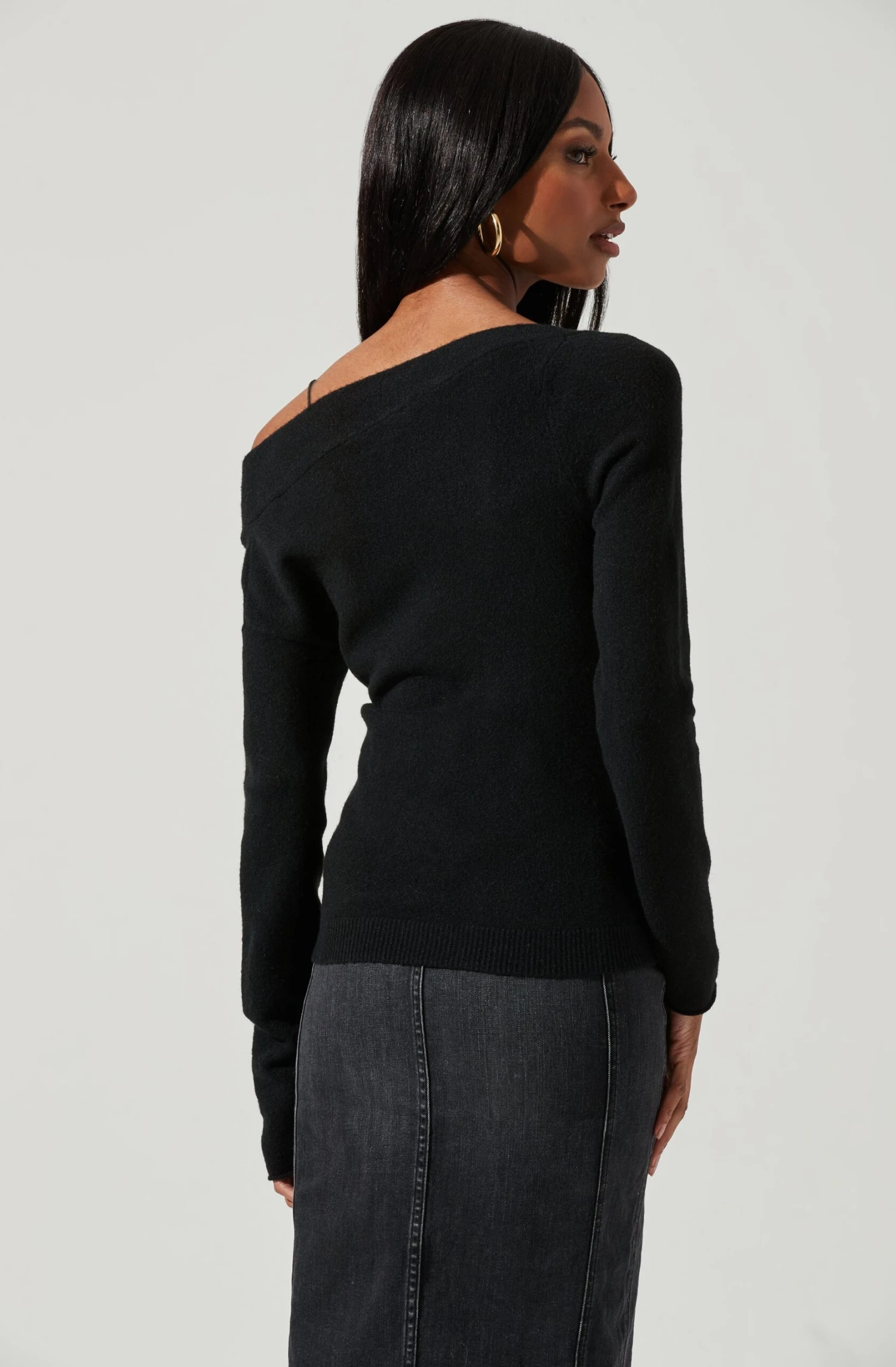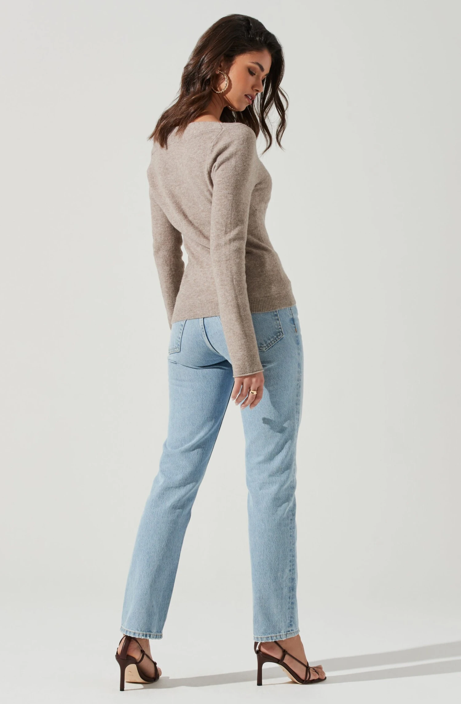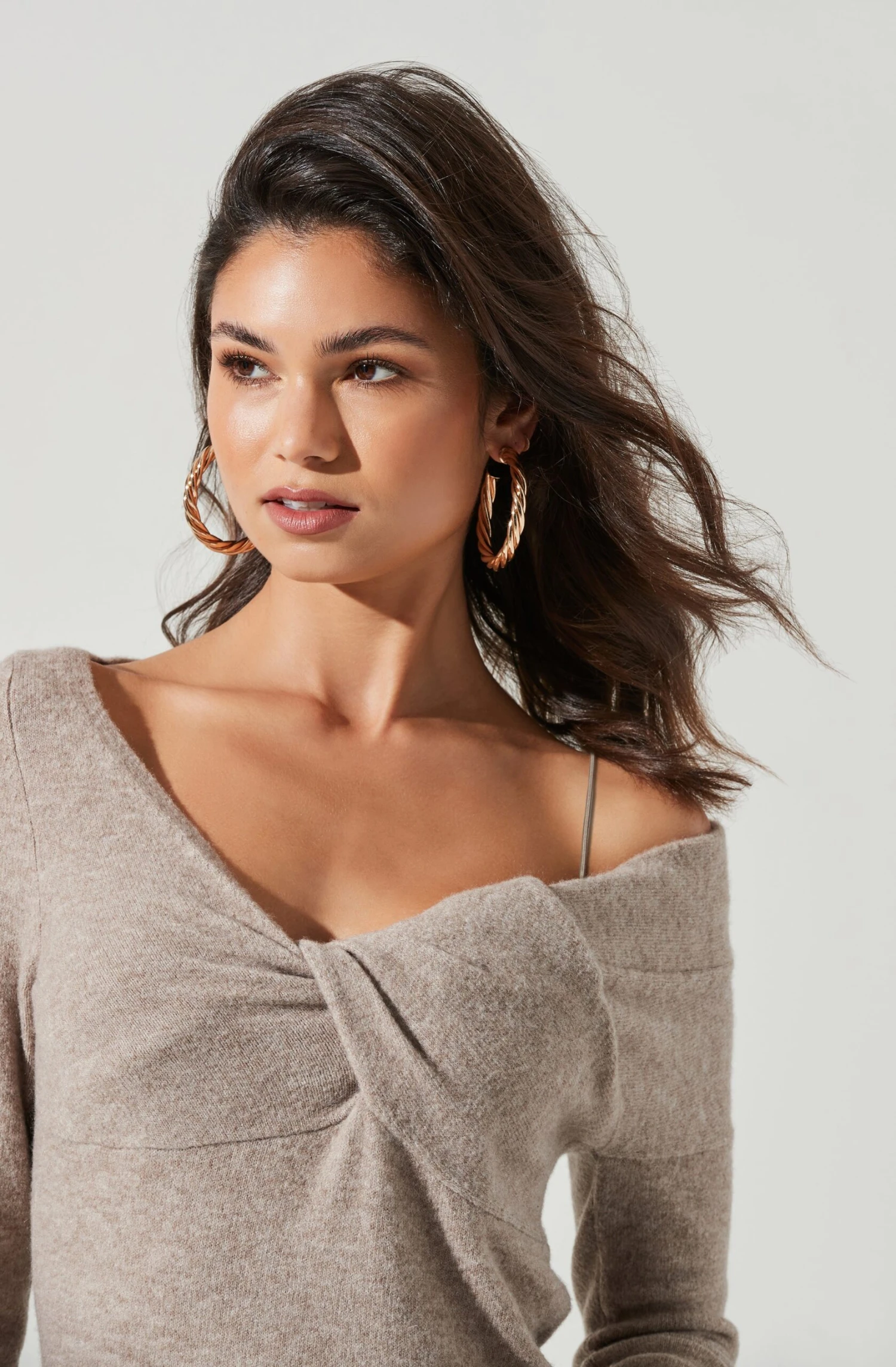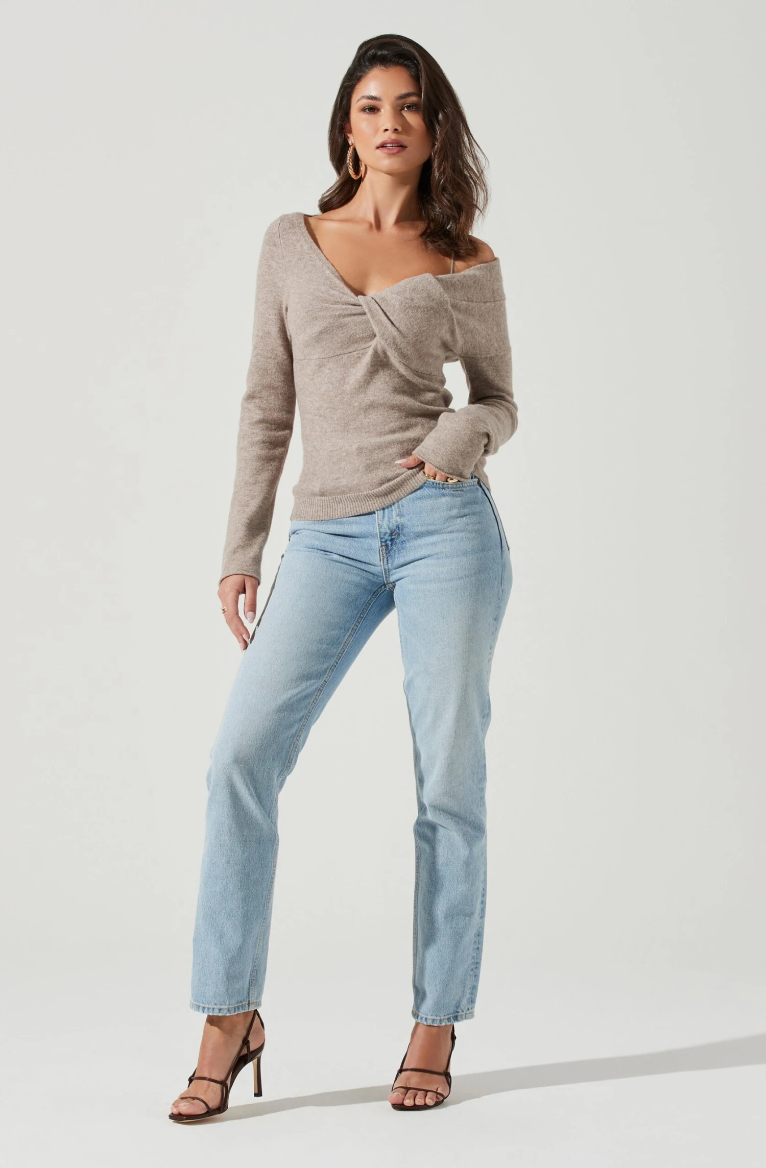 The Addison Sweater features a scoop neckline that leads to twist front accent. Long sleeves.