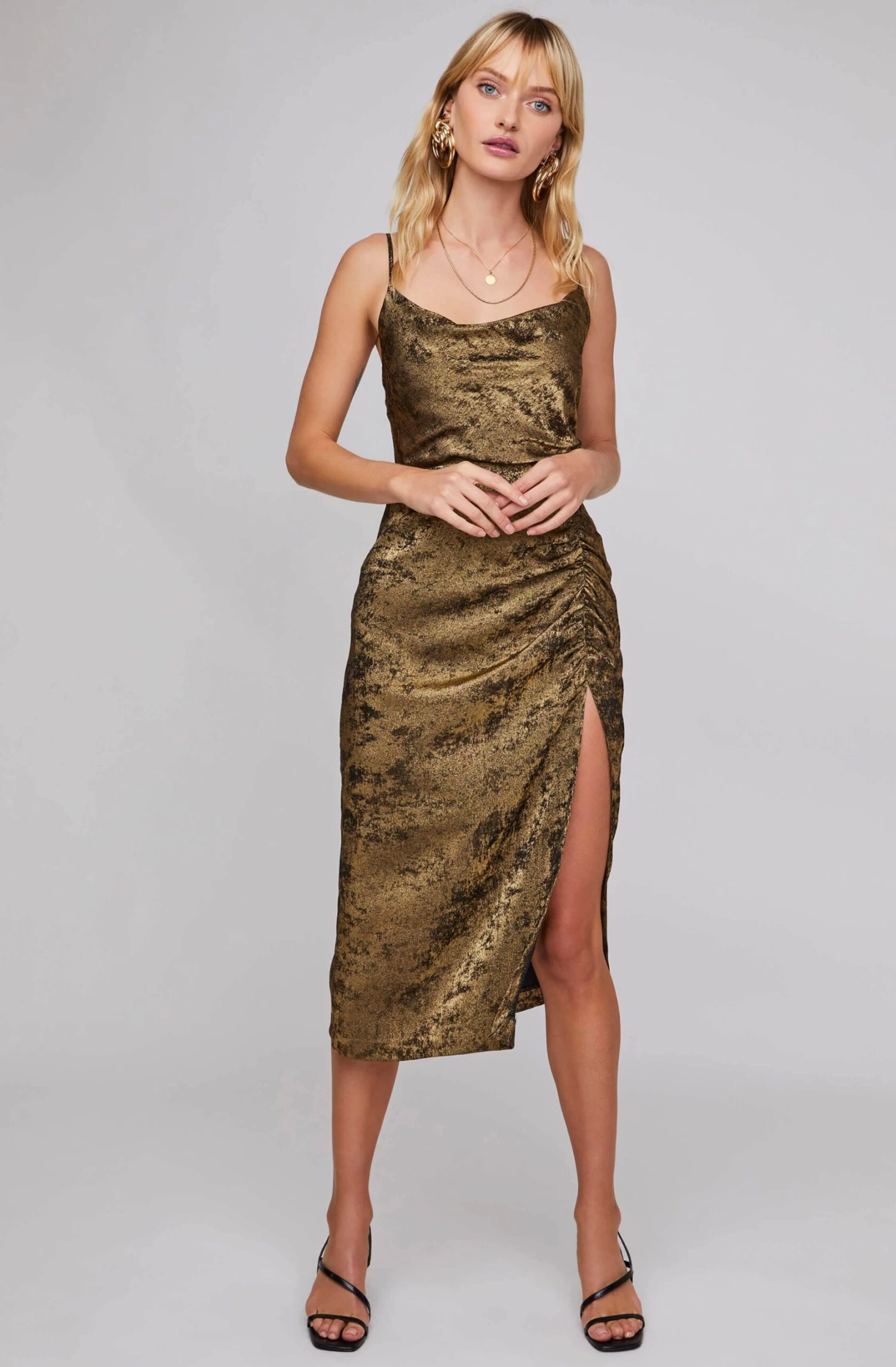 Babe, you’re golden! This breathtaking midi is impossible to ignore. Sexy cowl neck and barely-there shoulder straps lead to a ruched waist and deep front slit accent. Adjustable straps. Finished seams.