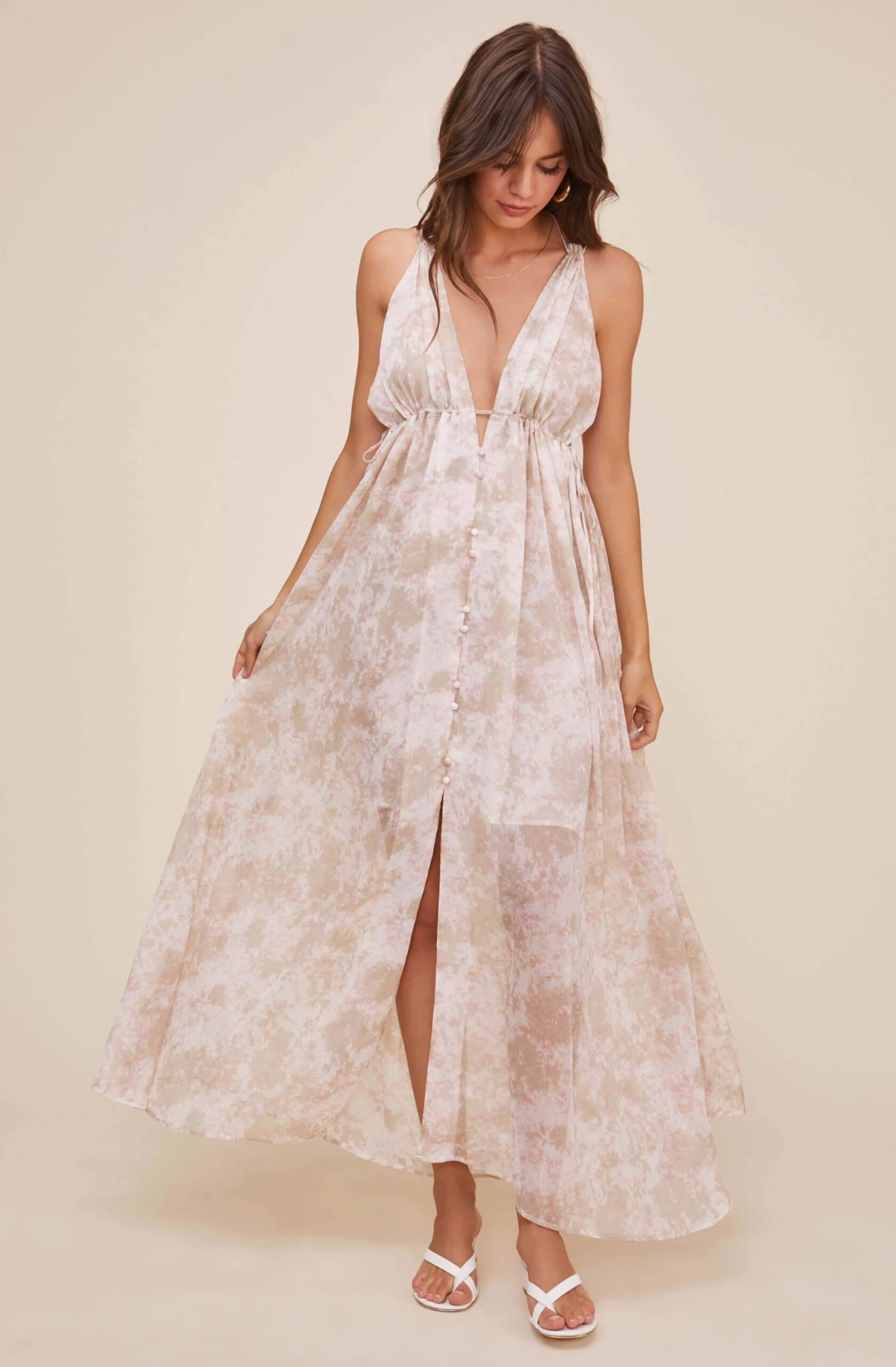 Tie dye makes an impact! The Amalfi Tie Dye Dress features a romantic plunge neckline that leads up to halter straps. Drawstring details at the waist cinches your figure for ultimate appeal. Backless. Front slit maxi skirt.