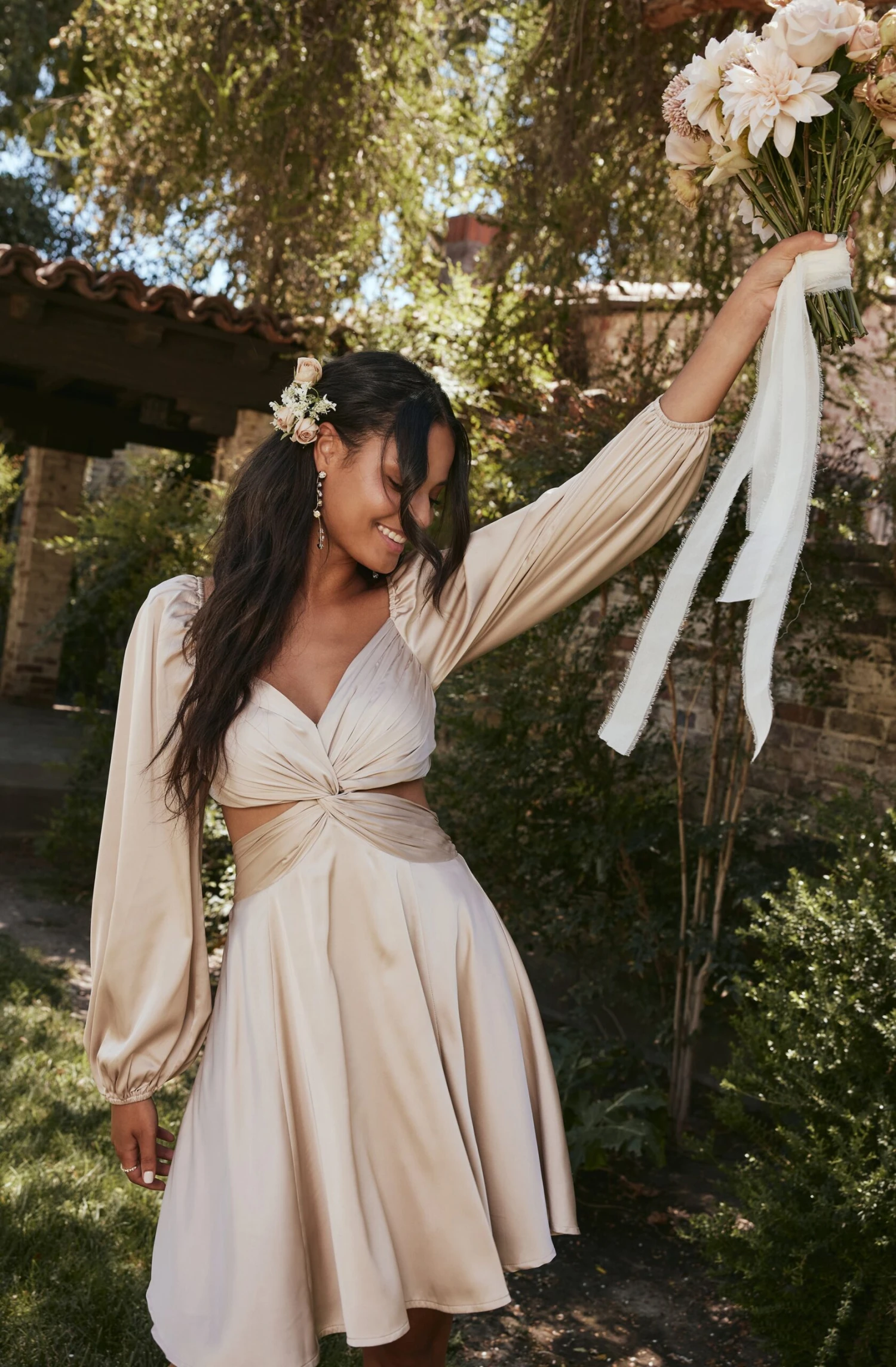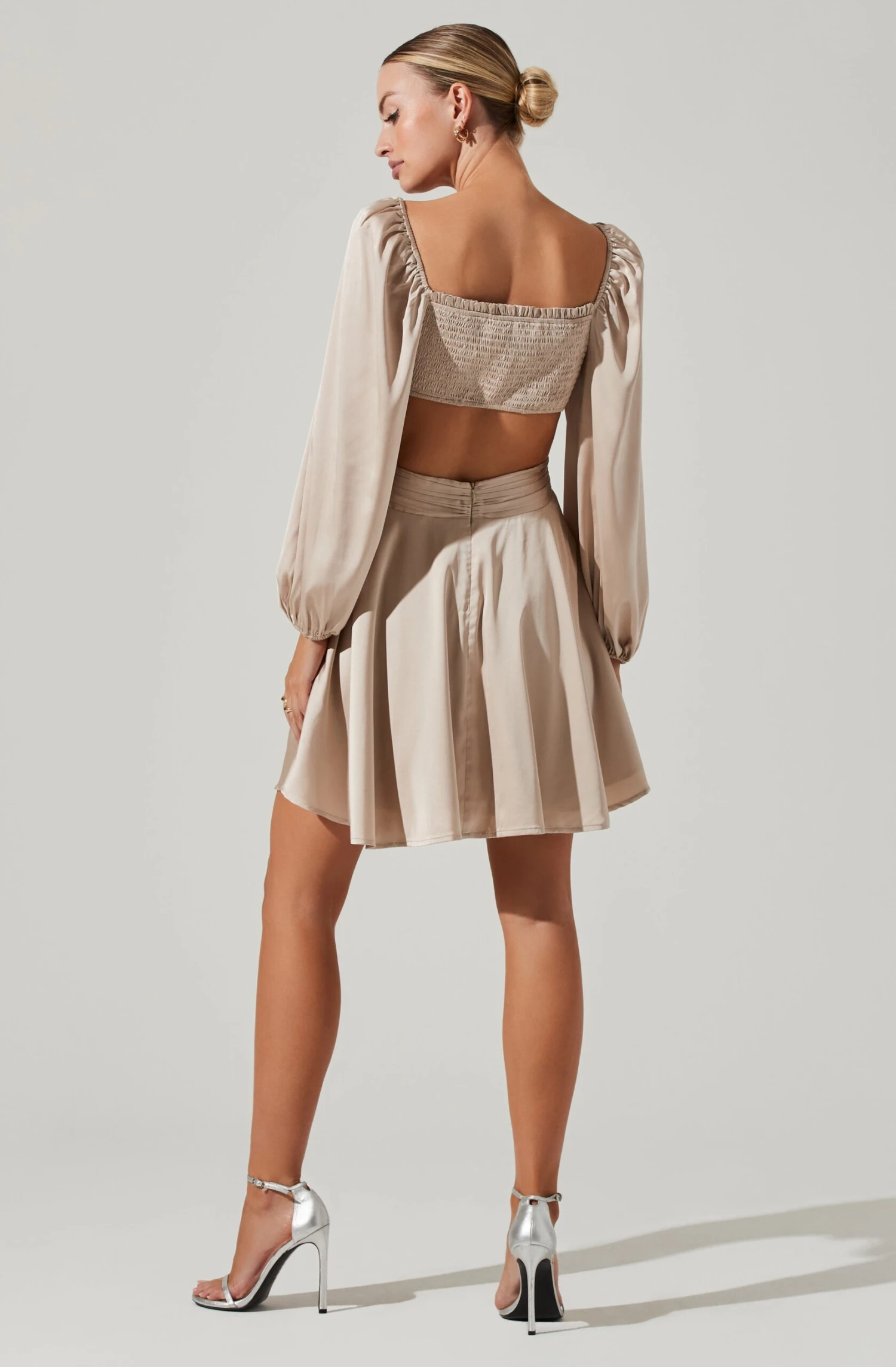 A sweet silhouette, the Anamaria Dress is just the occasion look refresh you need. Sweetheart neckline features a twist front bust and leads to side cutout accents. Flowy circle mini skirt. Long puff sleeves with elastic cuffs. Smocked back with cutout detail. Concealed back zip closure. Lined.