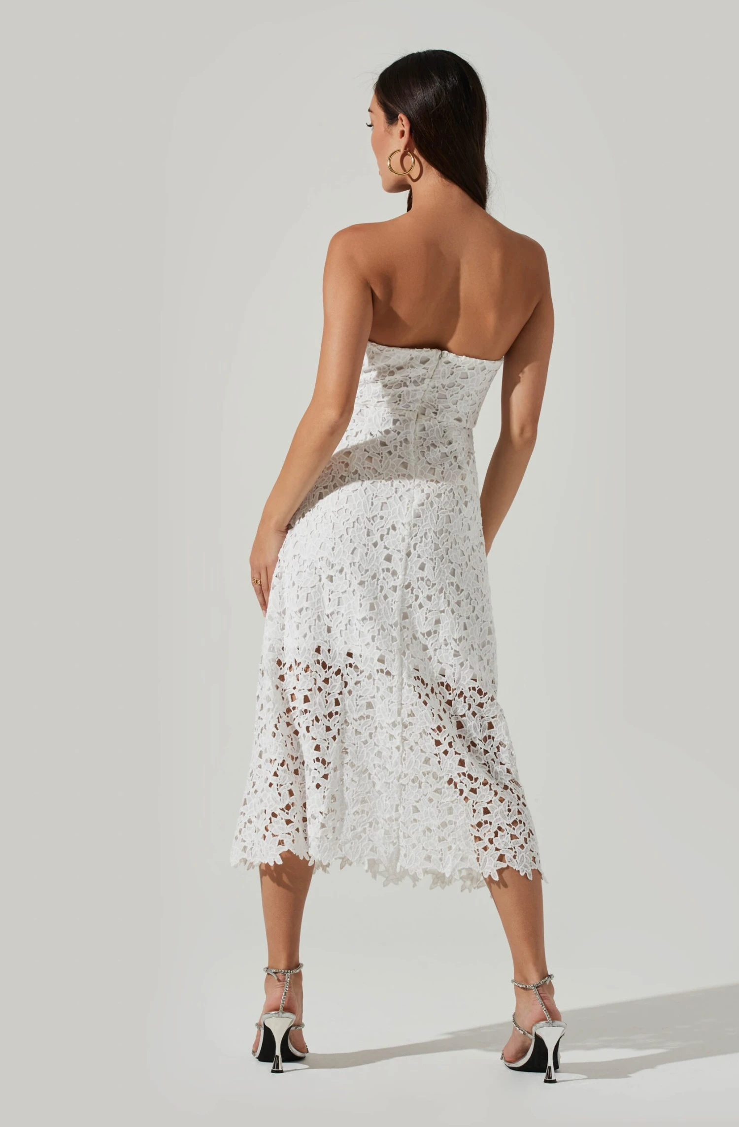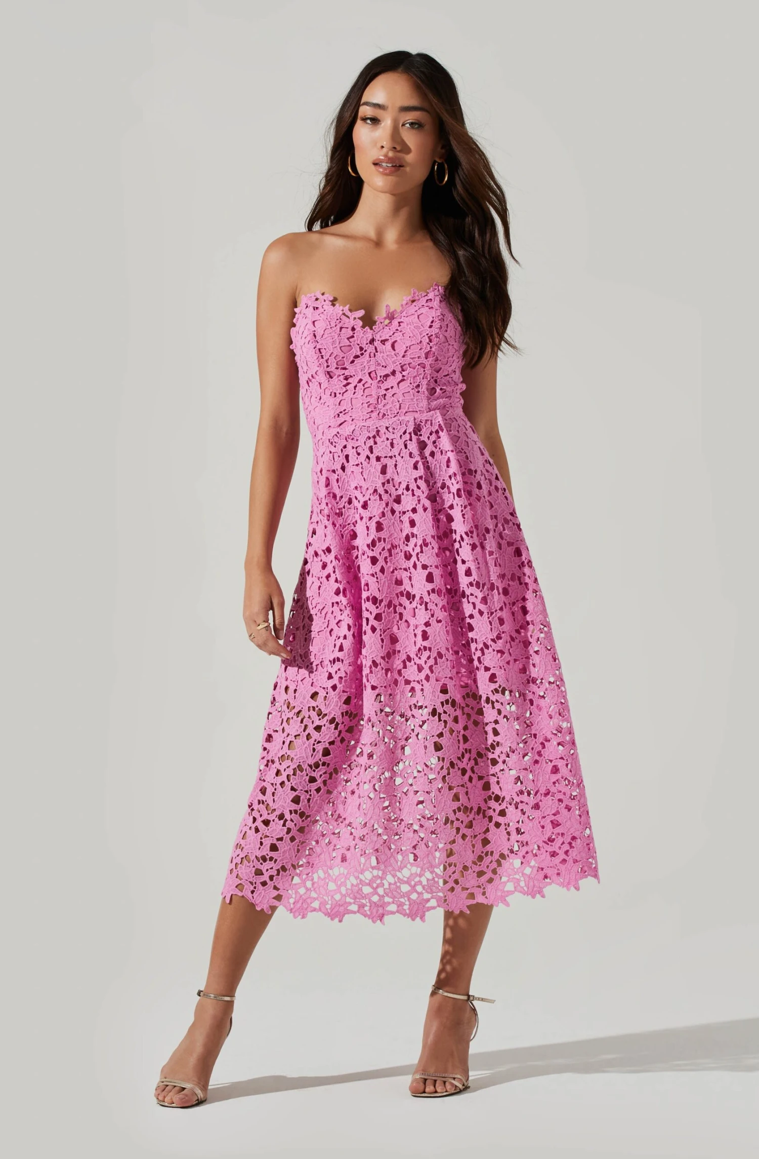 The Anaya Dress features a chic lace overlay that starts with a sweetheart neckline and descends to a darted bodice. A-line midi skirt. Partially lined.Â