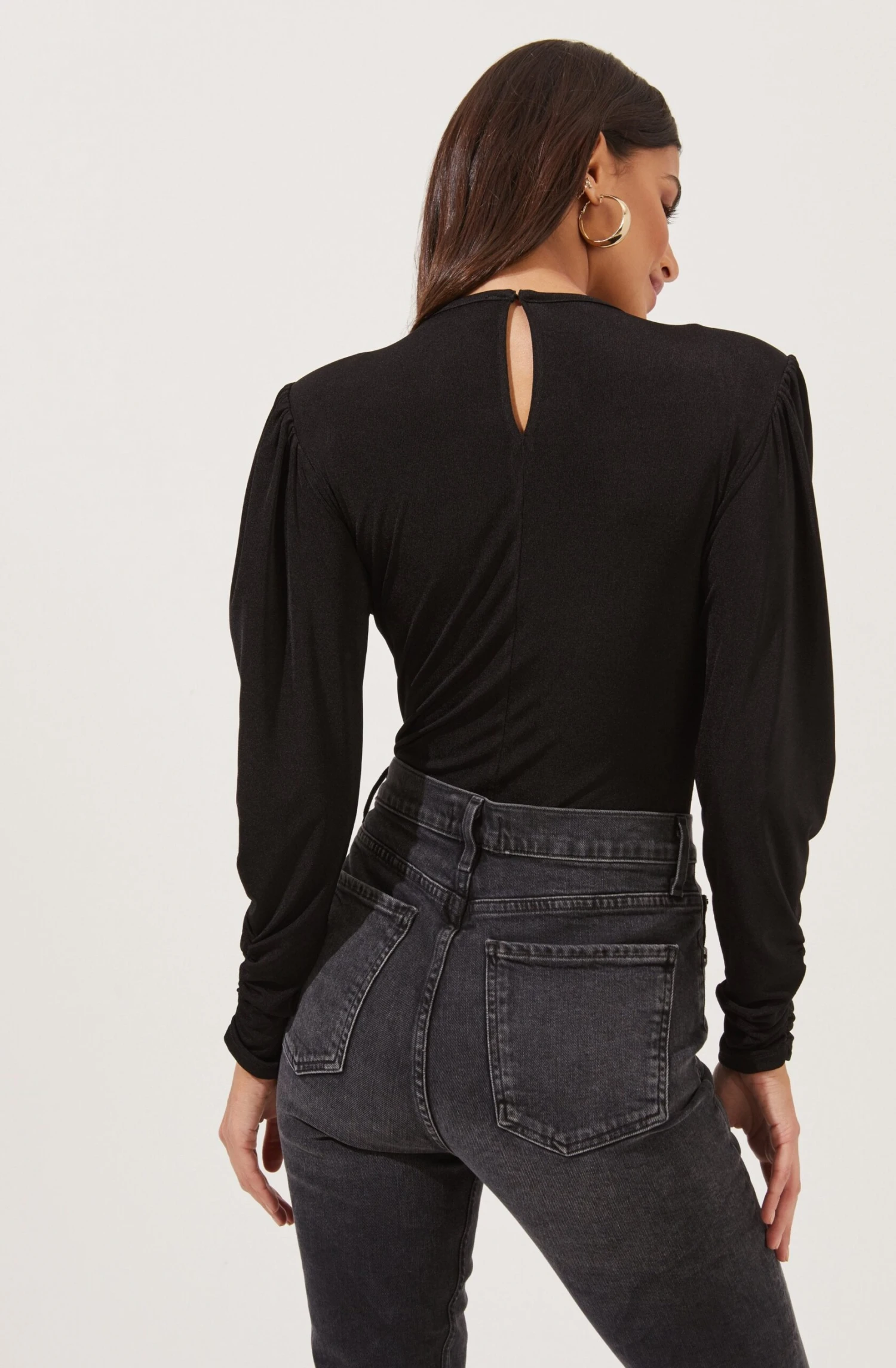 The Beckinsale Bodysuit revamps your day-to-night look. It features a round neckline that leads to a fitted bodice with draping details throughout. Long sleeves with padded shoulders. Keyhole back with button closure. Attached bottoms have snap button closures.