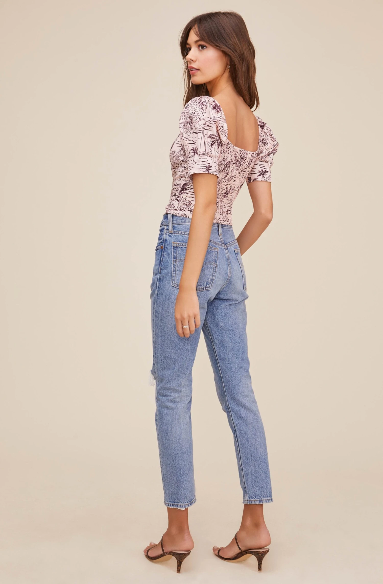 Bound for the tropics in the Bondi Top! This flattering style features a square neckline that leads to a fitted bodice. Short puff sleeves give this look a flirtatious vibe and the fun, tropical print adds some summer feelings!