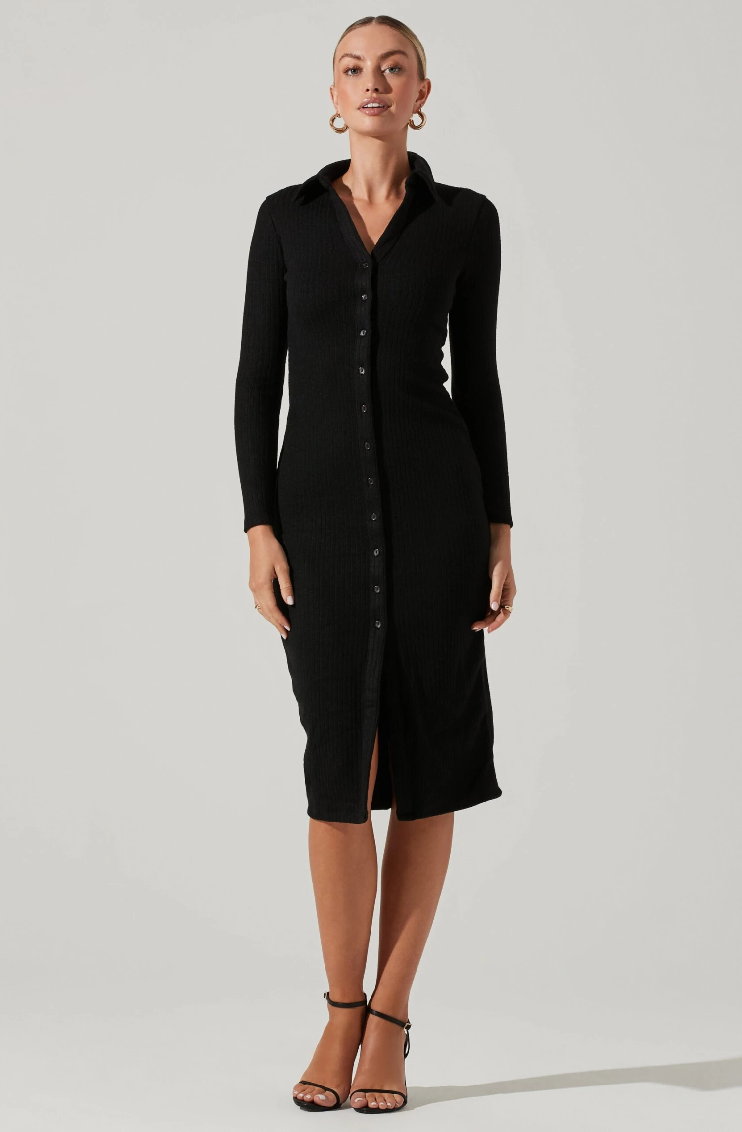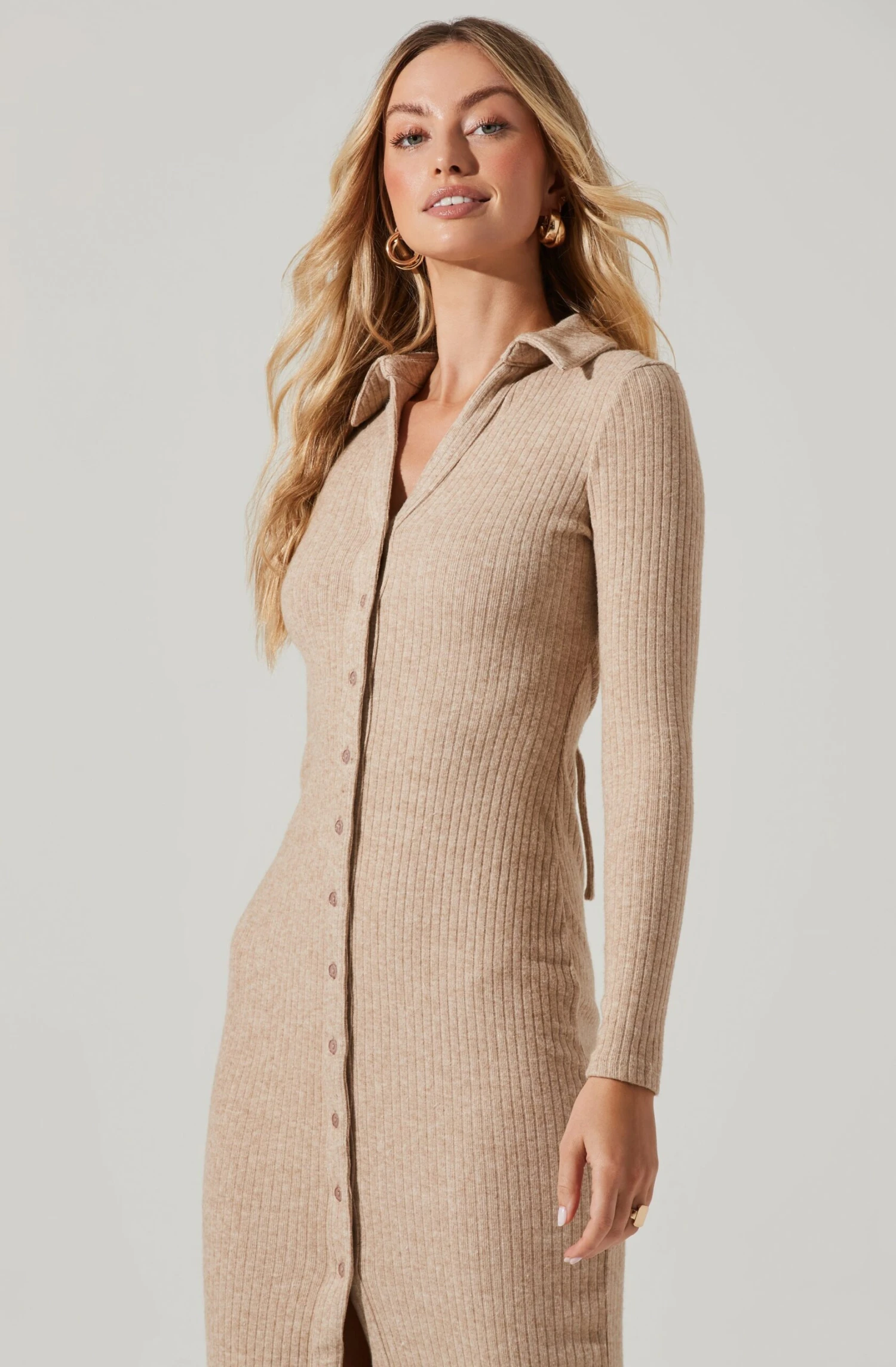 The Bransbury features a chic, ribbed knit construction that starts with a pointed collar and leads to a V neckline. Functional front button placket leads to a front slit accent. Cutout back features tying straps. Long sleeves. Midi length. Slight stretch.