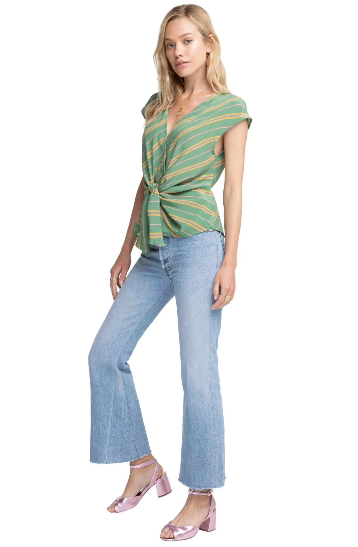 Stripe it right in this casual yet cool short sleeve blouse. Surplice front and V neckline lead to a tie front accent. Emerald stripe pattern makes this statement blouse one for the books!
