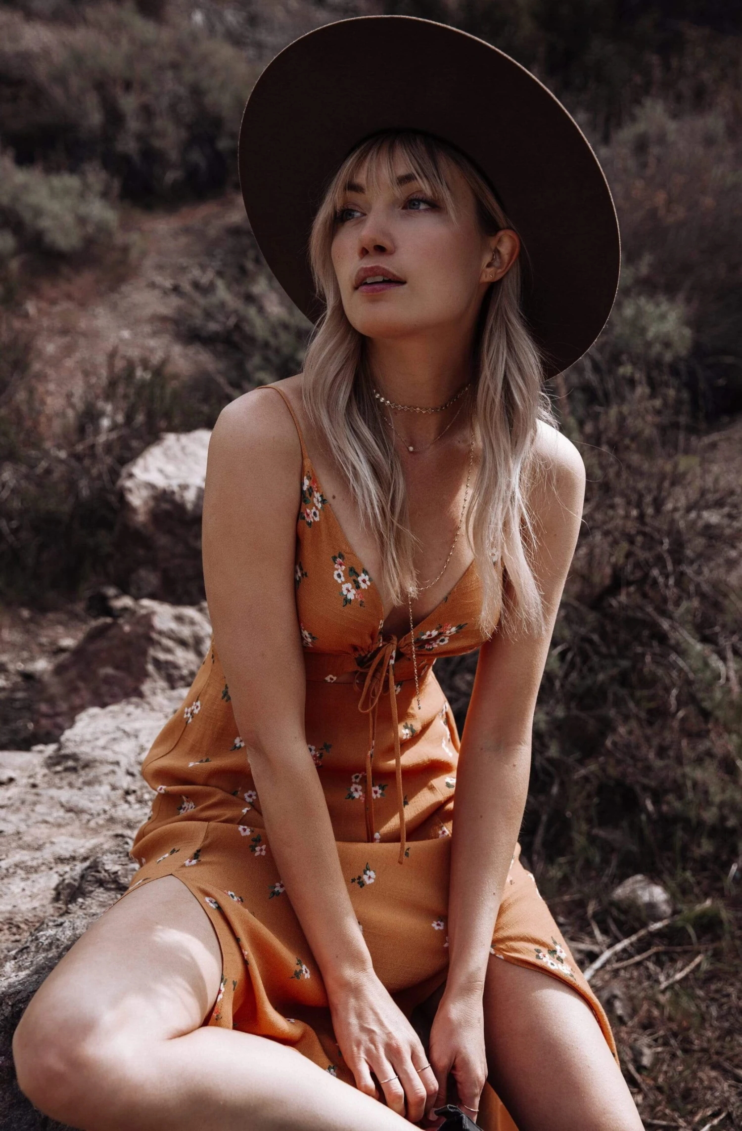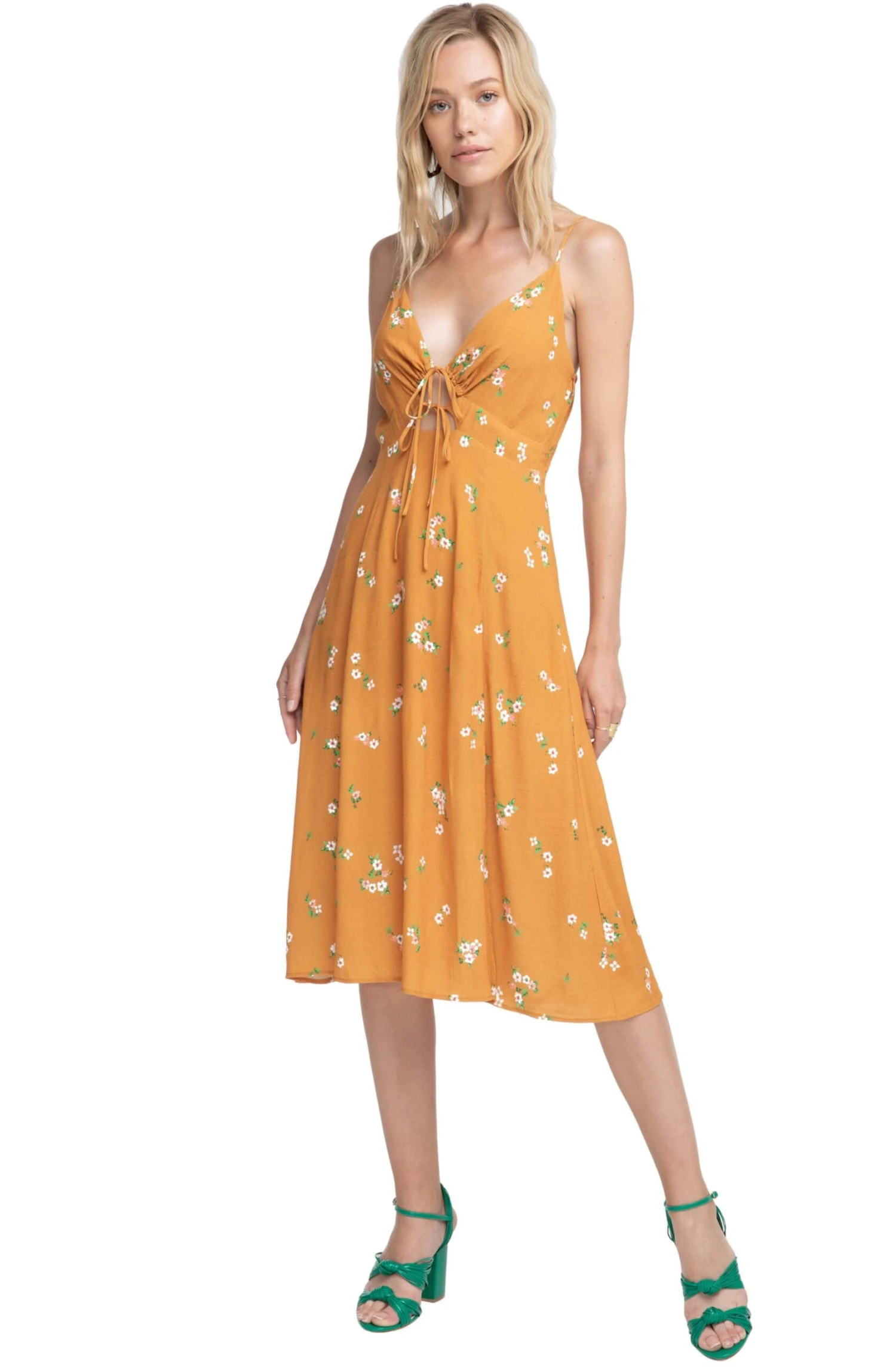 Desert daydreams come true in this floral midi dress. V neckline with a drawstring tie front accent and defined waist lead to a breezy midi skirt with dual side slit details. Smocked back. Adjustable skinny straps.