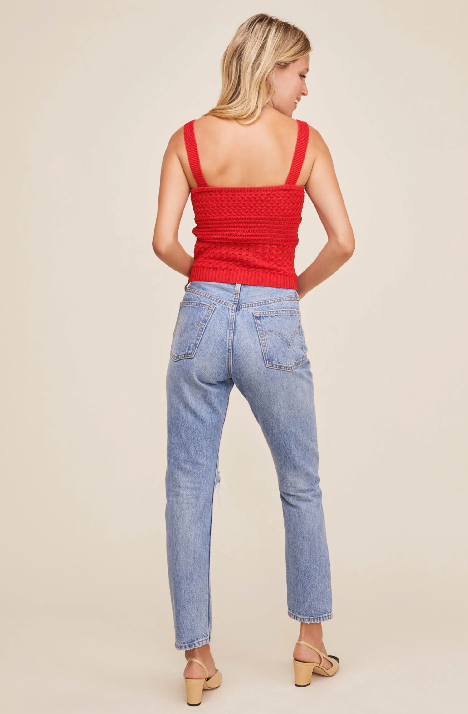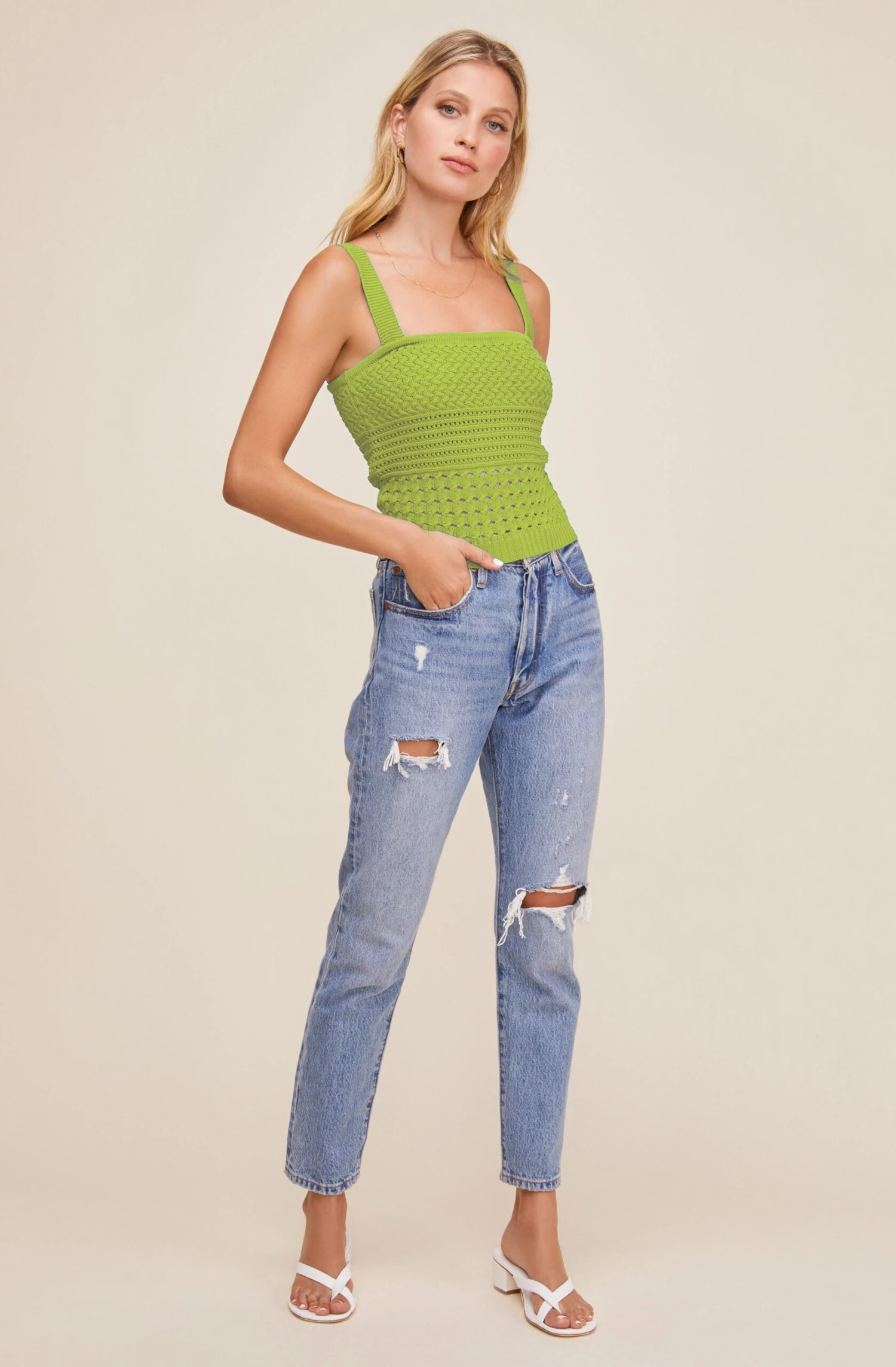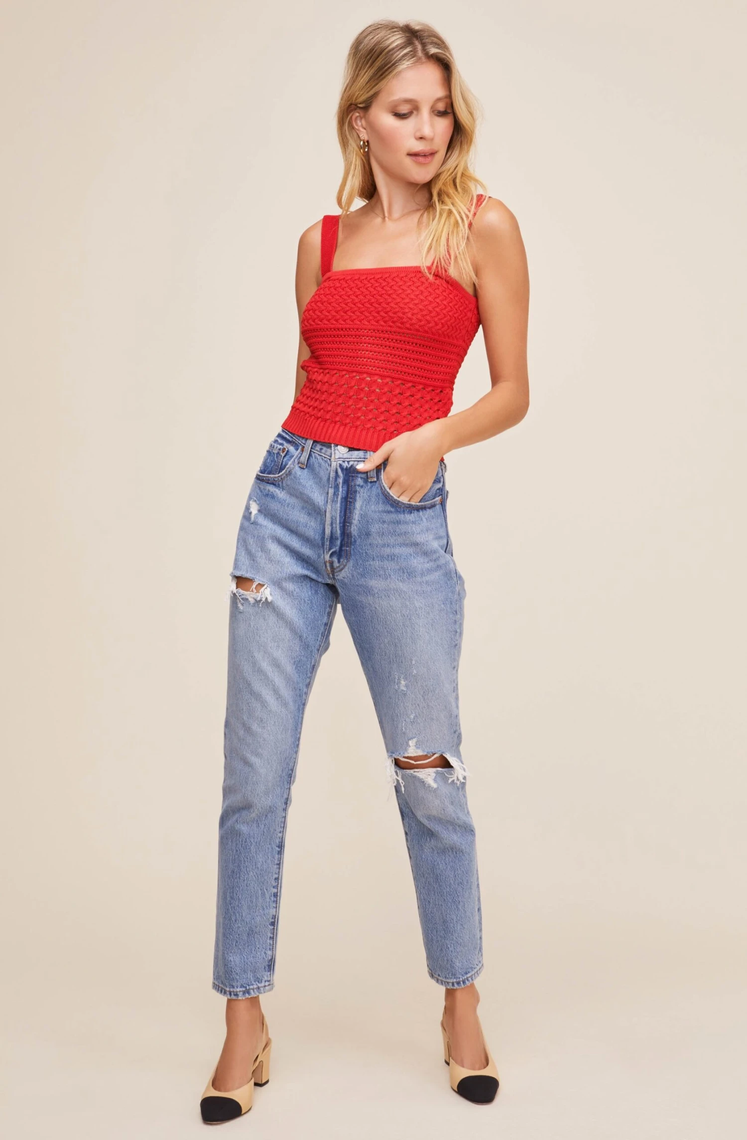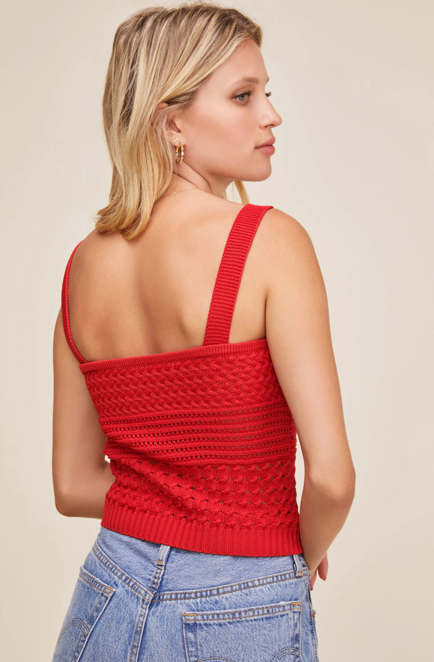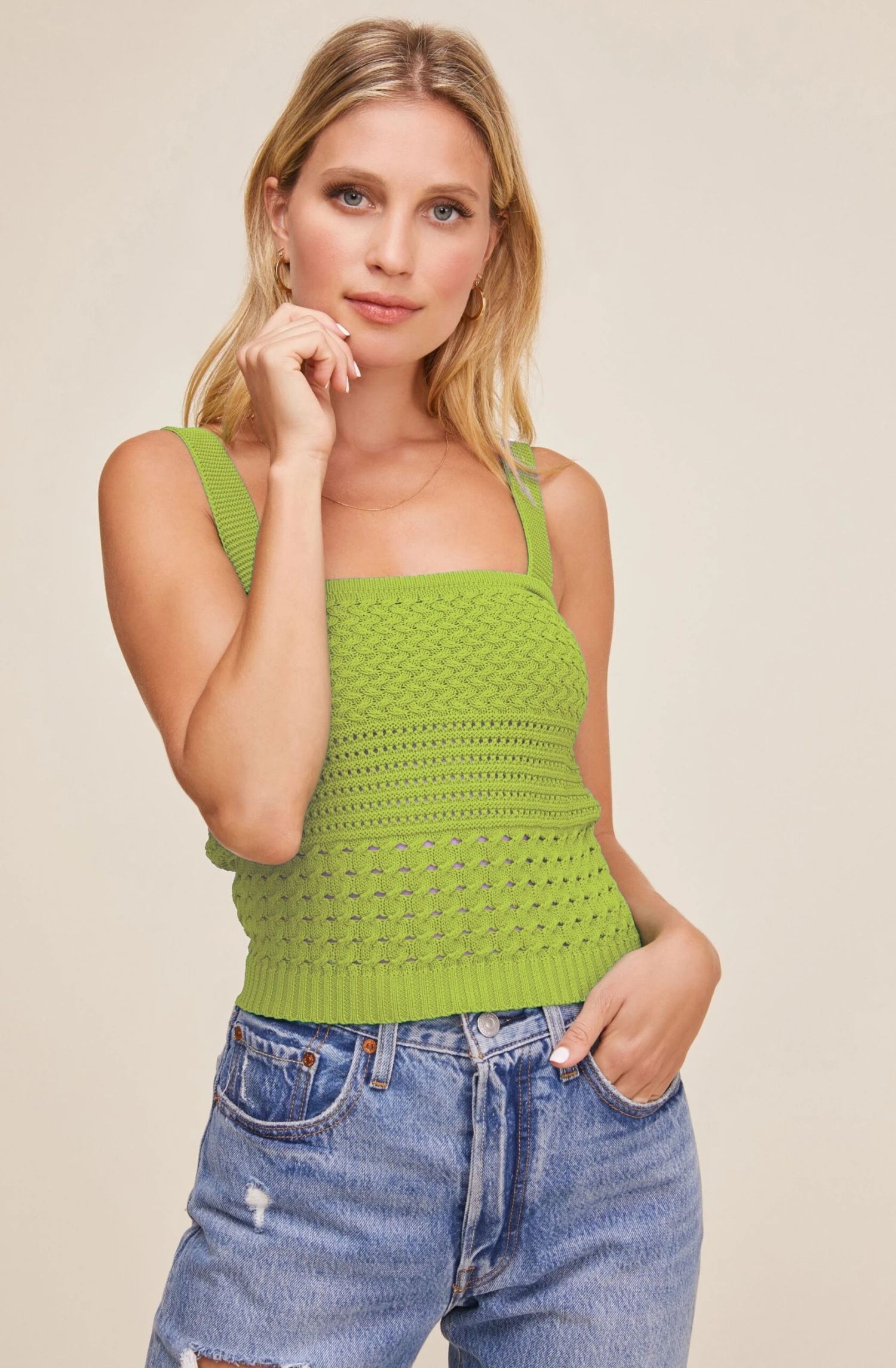 Find your summer style in the Darci Top! This chic piece features a square neckline, textured crochet style design and statement straps.