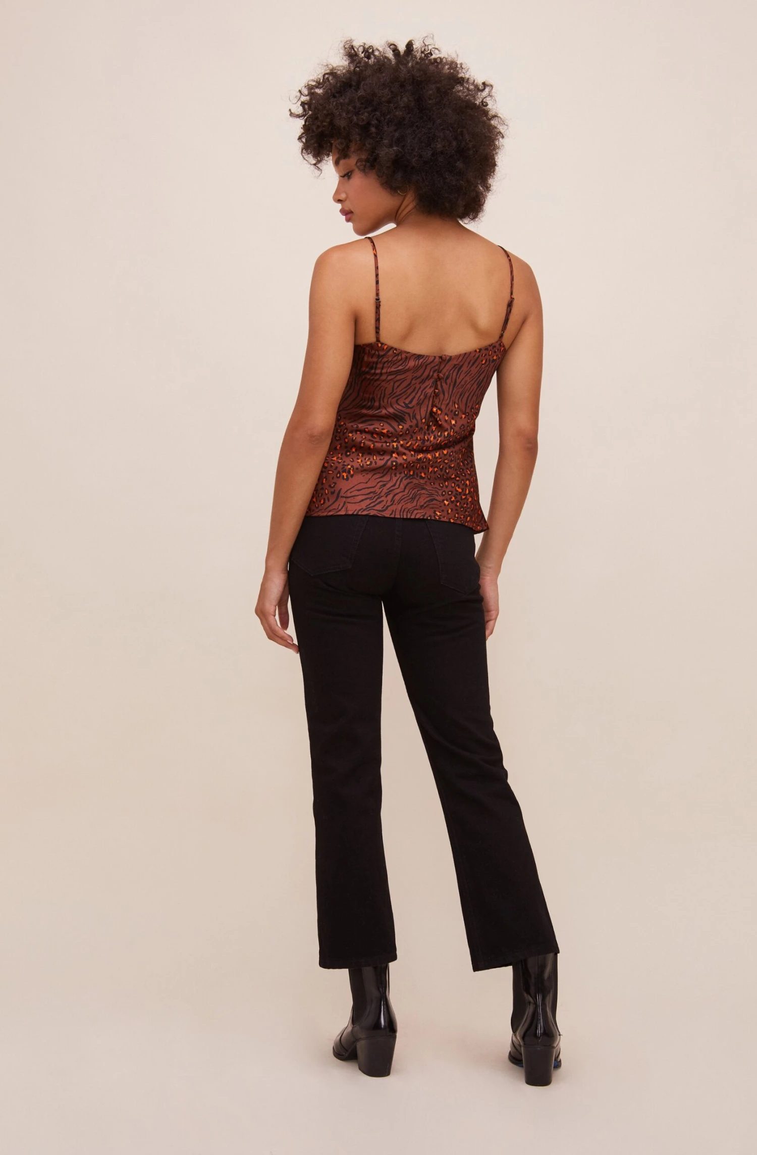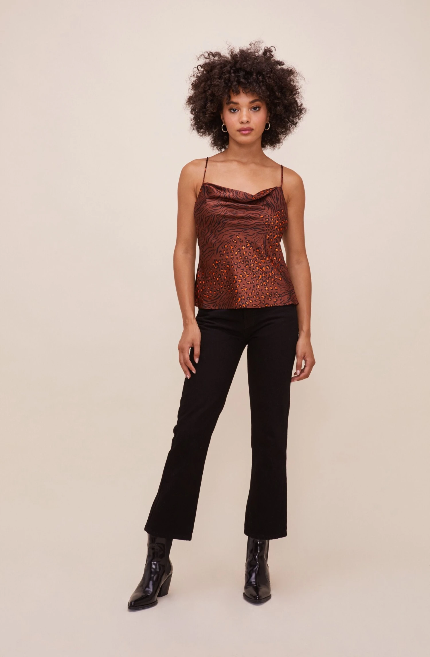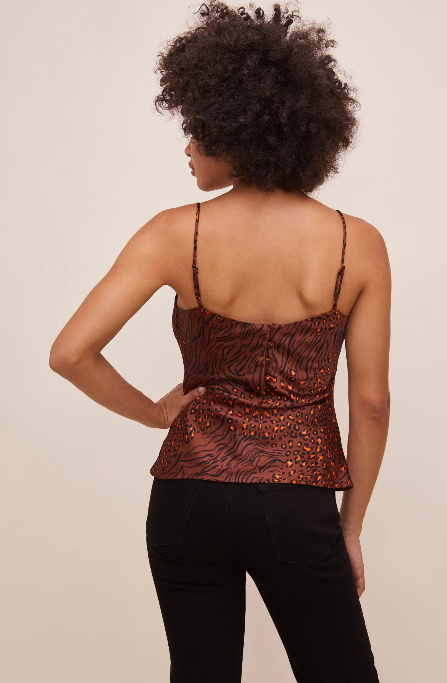 Get in the mix! This playful cami features a sexy cowl neckline supported by spaghetti straps and decorated with a clash of leopard and tiger prints!