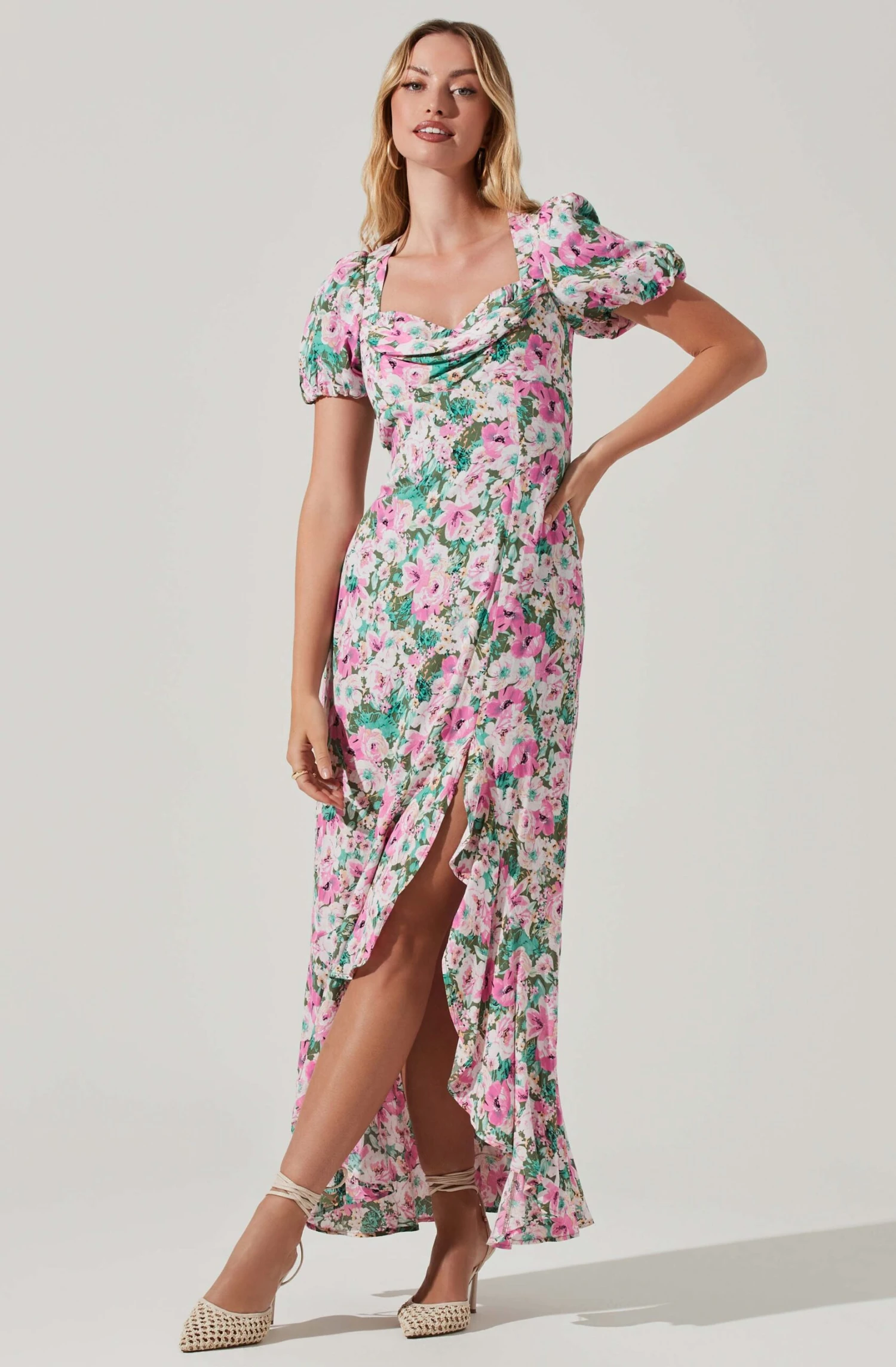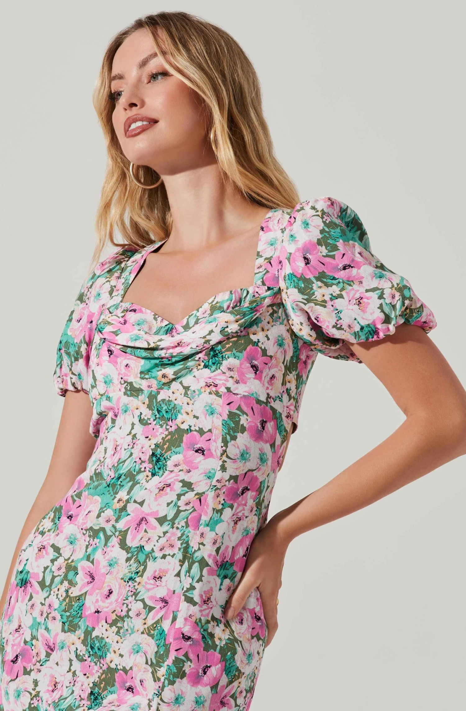 The Dayanara Dress features a chic, floral print throughout. Sweetheart neckline leads to a ruched bust. Wrapped midi skirt features a delicate, ruffle trim. Short puff sleeves. Back cutout accent. Concealed zip closure.