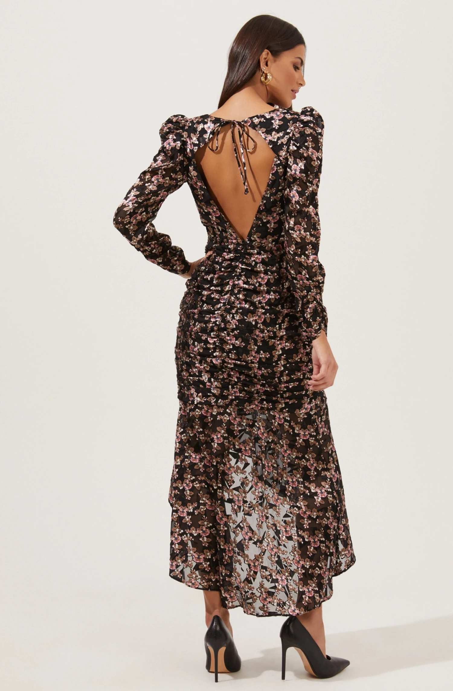 The Emmaline Dress features a sweetheart neckline that leads to a wrapped front and fitted bodice with ruching along the side. Velvet floral burnout print throughout. Long sleeves with puff shoulders. Cutout back with self-tie accent. Asymmetrical hemline.
