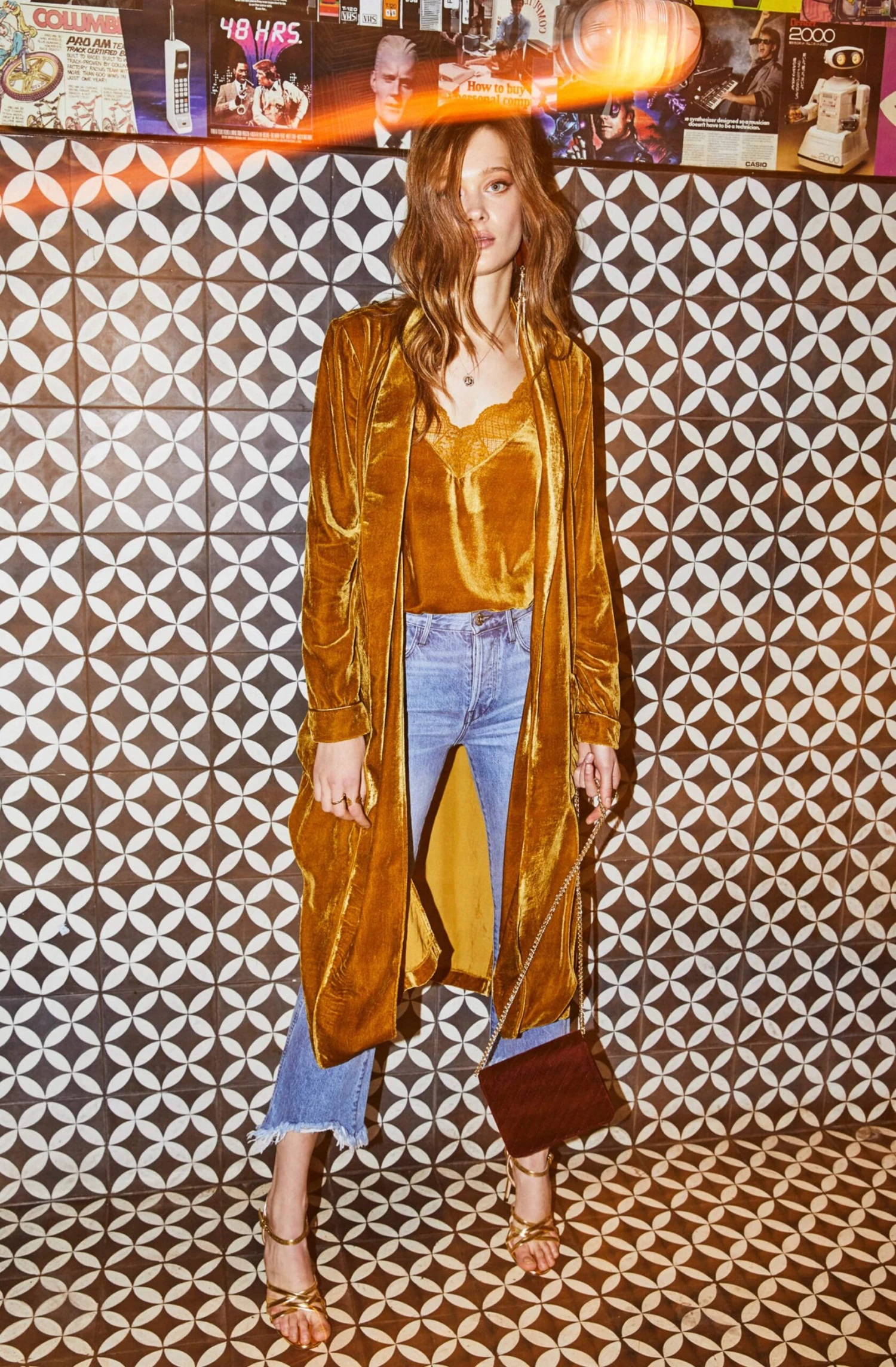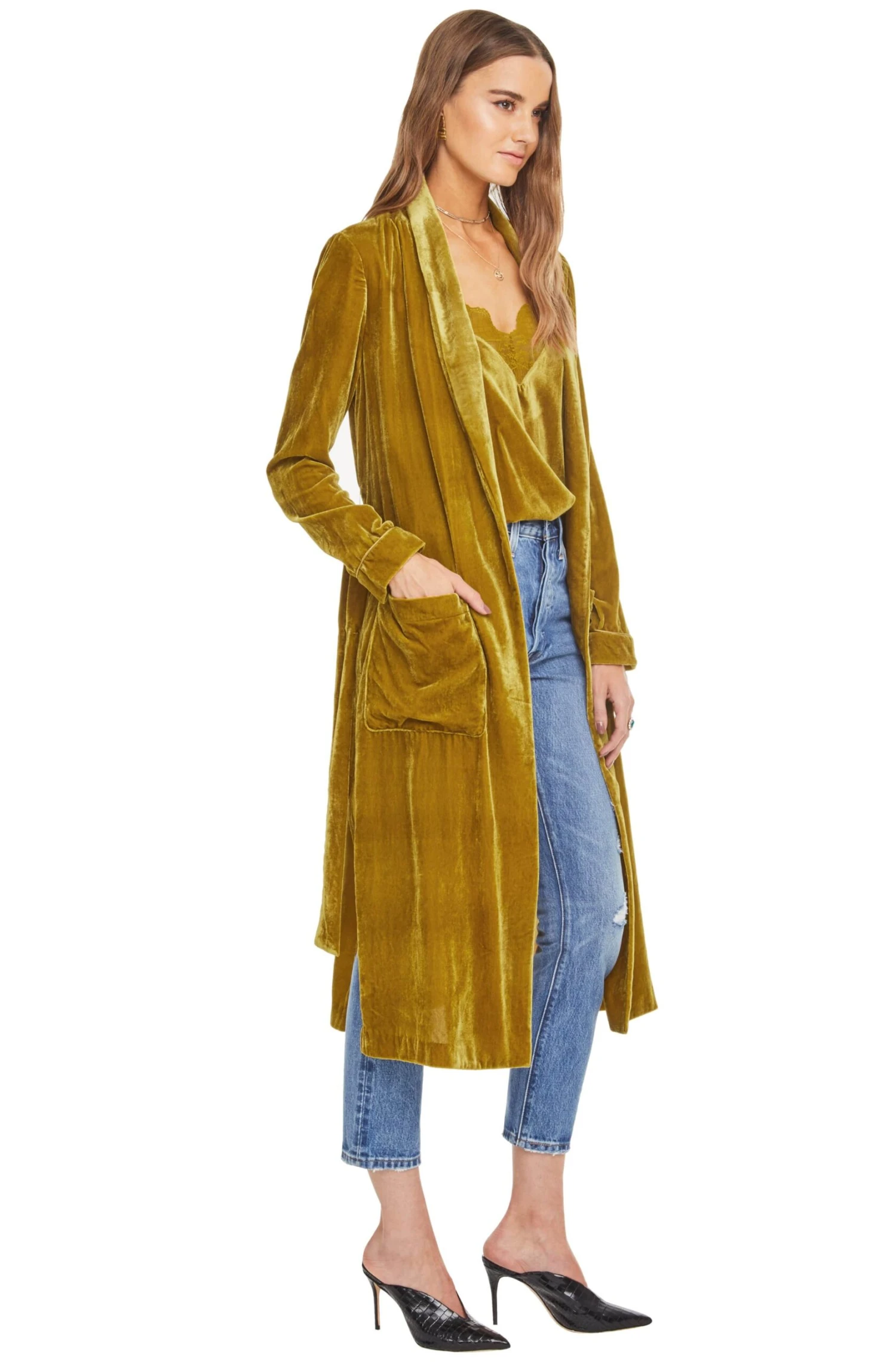 82% Viscose/18% Modal, Length: 47 7/8″ (Size M), Self Tie Closure, Dry Clean Only, Long Belted Jacket, Gold Velvet, Model is Wearing Size S, Model’s Measurements: Height 5’10” // Bust 34″ // Waist 24″ // Hips 34″, Fits True to Size, Style#ACT15139
