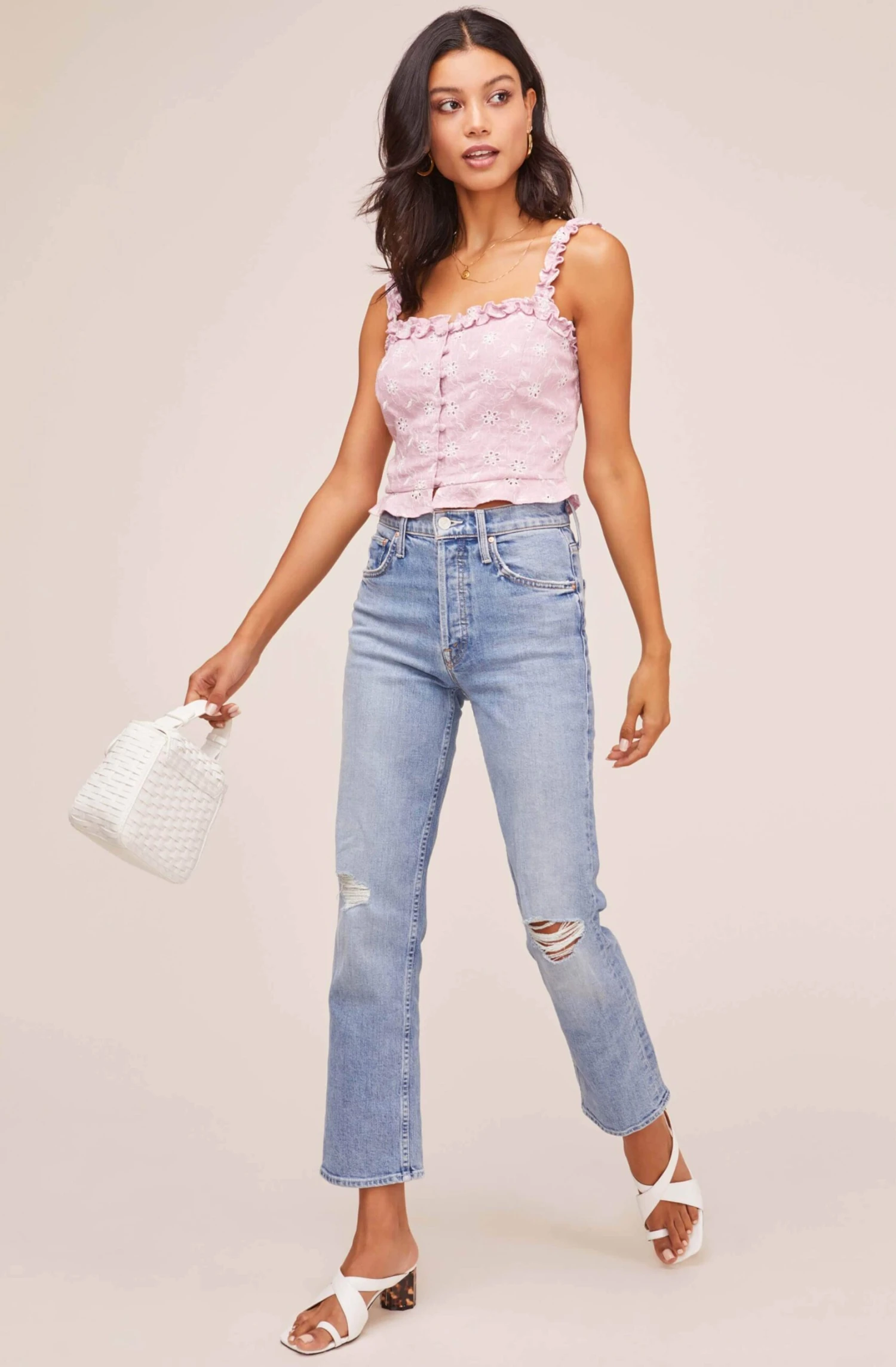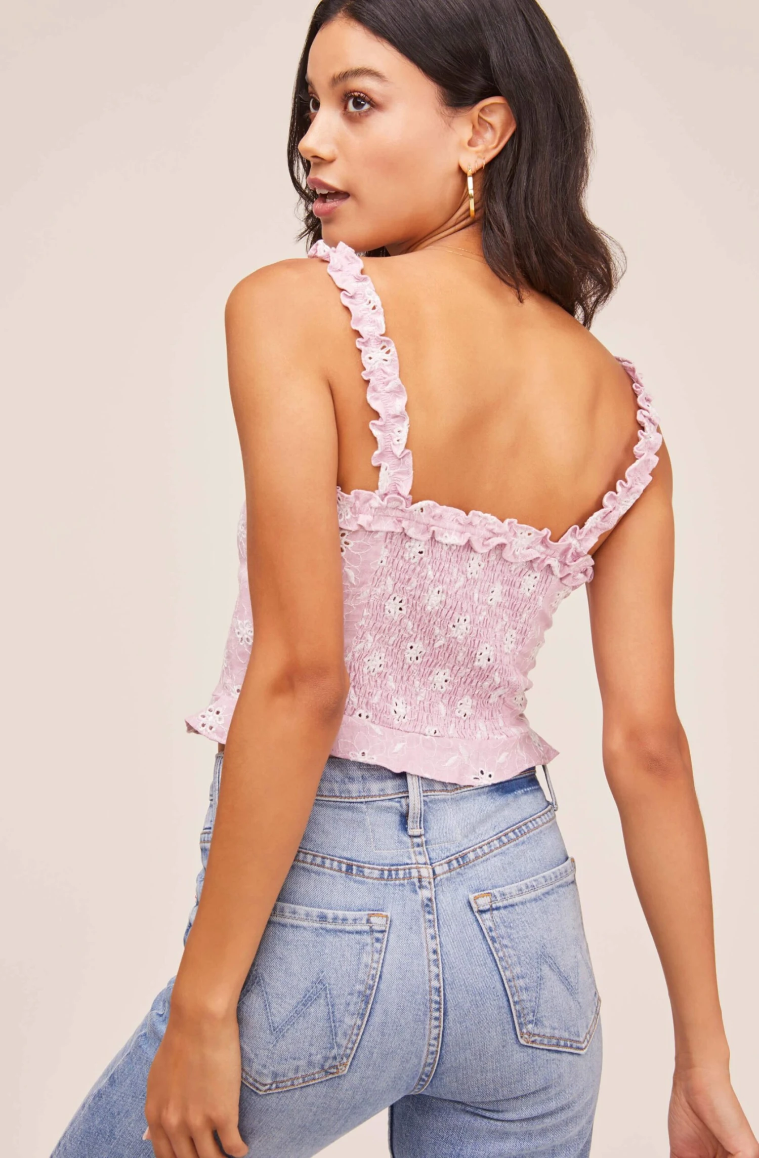 Have an adventure in florals. Delicate eyelet lace top starts with a chic square neckline trimmed in ruffles. Front button details and seamed bodice give this top a corset-inspired silhouette. Ruffle hem and smocked back.