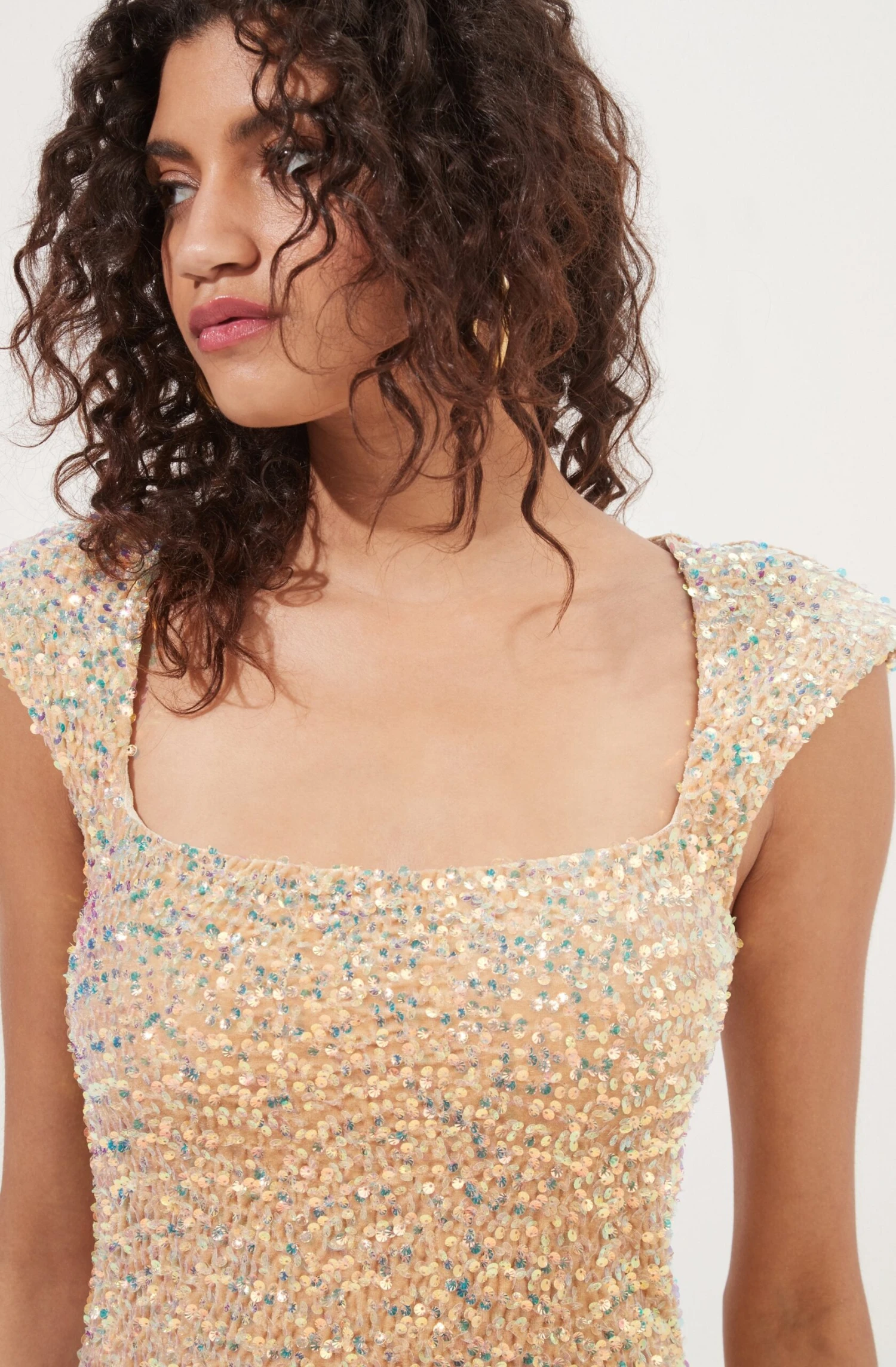Made to shine in the Galaxy Dress! It features a chic sequin finish throughout with a square neckline, short cap sleeves and abbreviated hem. Bodycon fit.
