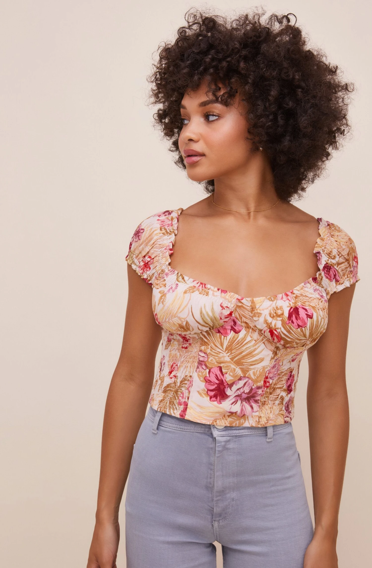 Tropical times ahead! This top features a square neckline with a soft ruffle trim. Bustier front leads to a fitted bodice and smocked accents for an ideal fit. Short cap sleeves.