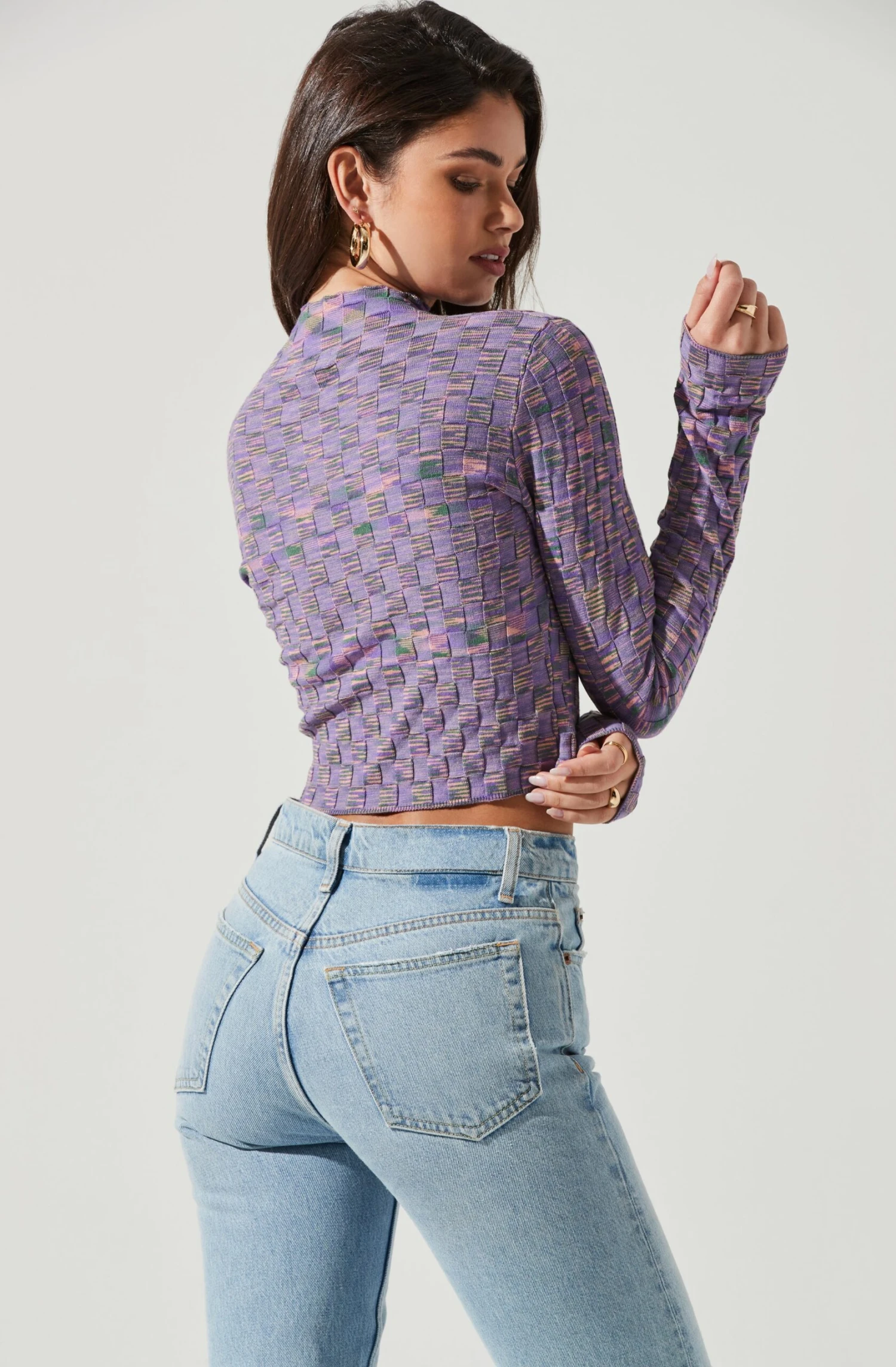 Keep it on-trend with the Izzy Top. It features a marled knit design with a checkered pattern throughout. Mock neck and long sleeves. Cropped bodice. Slight stretch.