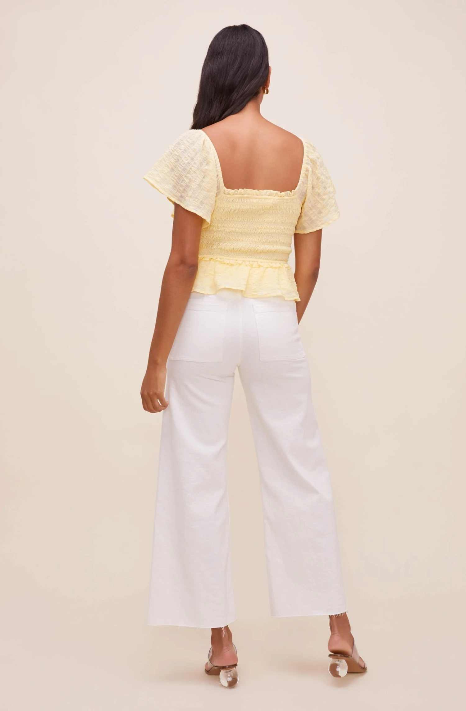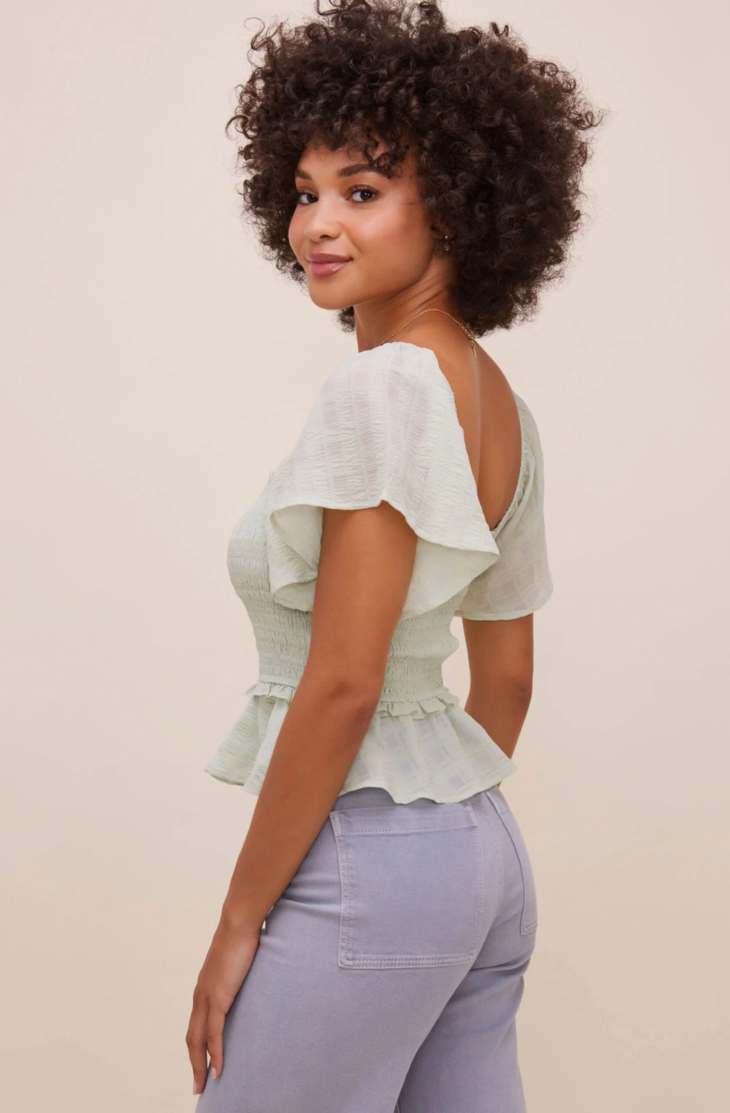 A flattering top featuring a square neckline that leads to a smocked body and ends with a ruffle hem. Short flutter sleeves with a grid pattern. Square cut back.