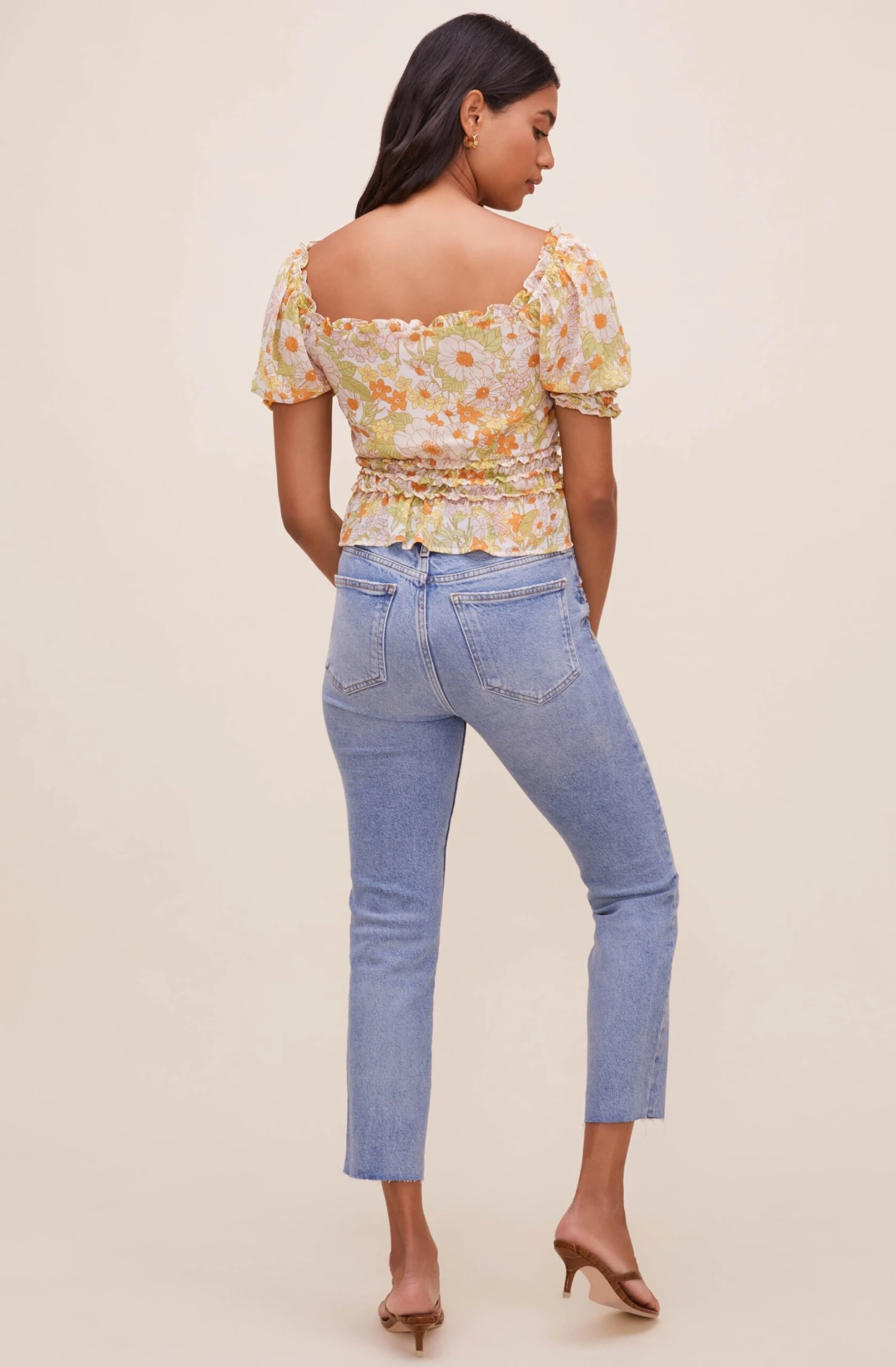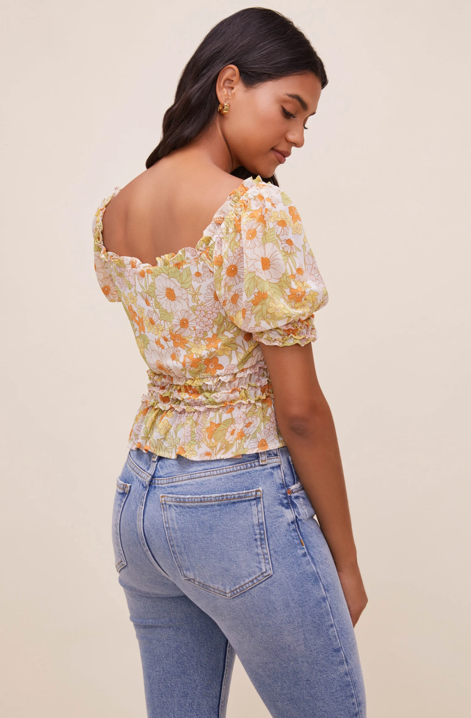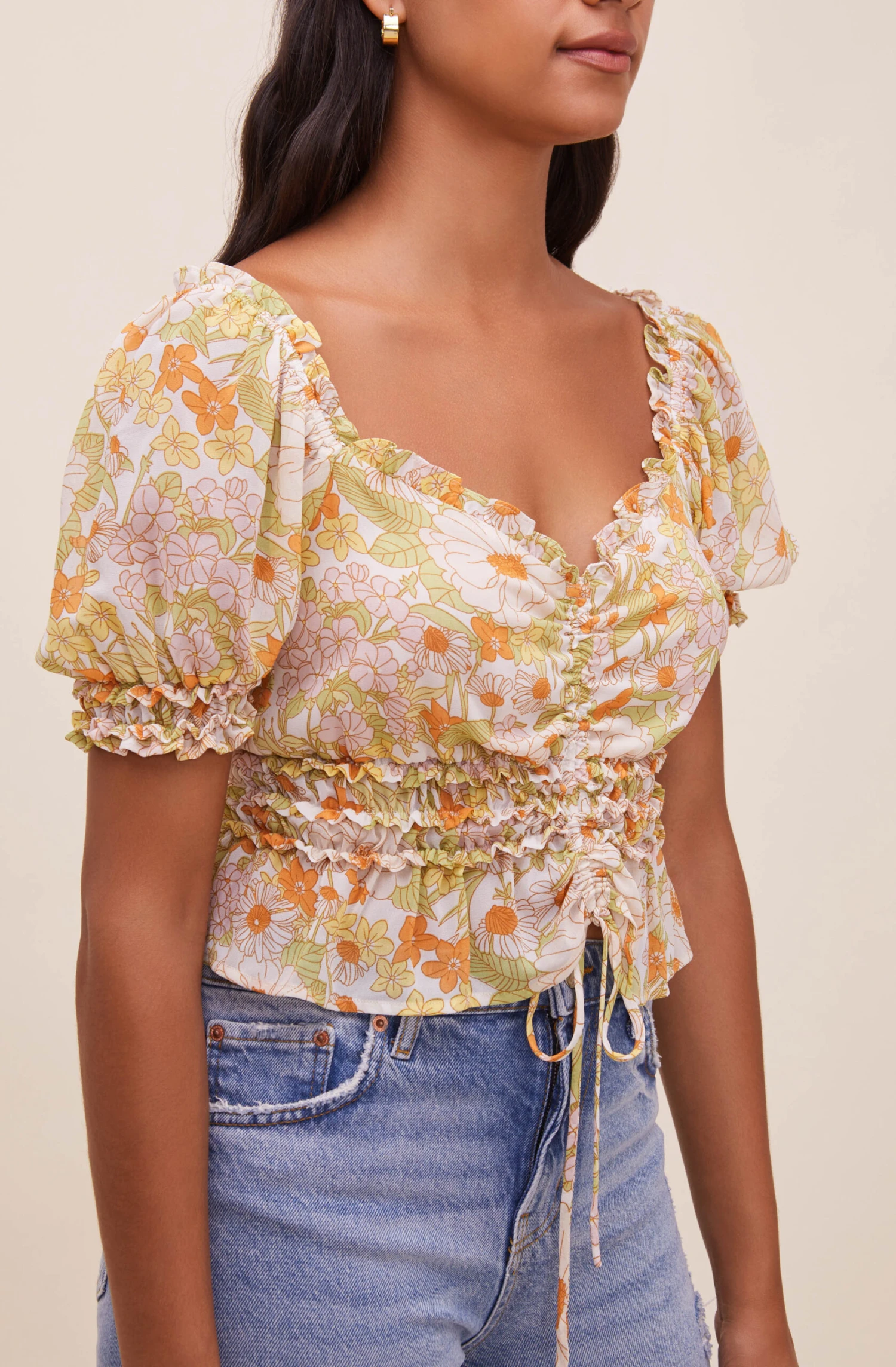 Bringing retro back with the Jayla Top. It features a sweetheart neckline with a subtle ruffle trim. Shirred front features a drawstring accent. Ruffle trimmed waist. Short puff sleeves. Retro floral print throughout.