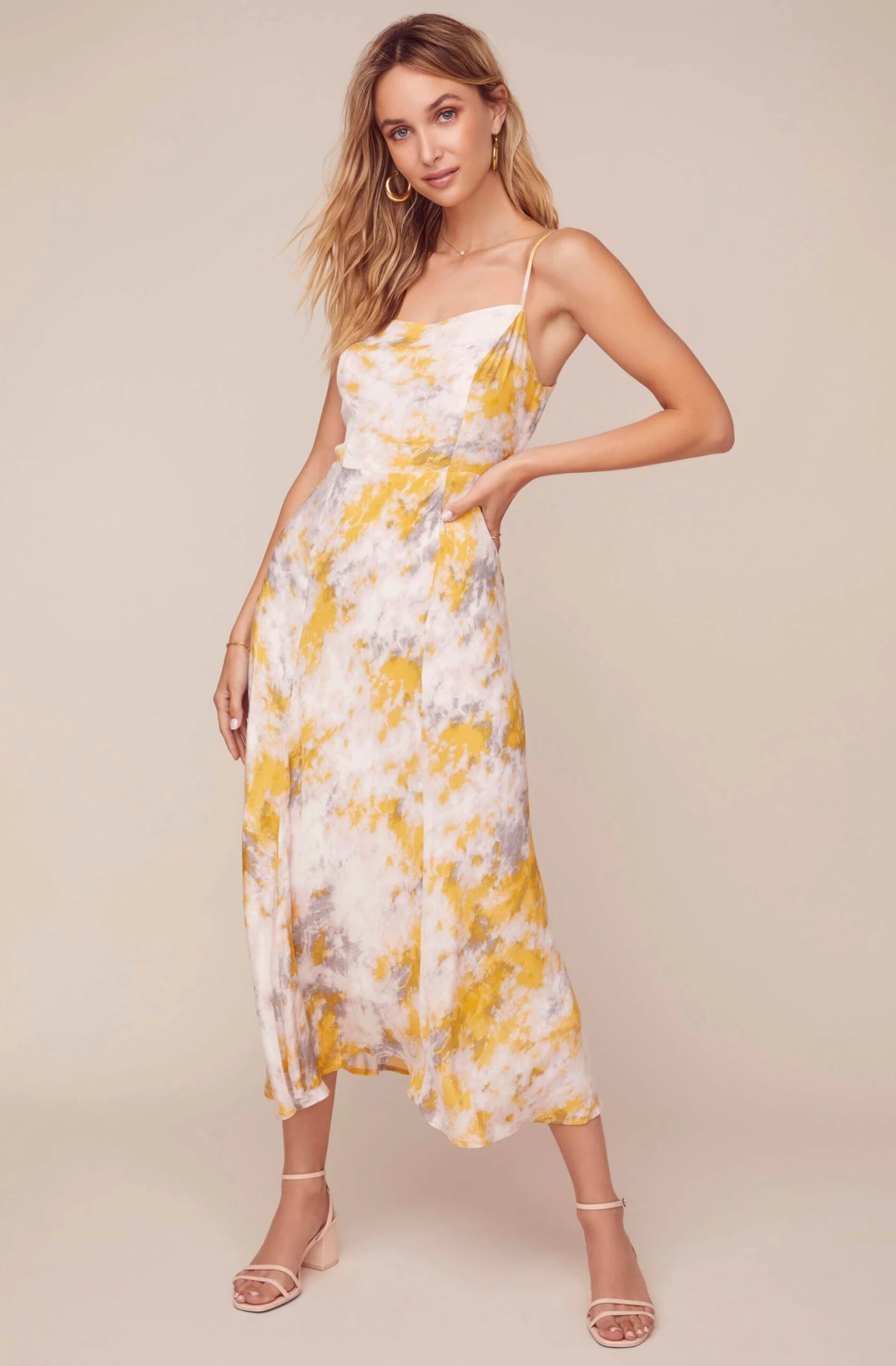 A little zest for your wardrobe featuring the Journey Dress in a lemon tie-dye print! It features a flattering cowl neckline that descends to a fitted bodice and midi-length skirt. Low-cut back.