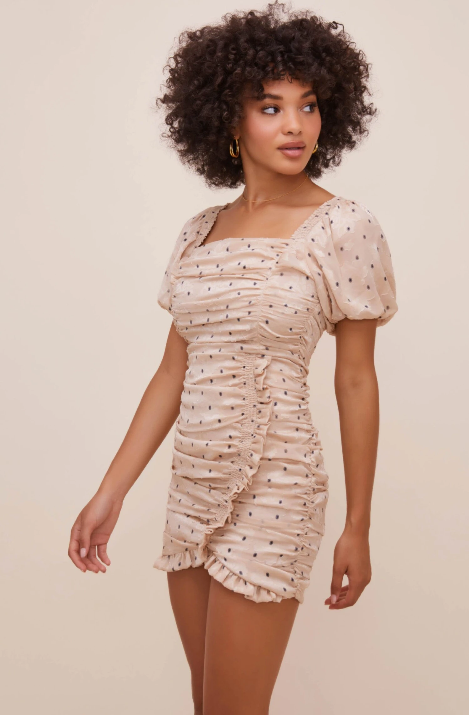 Romance on a new level. The Julianna Dress is a floral jacquard style that features a square neckline, ruched bodice and short puff sleeves. Ruffle trim accent. Polka dot print. Back zip closure.
