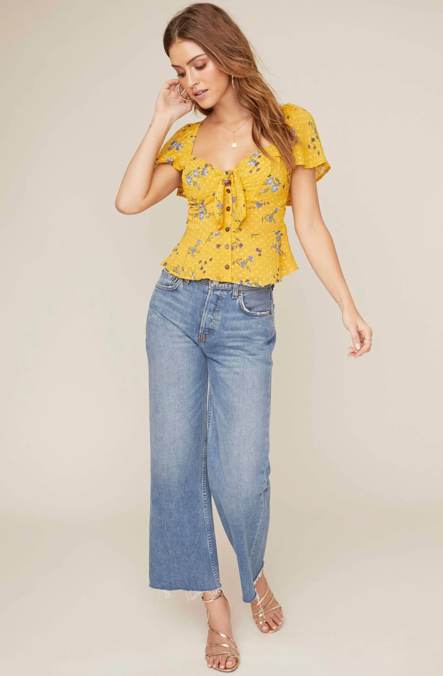 You’re a ray of sunlight! The textured polka dot fabrication embellished with a ditzy floral print throughout the top gives off summer garden vibes. A sweetheart neckline is adorned with a tie front accent and leads down to a flattering seamed bust. Front button placket decorates a slightly flared bodice. Short ruffle…