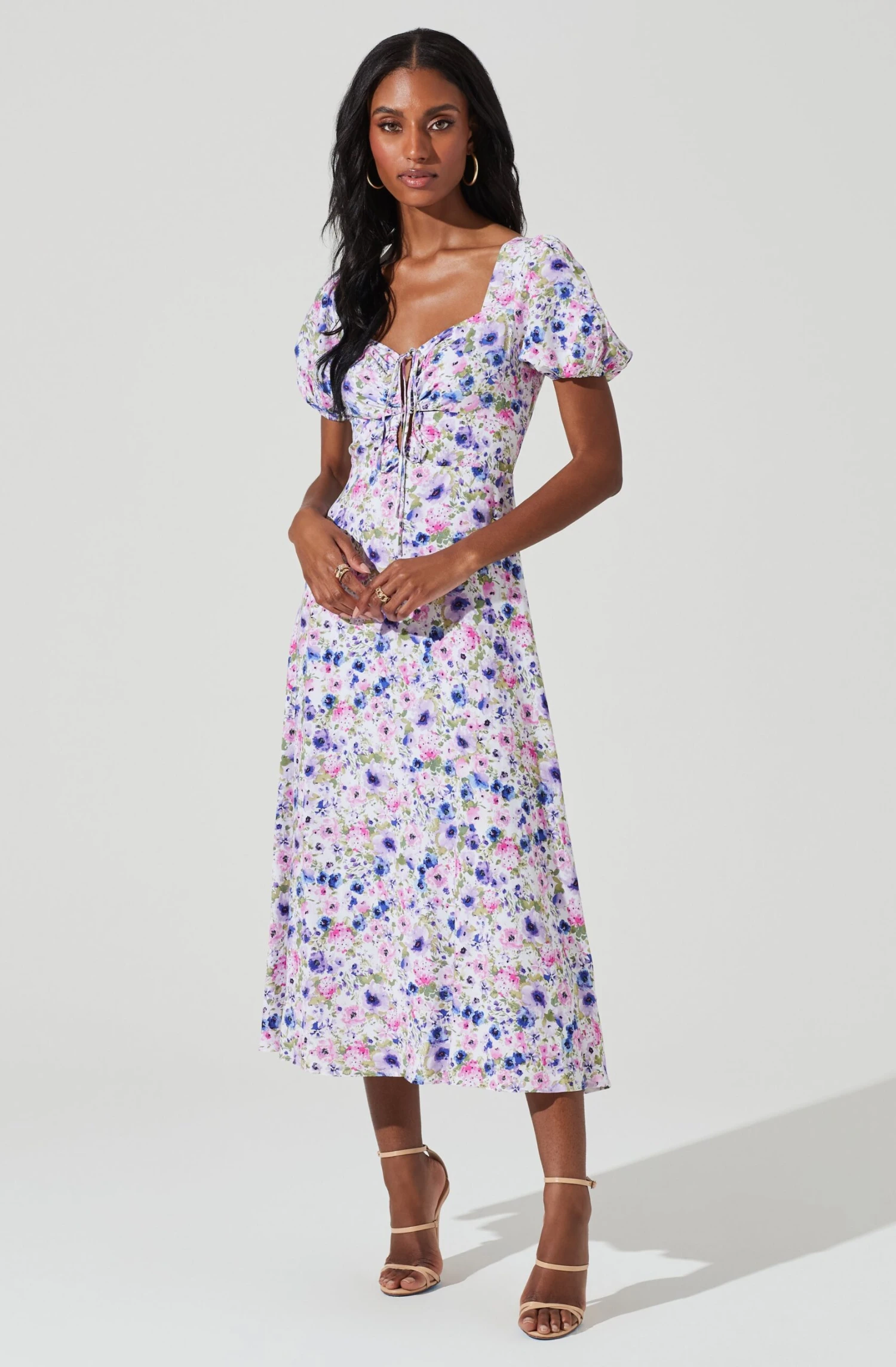 This romantic dress features a sweetheart neckline that leads to a lace up bust with ruching details along the bodice. Flowy A-line midi skirt. Short puff sleeves. Smocked back. Concealed back zip closure. Fully lined.