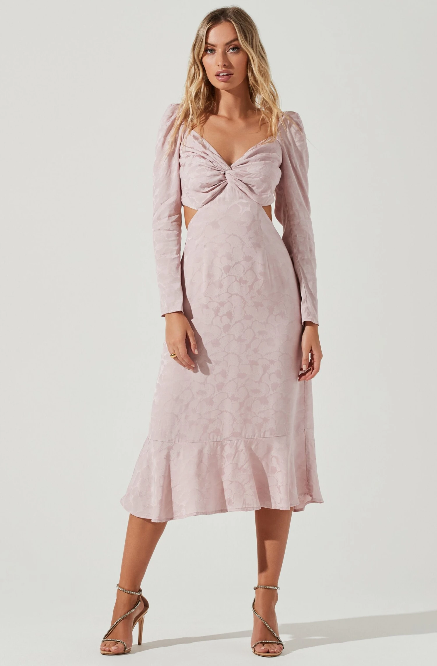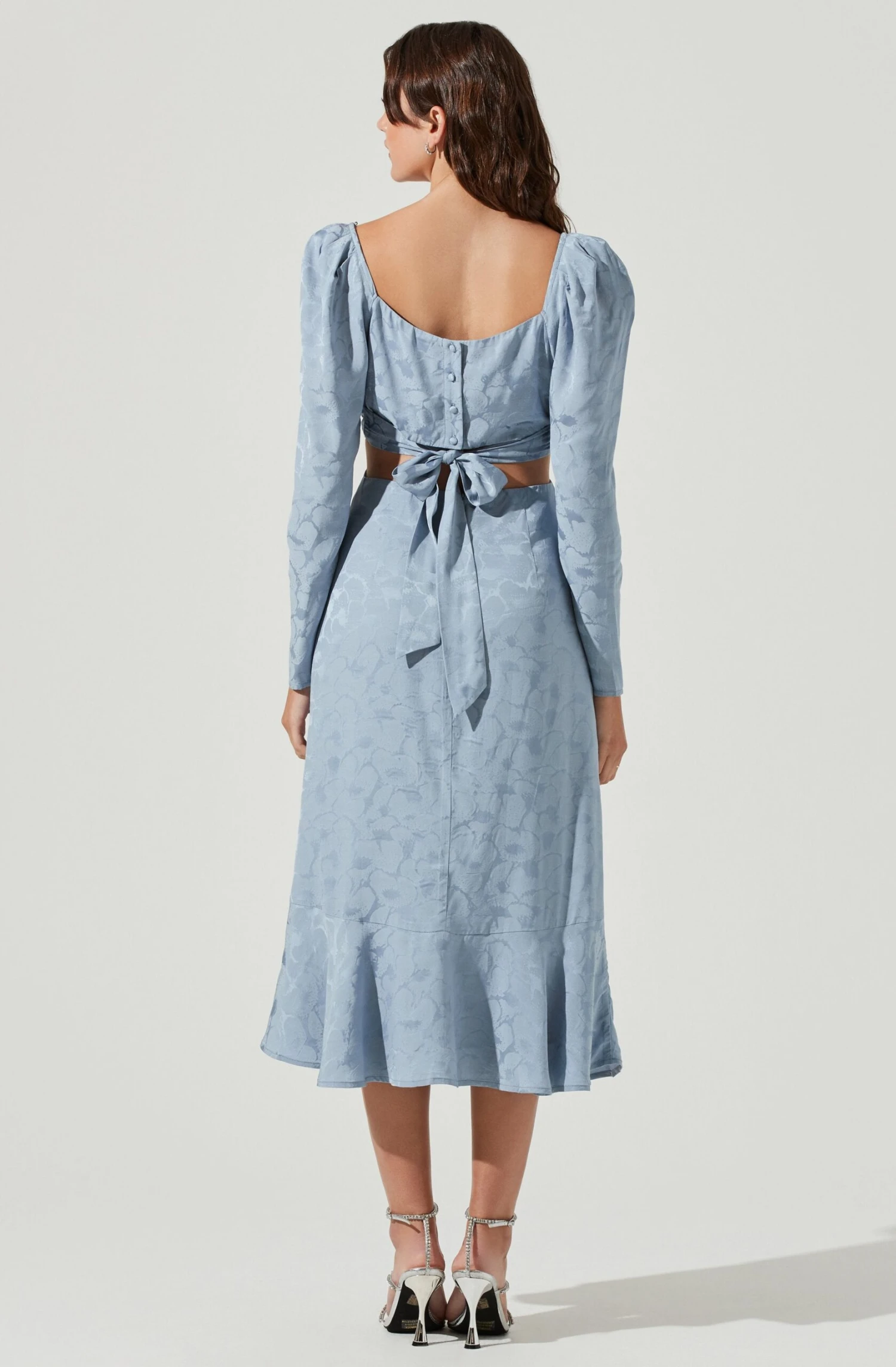 The Lainie Dress has a sweetheart neckline and gathered bust. Cutout accents along the waist and back. Long sleeves with statement shoulders. Midi-length skirt with a ruffle hem. Tie back accent.