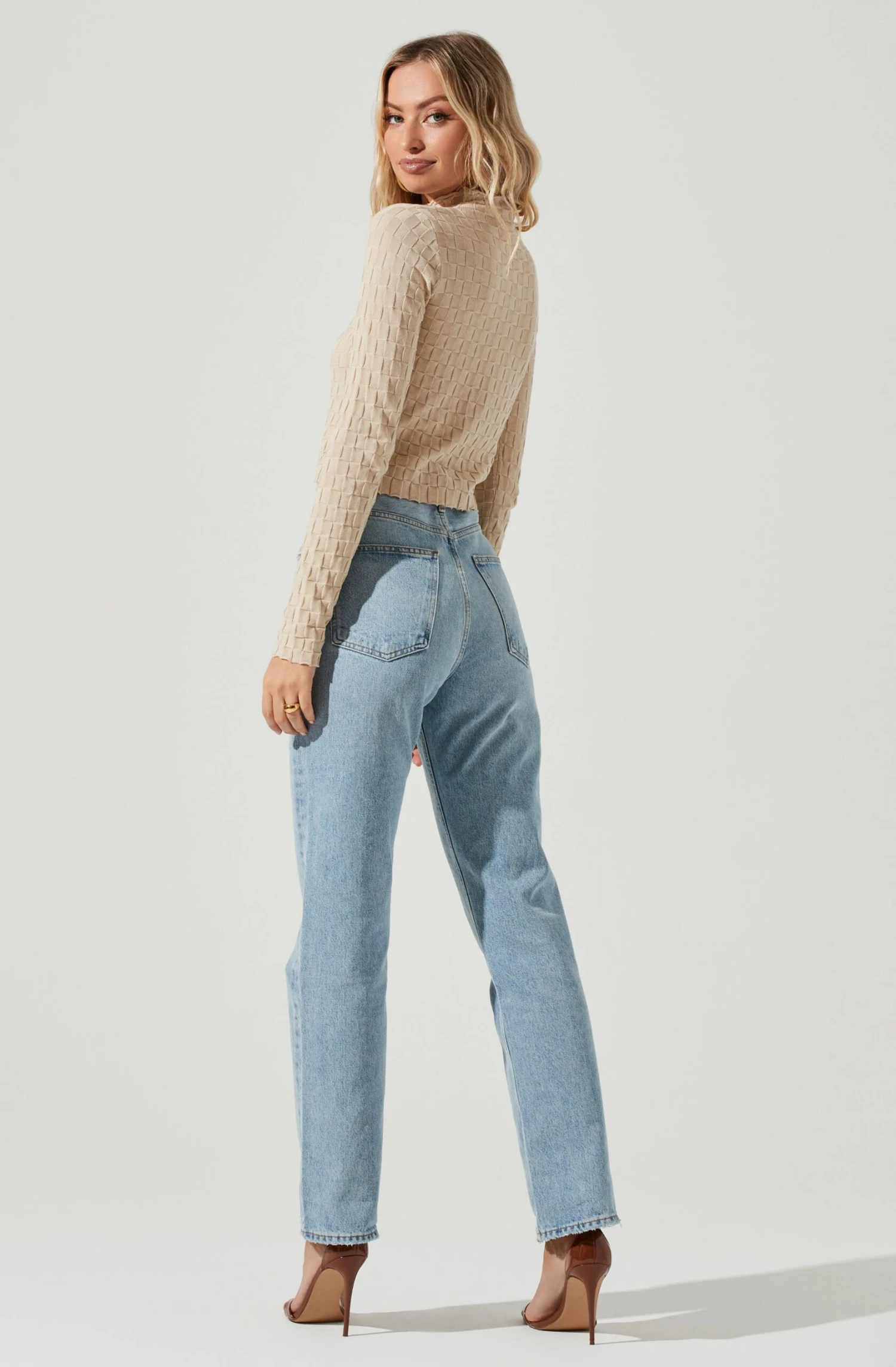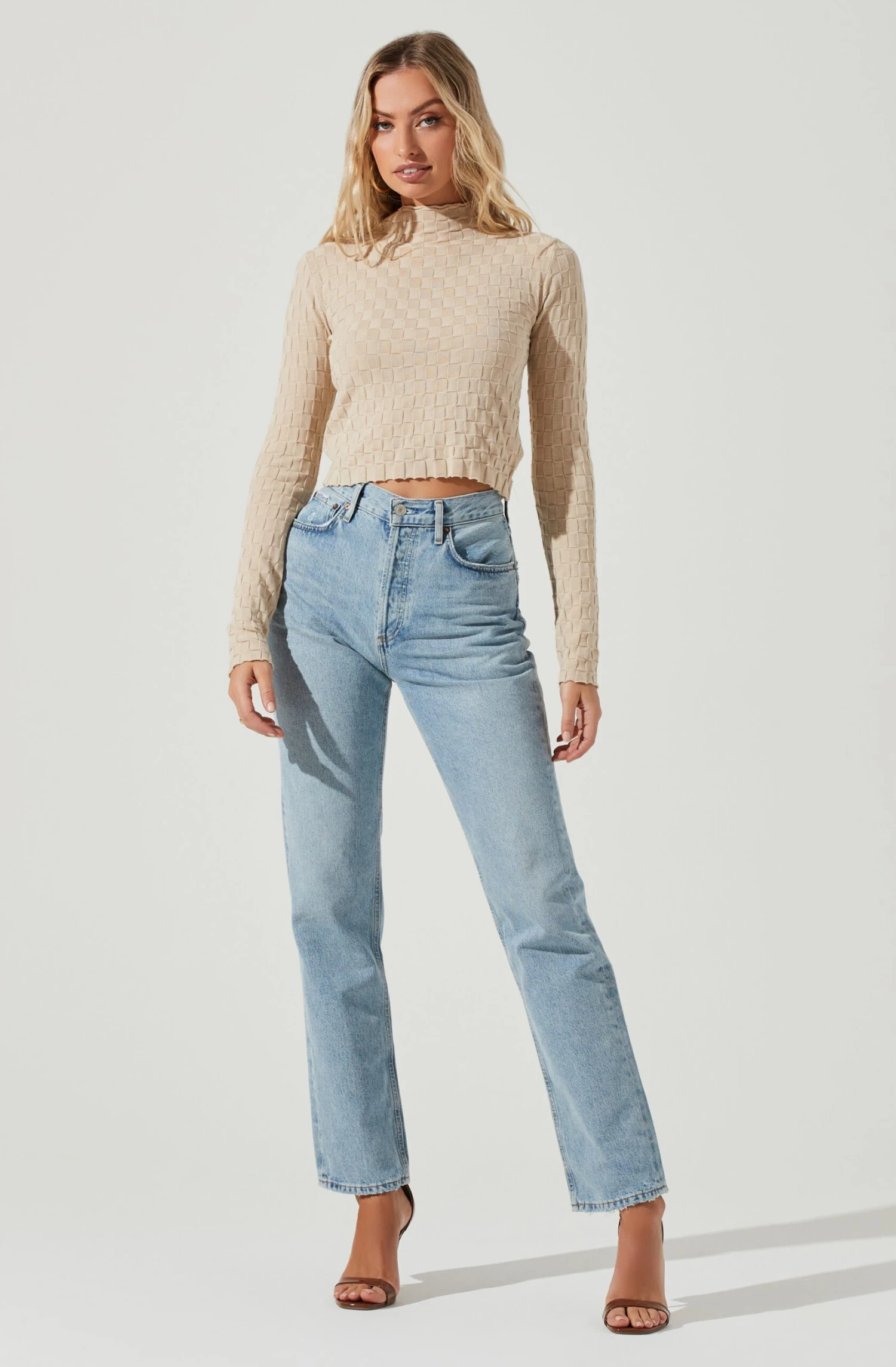 The Lanare Top features a textured checker fabrication with a mock neck, cropped hem and long sleeves. Stretch material.