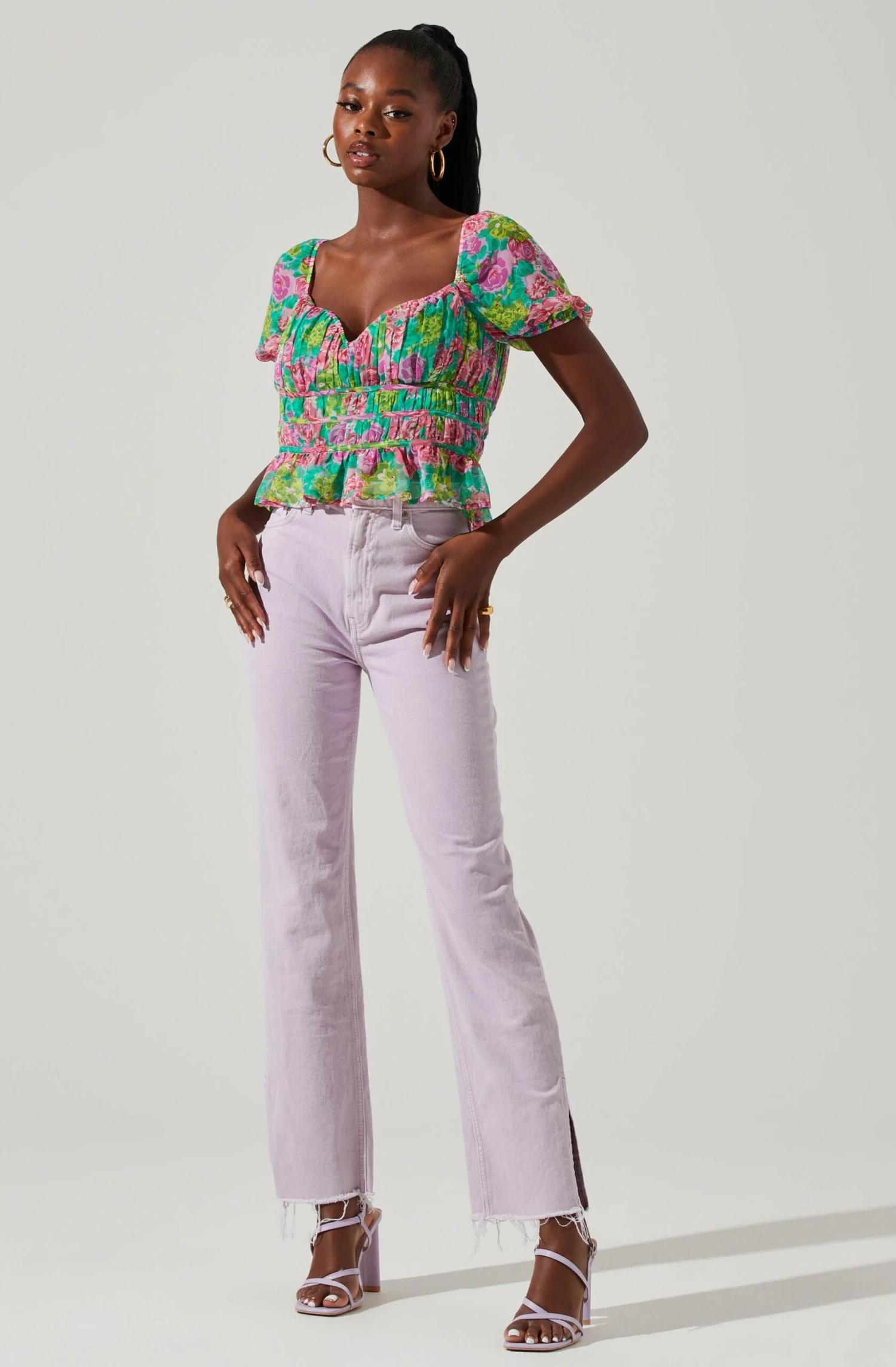 The Leigh Top features a soft floral print that emanates romance. Sweetheart neckline leads to a pleated front and cinched waist. Smocked back features tying straps at the back. Short puff sleeves.