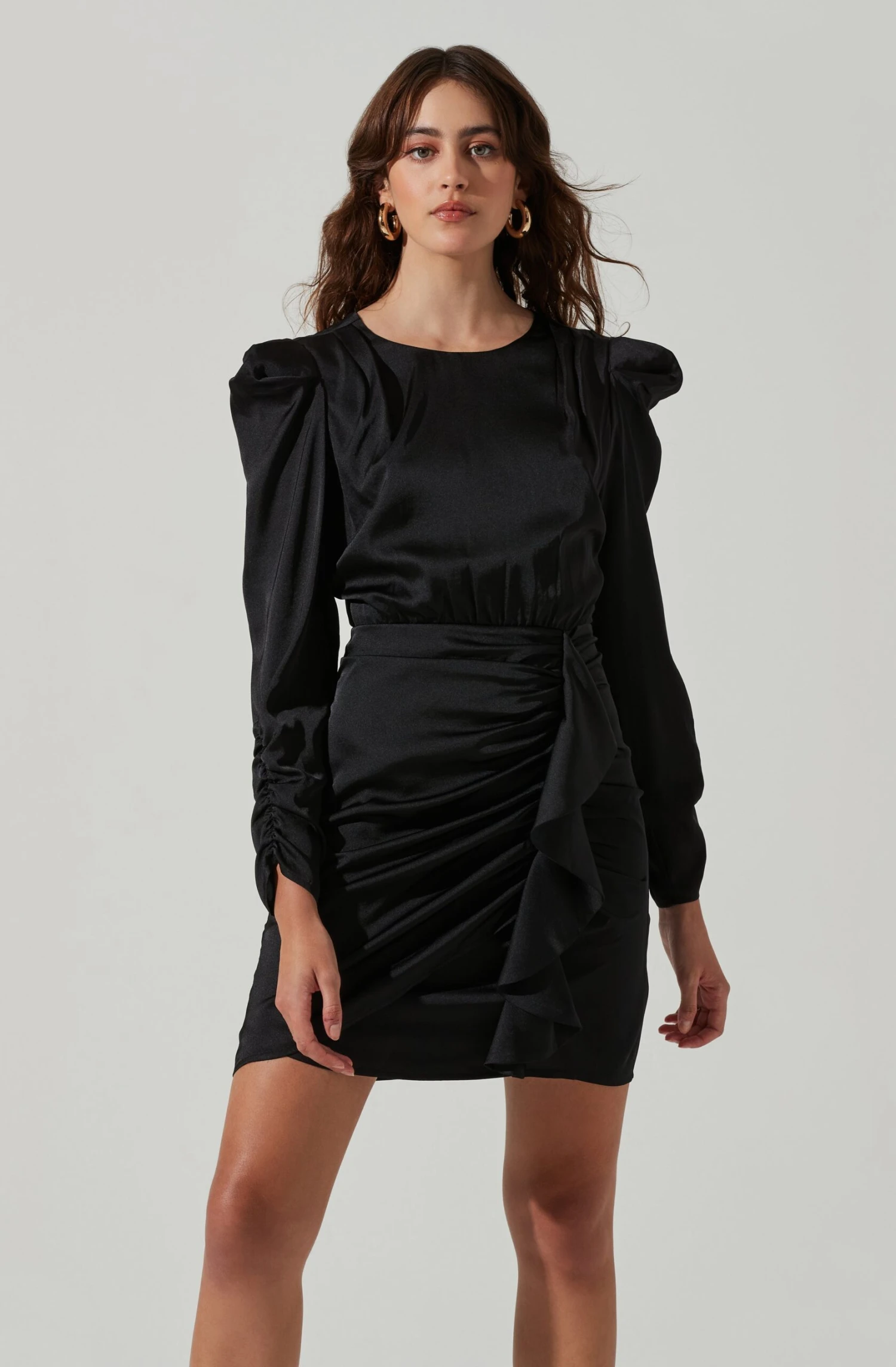 This satin dress features a ruffle mini skirt and long ruched sleeves. Open back. Concealed back zip closure.