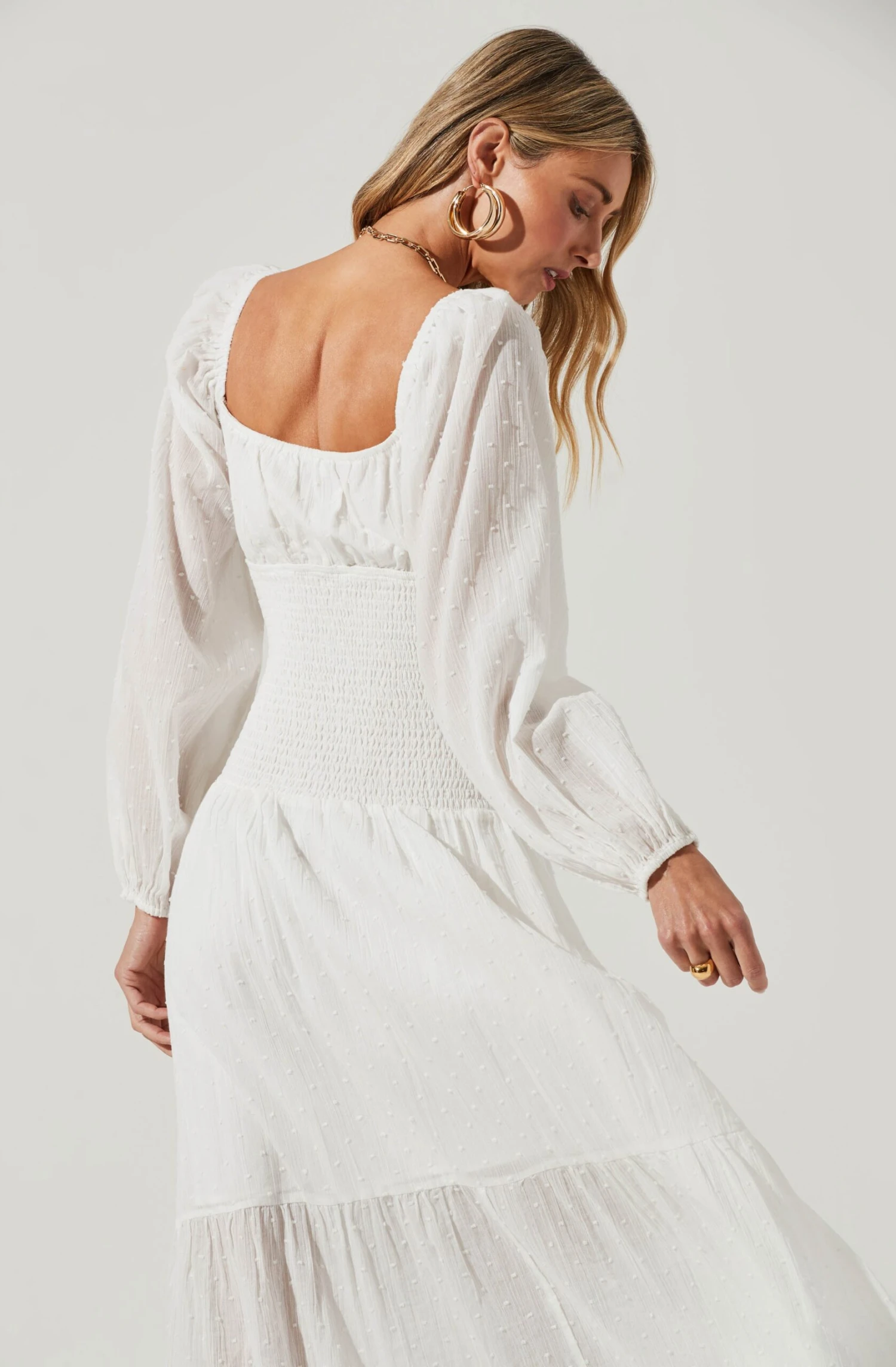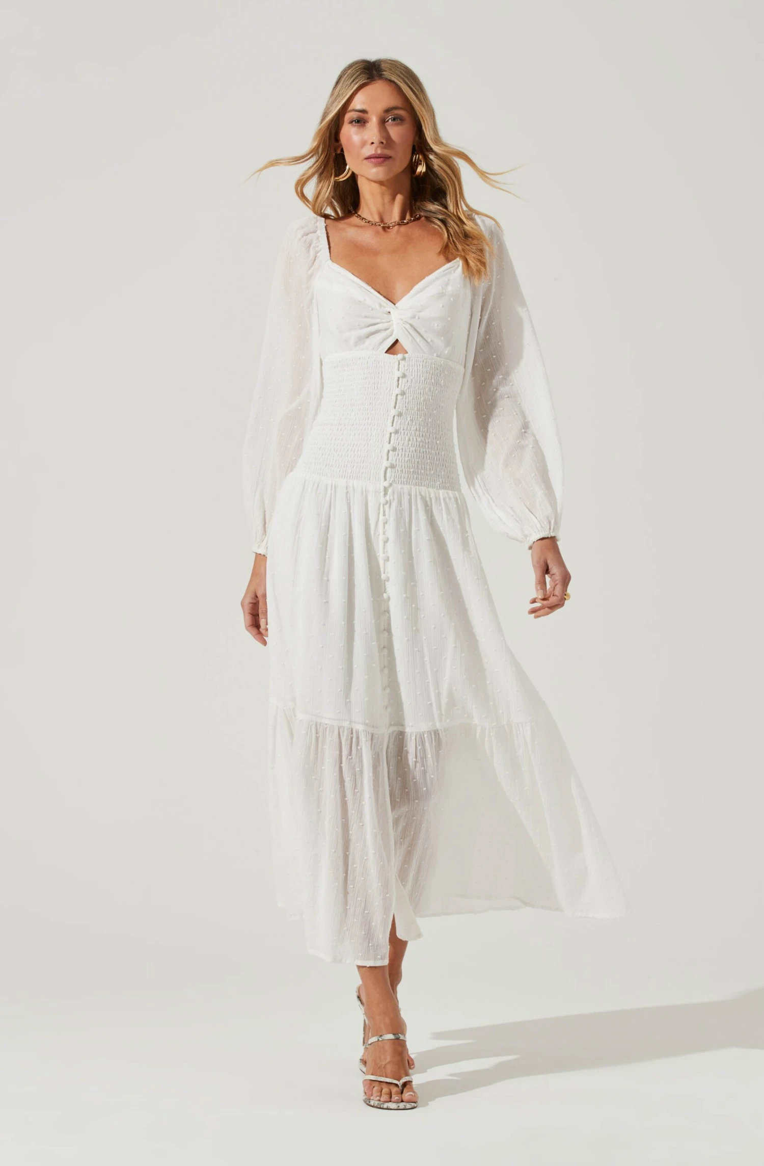 Prepare to step into spring with a brighter point of style. This dress features a sweetheart neckline that leads to a twist front with a cutout detail. Smocked bodice with a front button placket. Tiered midi skirt. Partially lined. Long puff sleeves.