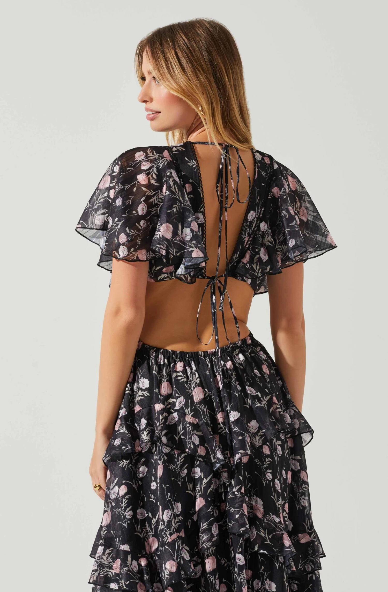Cutout details add an unexpected twist to our Lucy Maxi Dress, designed with an all-over floral print against a dark background. Together, fluttery sleeves and tiered ruffles capture a graceful sense of motion. A standout style for special occasions or date night.