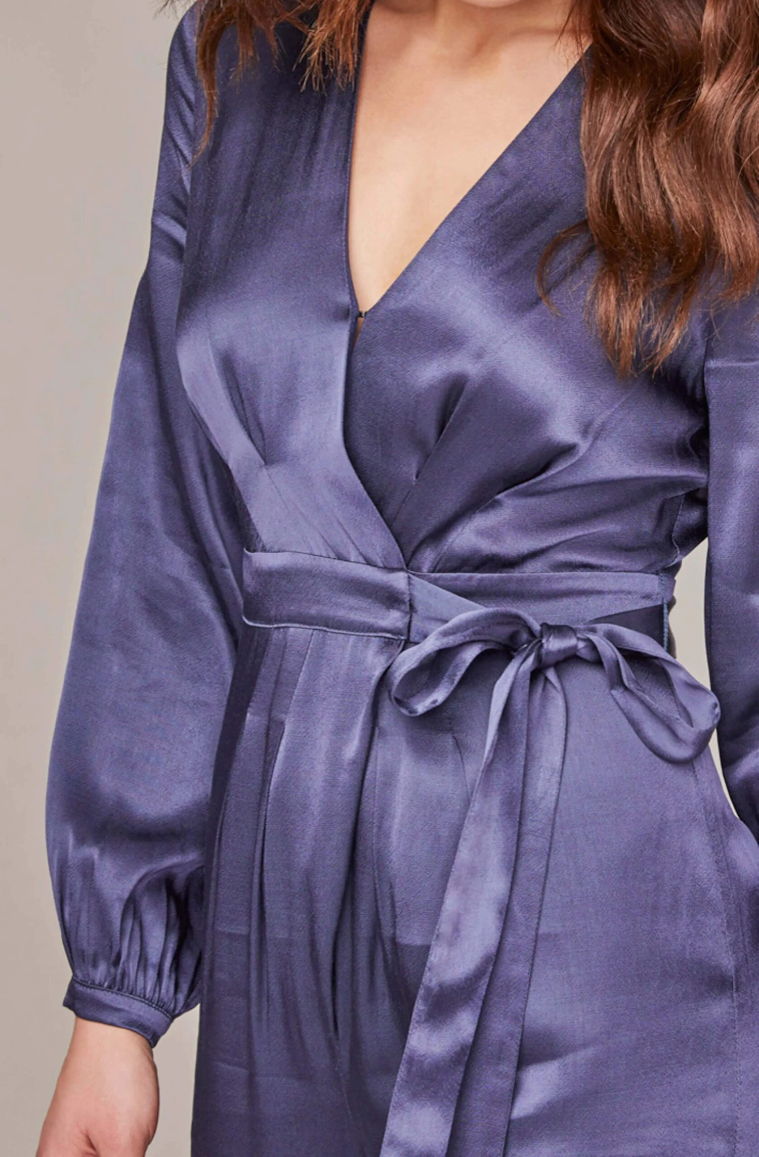 You’re a satin daydream. Soft and dreamy jumpsuit with a plunge neckline, tie waist accent and cropped wide leg bottoms. Long sleeves.