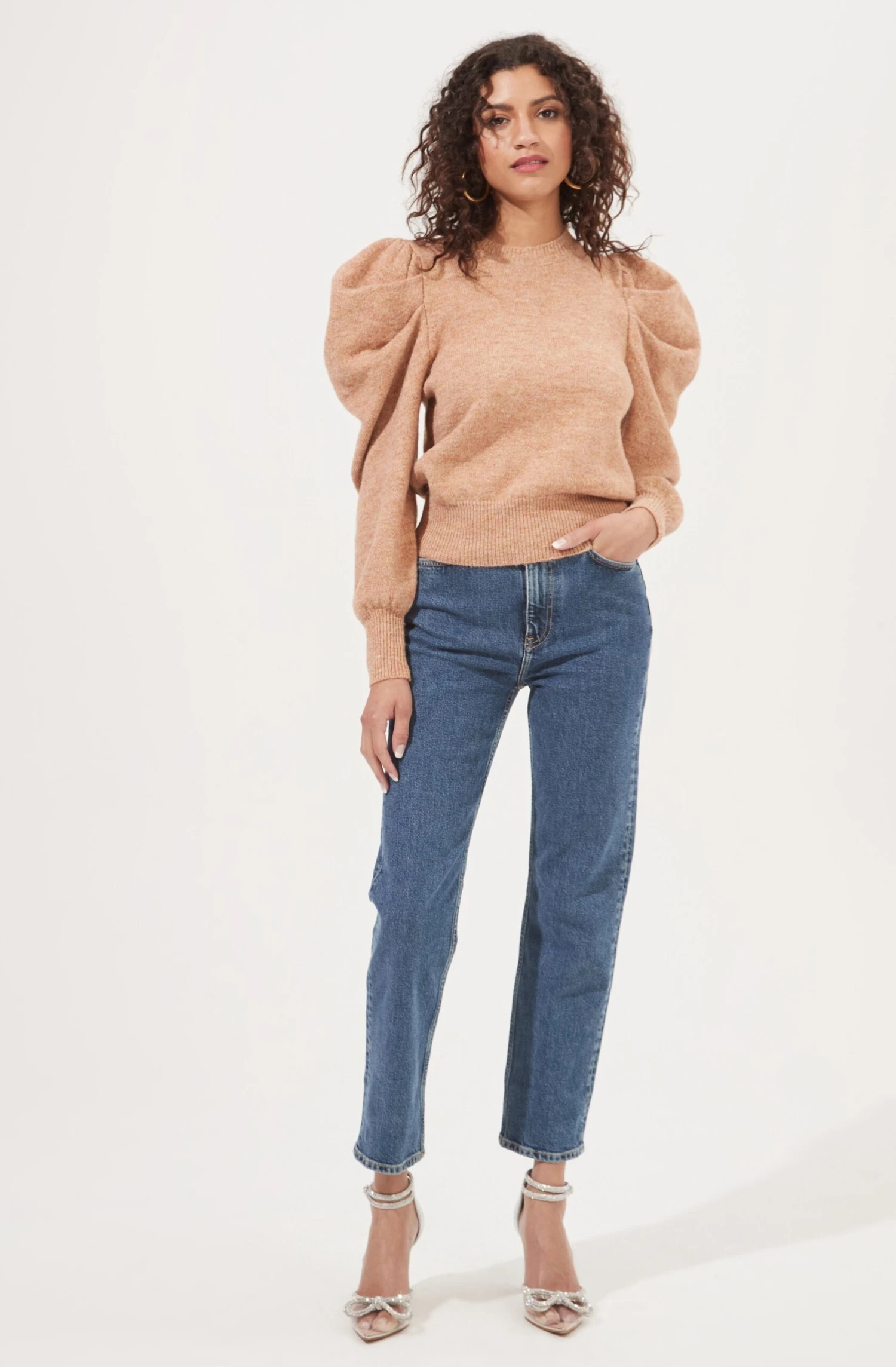 Add some shine! The Nicola Sweater features a metallic finish, crew neckline and exaggerated puff sleeves. Relaxed fit.