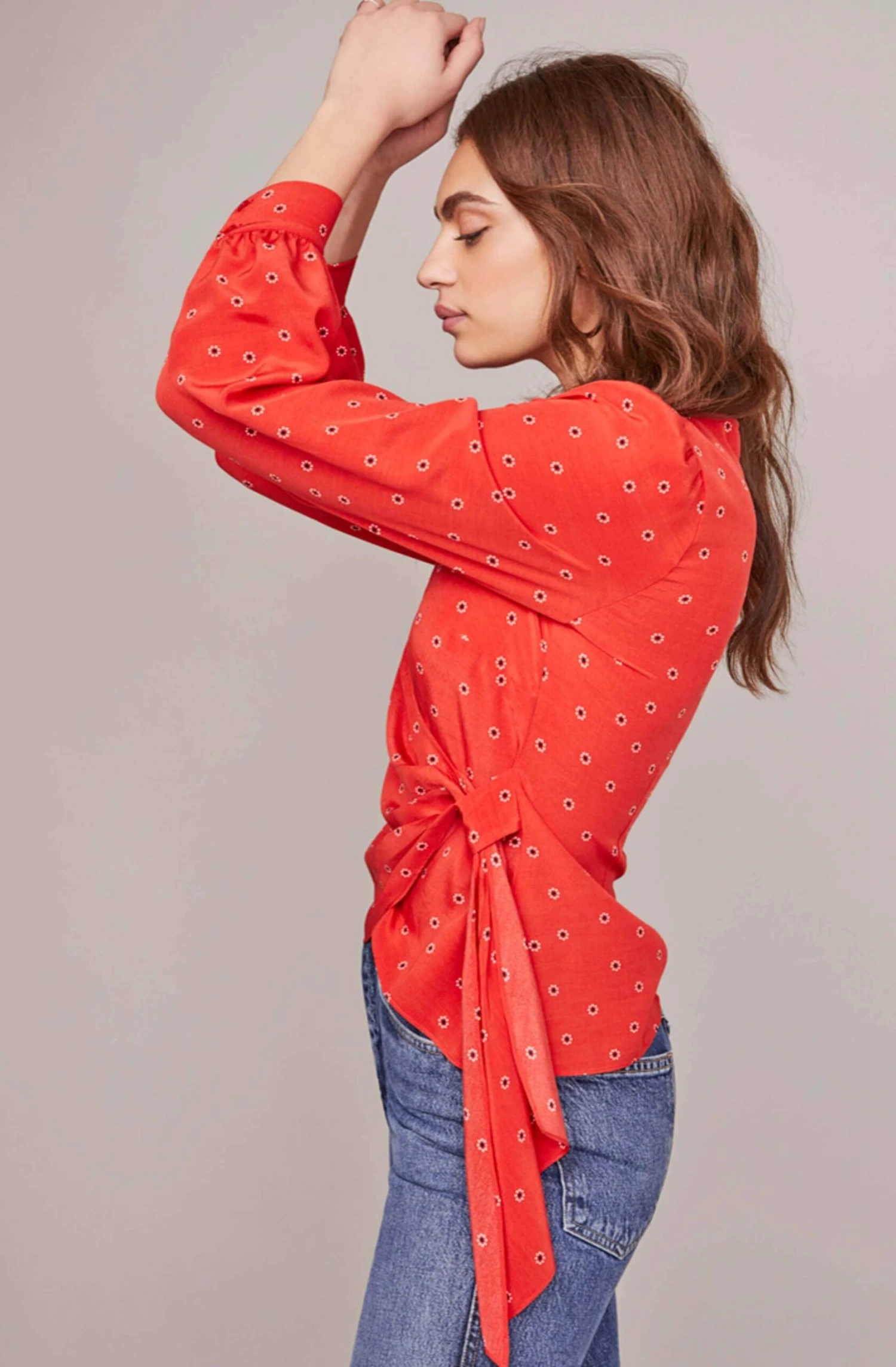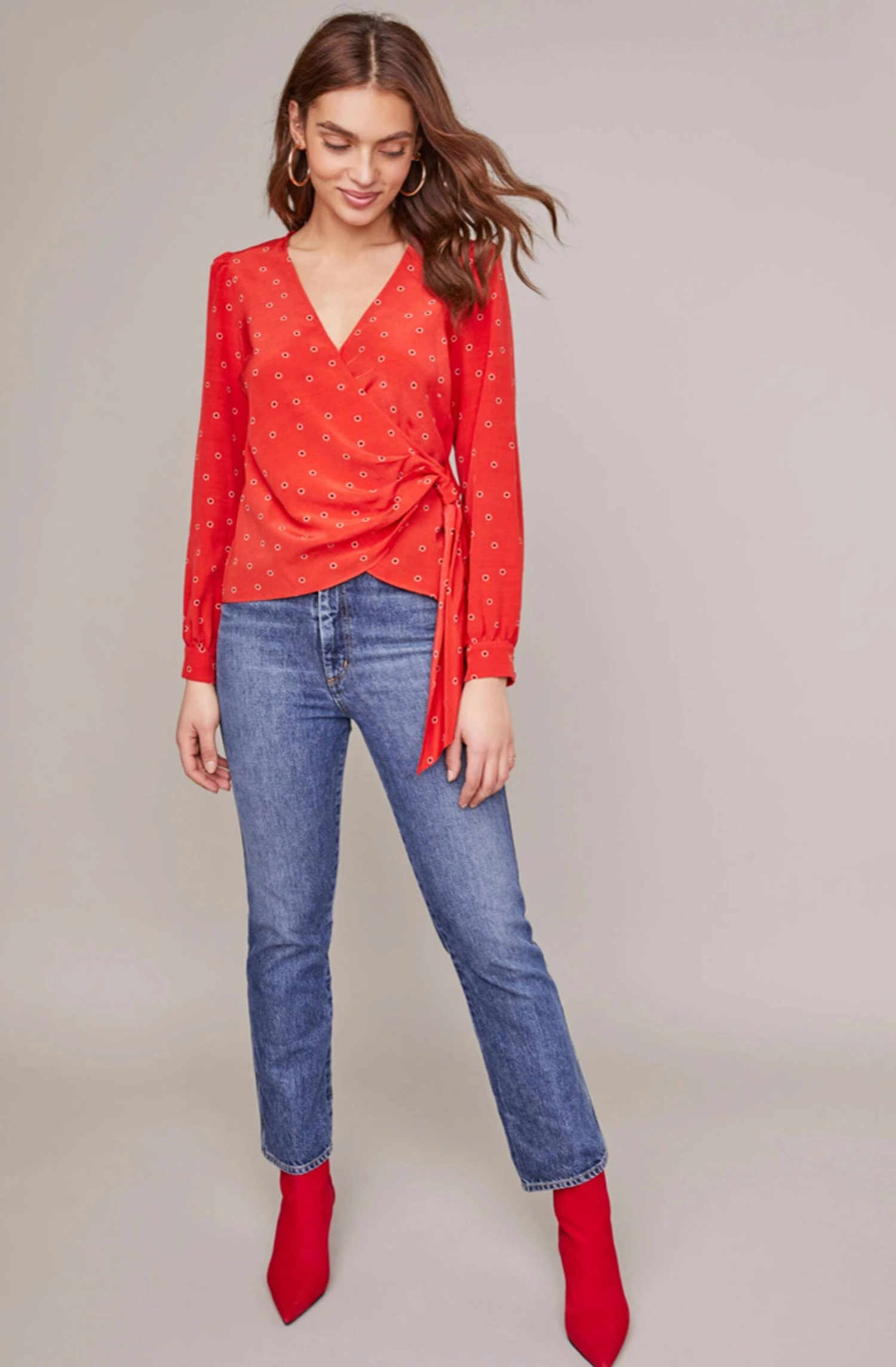 With a classic yet modern touch, this top pairs perfectly with your favorite pair of jeans! This effortless style features a V neckline that descends to a wrap front and side tie accent. Long cuffed sleeves. Statement dot print throughout.