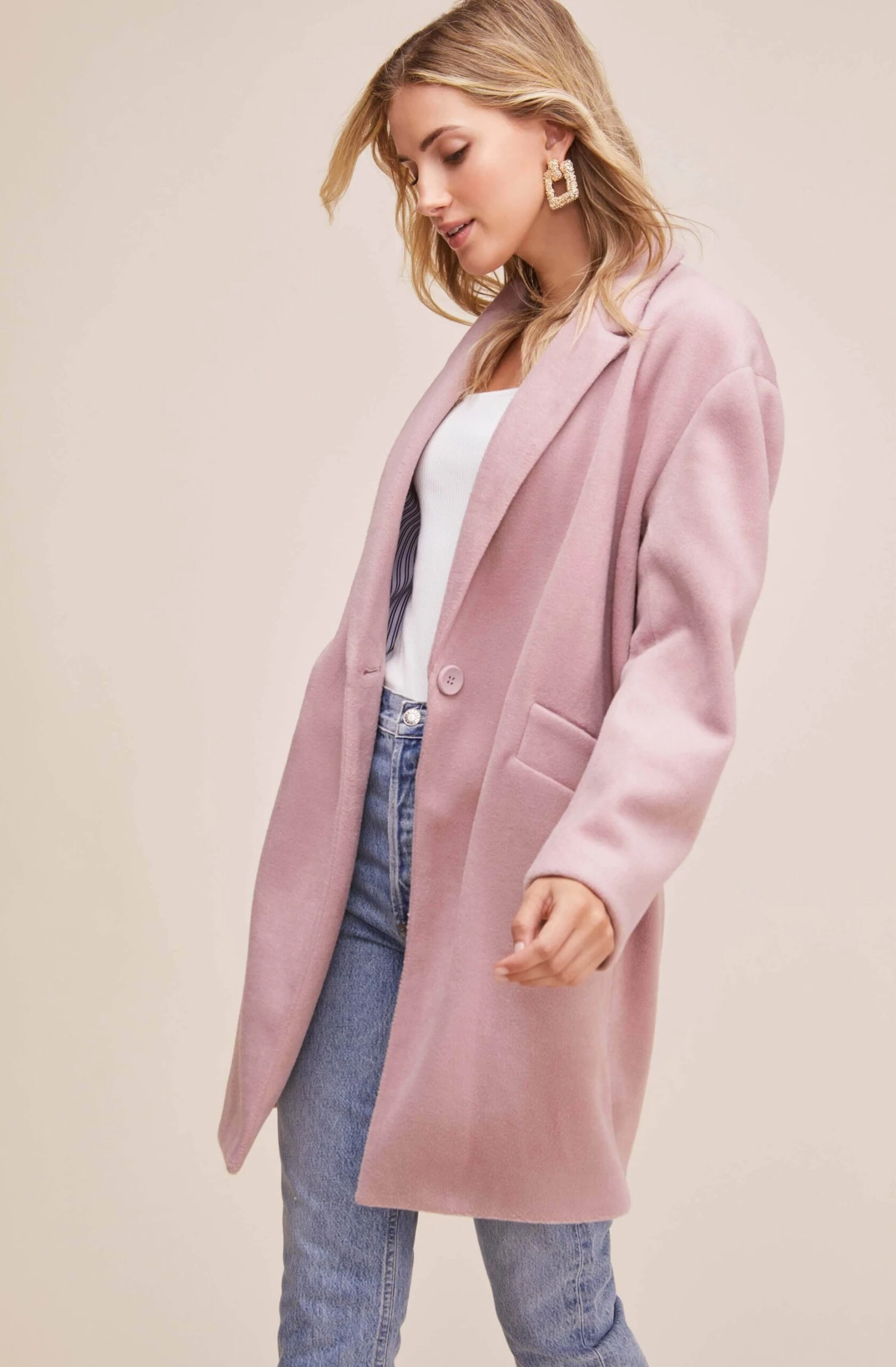 Bundle up! This no-fail topcoat features a notched lapel, single-button closure and slanted hip pockets. Slight oversized fit for ultimate coziness.