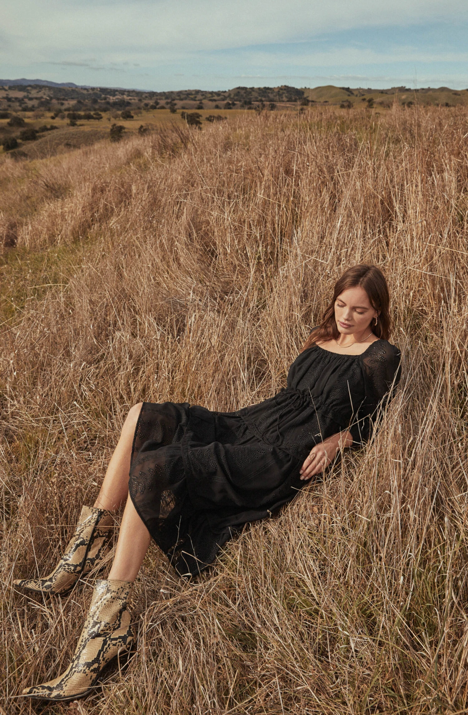 Style is in your favor. The Padma dress features a square neckline that leads to a cinched waist and tiered midi skirt. Long sheer sleeves.