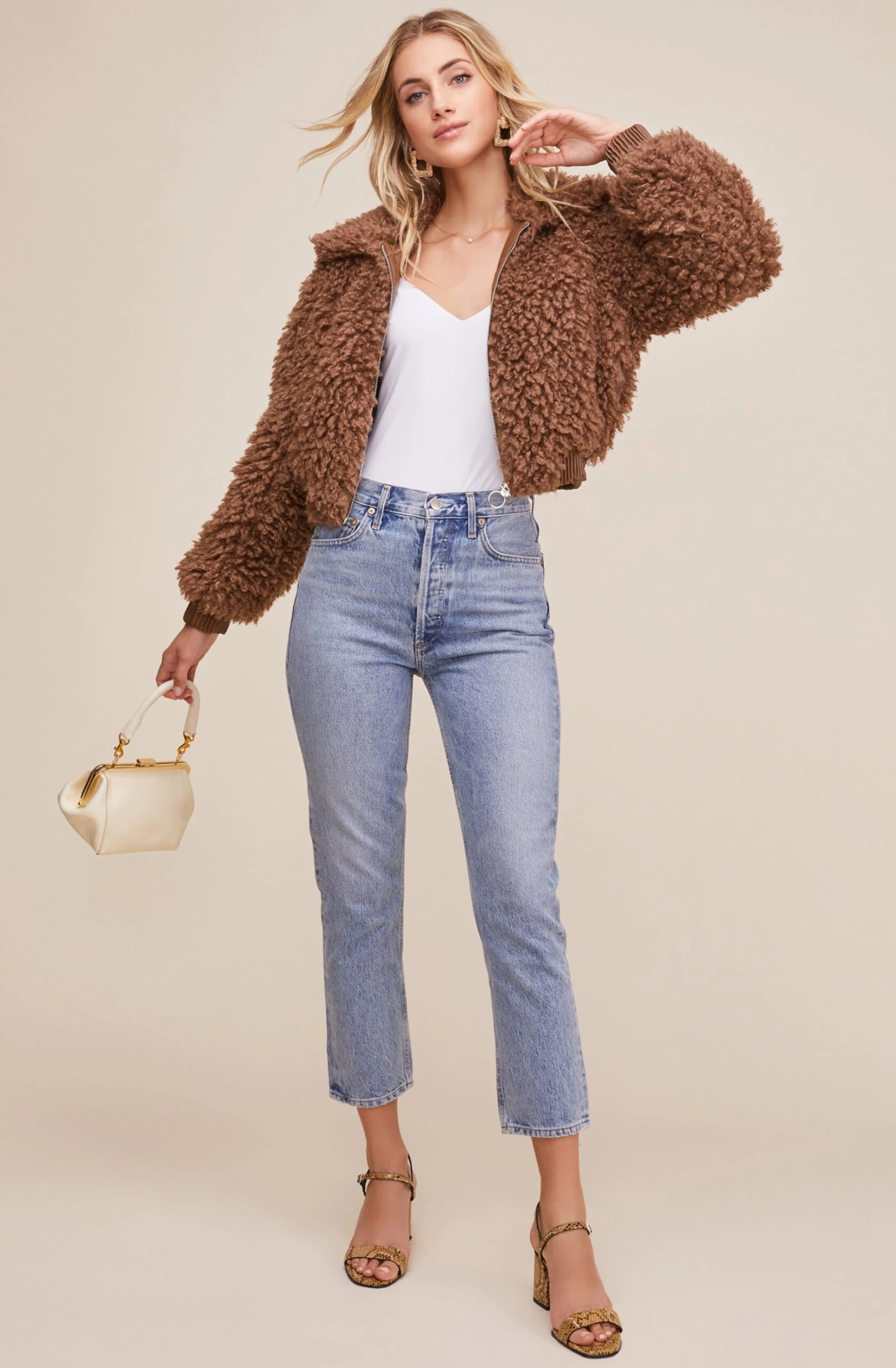 Warm up this winter with some faux fur. This ultra-flattering crop jacket features a pointed collar, front zip closure and long sleeves. Side flap pockets. Finished seams.