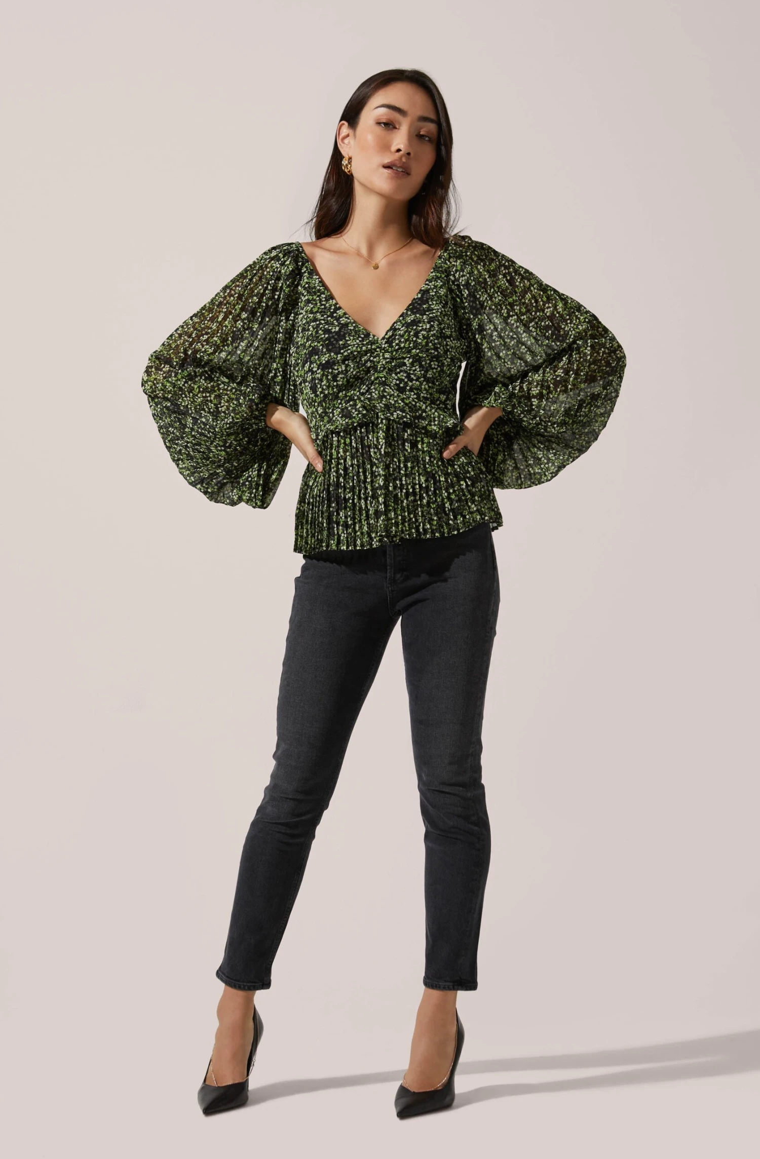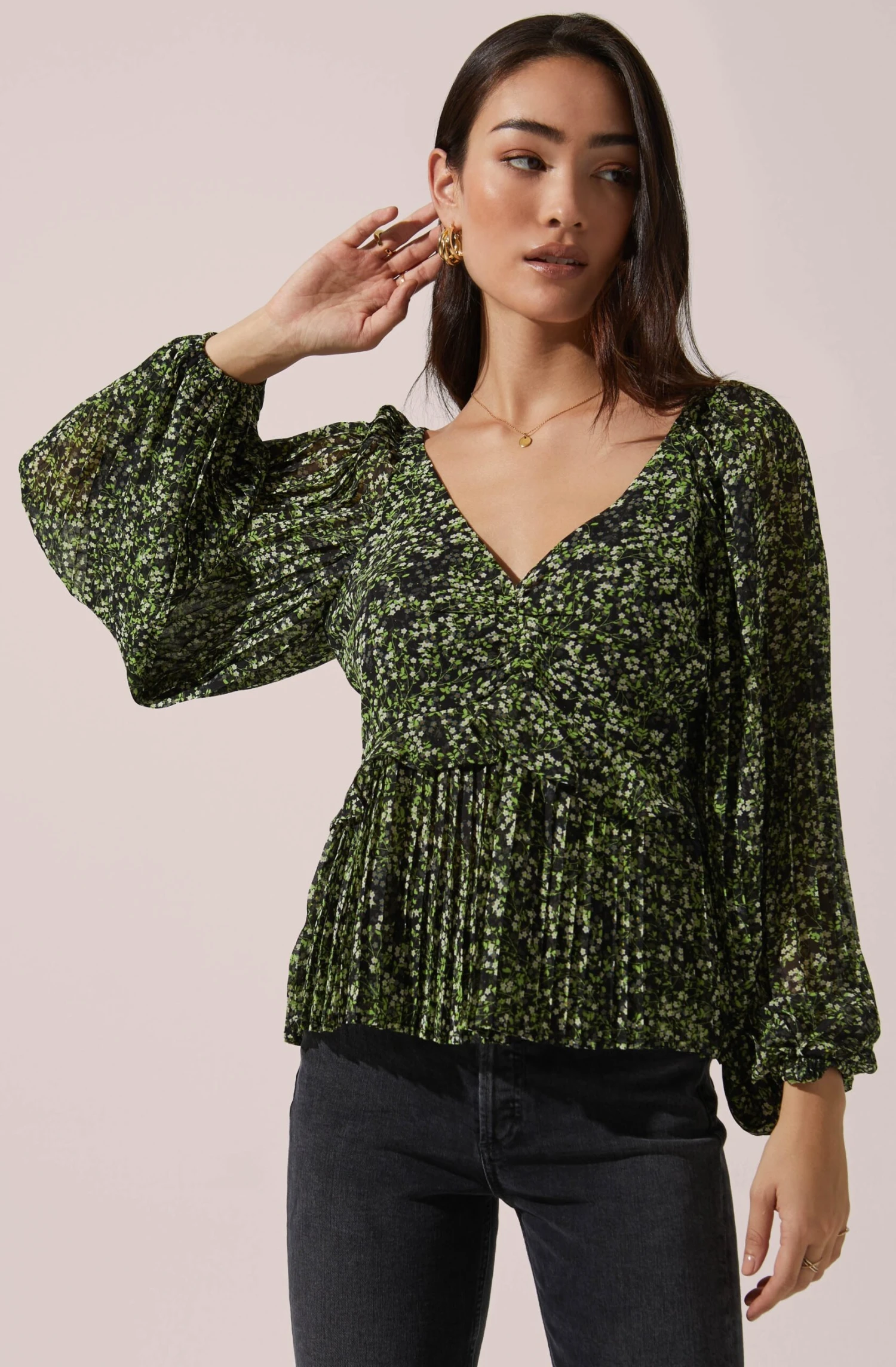 An elevated plisse top that features a V neckline and descends to a peplum hem. Long puff sleeves.