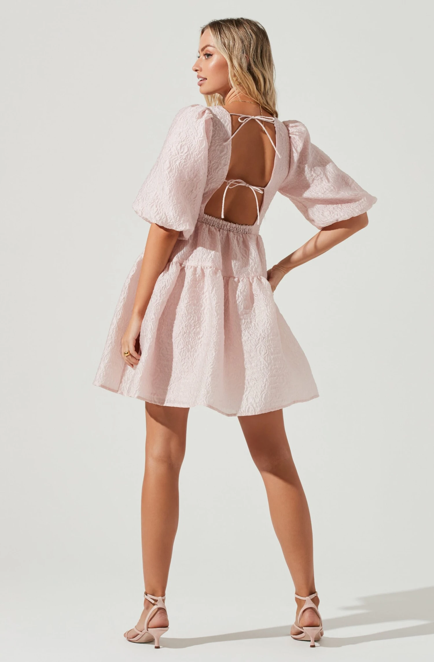 Just like royalty. The Principessa Dress features a square neckline that leads to a tiered mini skirt. Cutout back with self-tie straps. Short bubble sleeves.