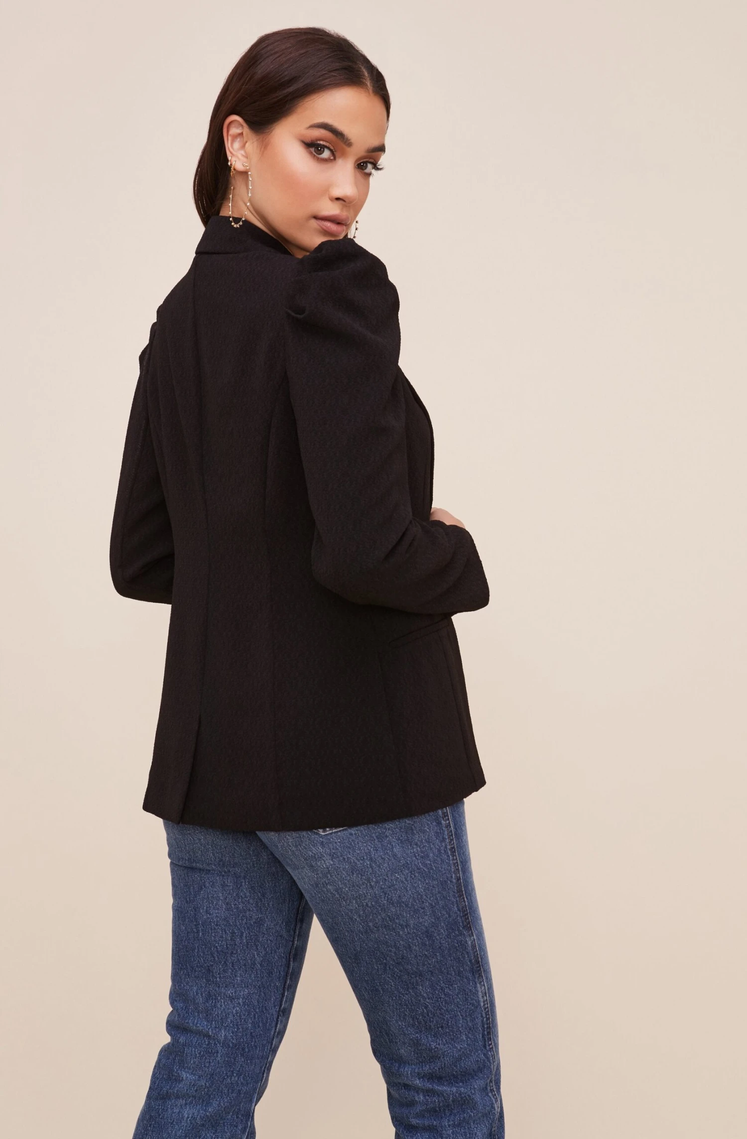 Blazers are more than just wear-at-the-office essentials. This elevated style features a notched lapels that descends to a buttoned front. Twin flap pocket accents. Long puff sleeves make a statement. Back vent.