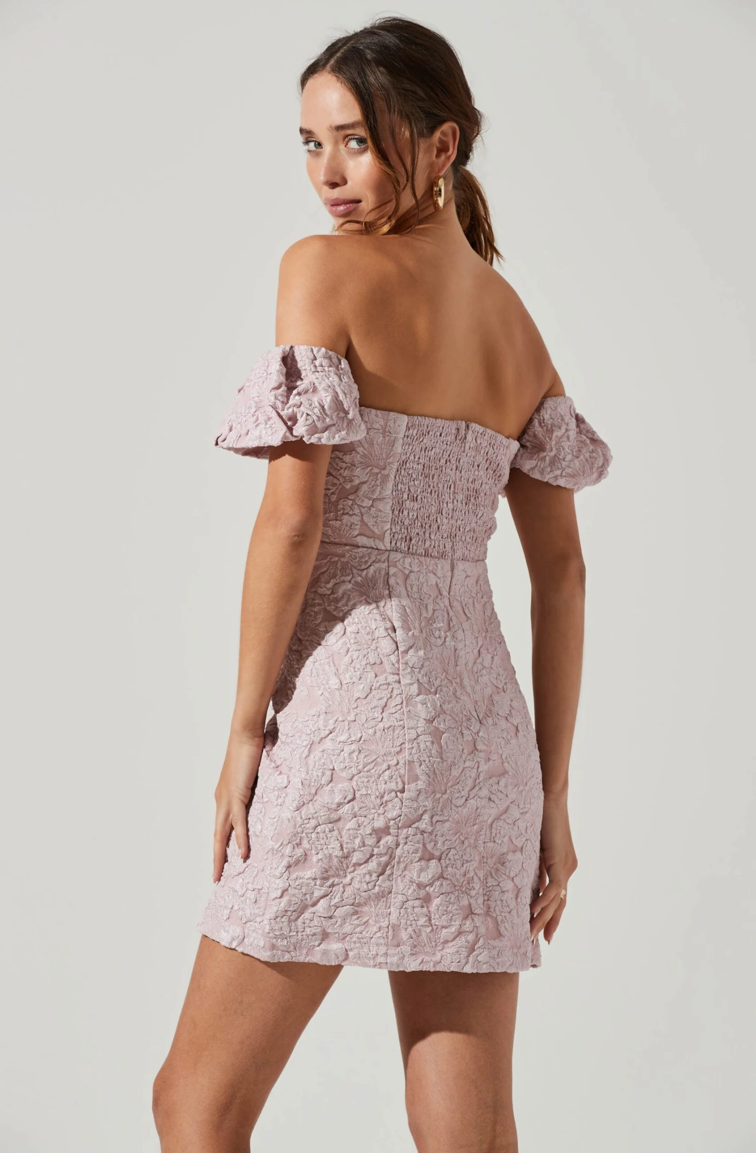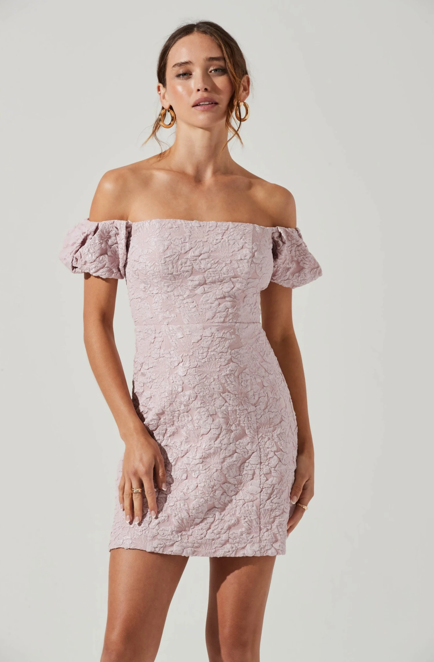 The Raina Dress features a classic jacquard fabrication perfect for special occasions. Off shoulder neckline leads to short puff sleeves. Bodycon silhouette. Smocked back.