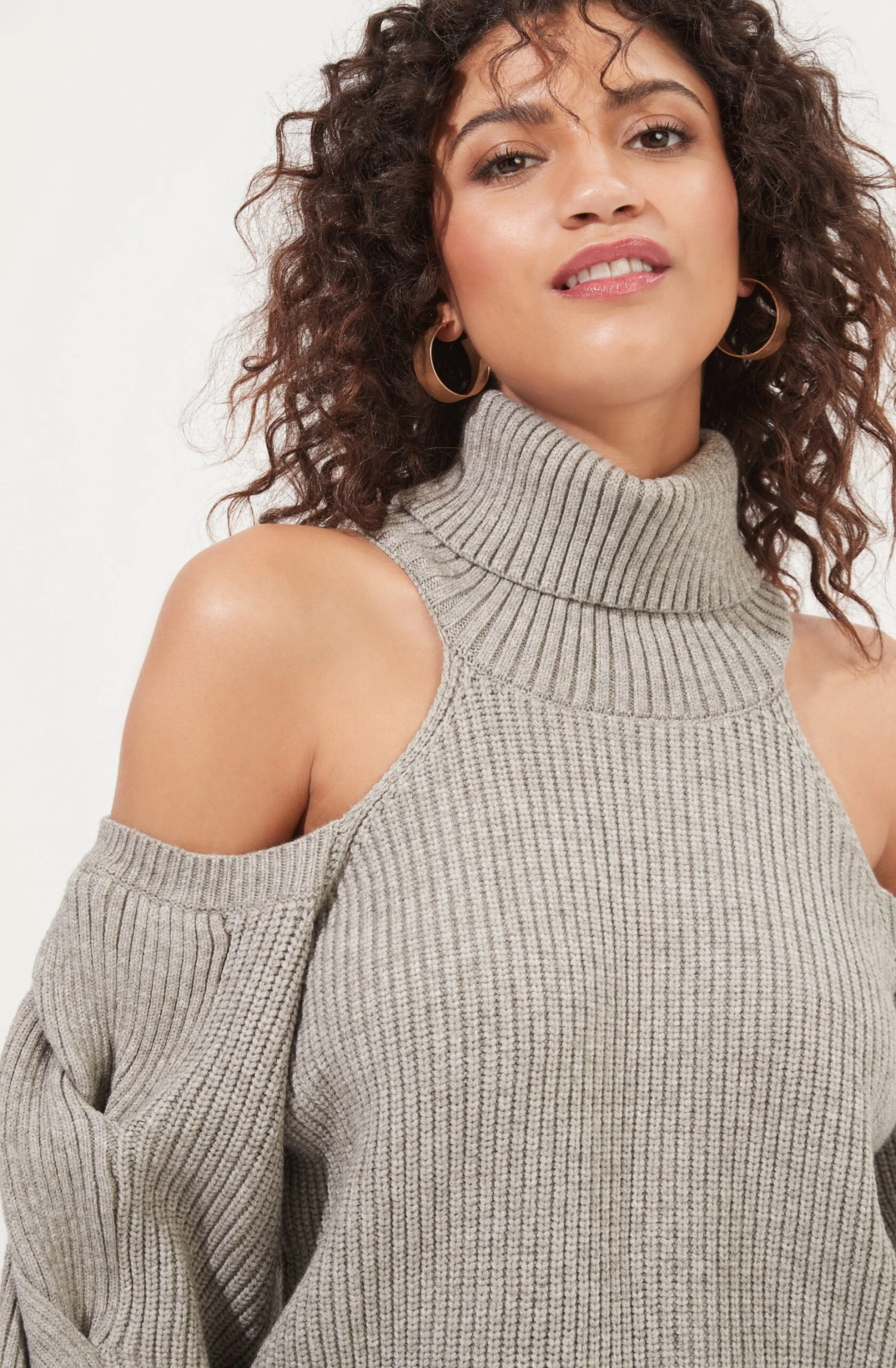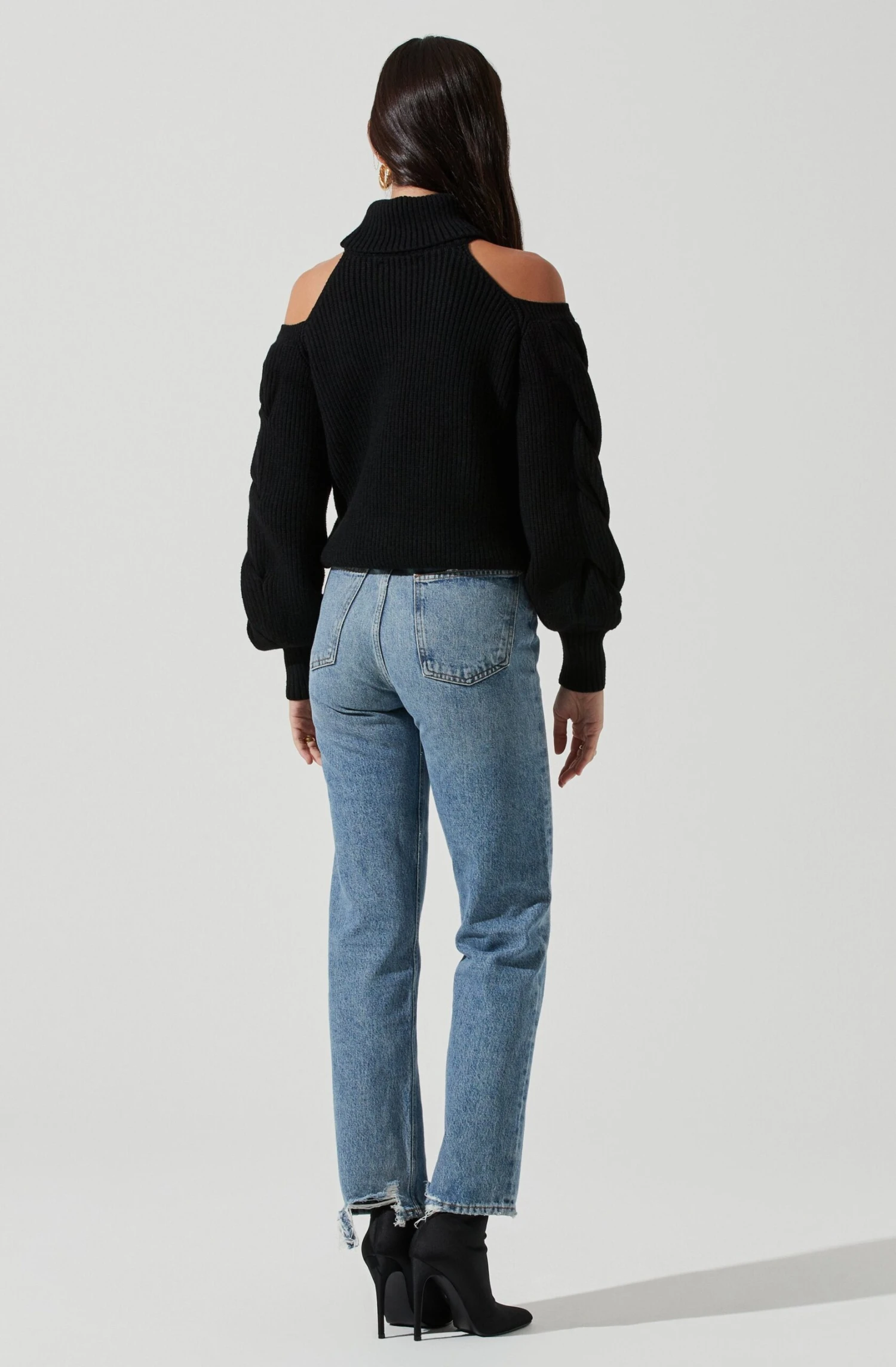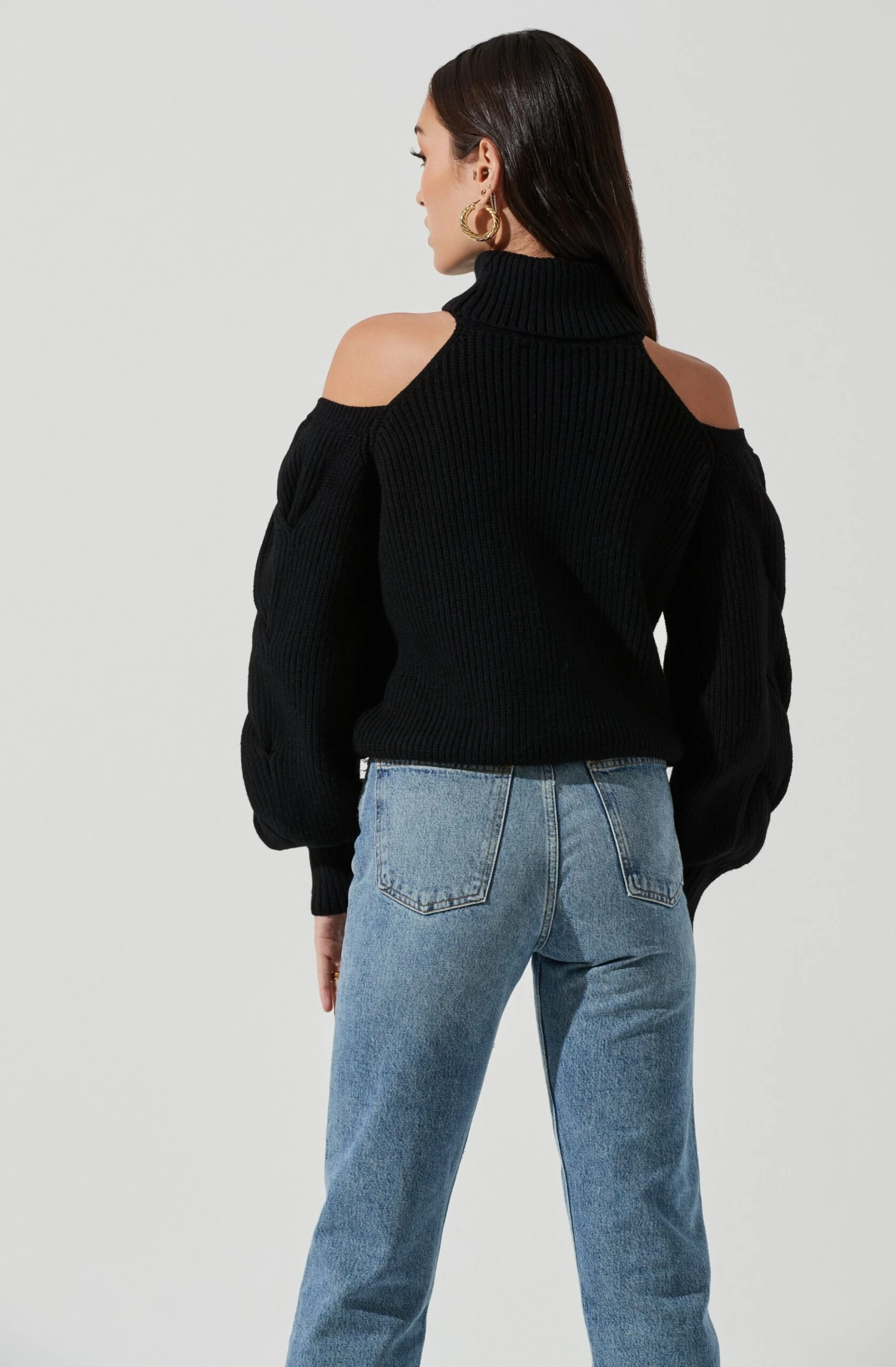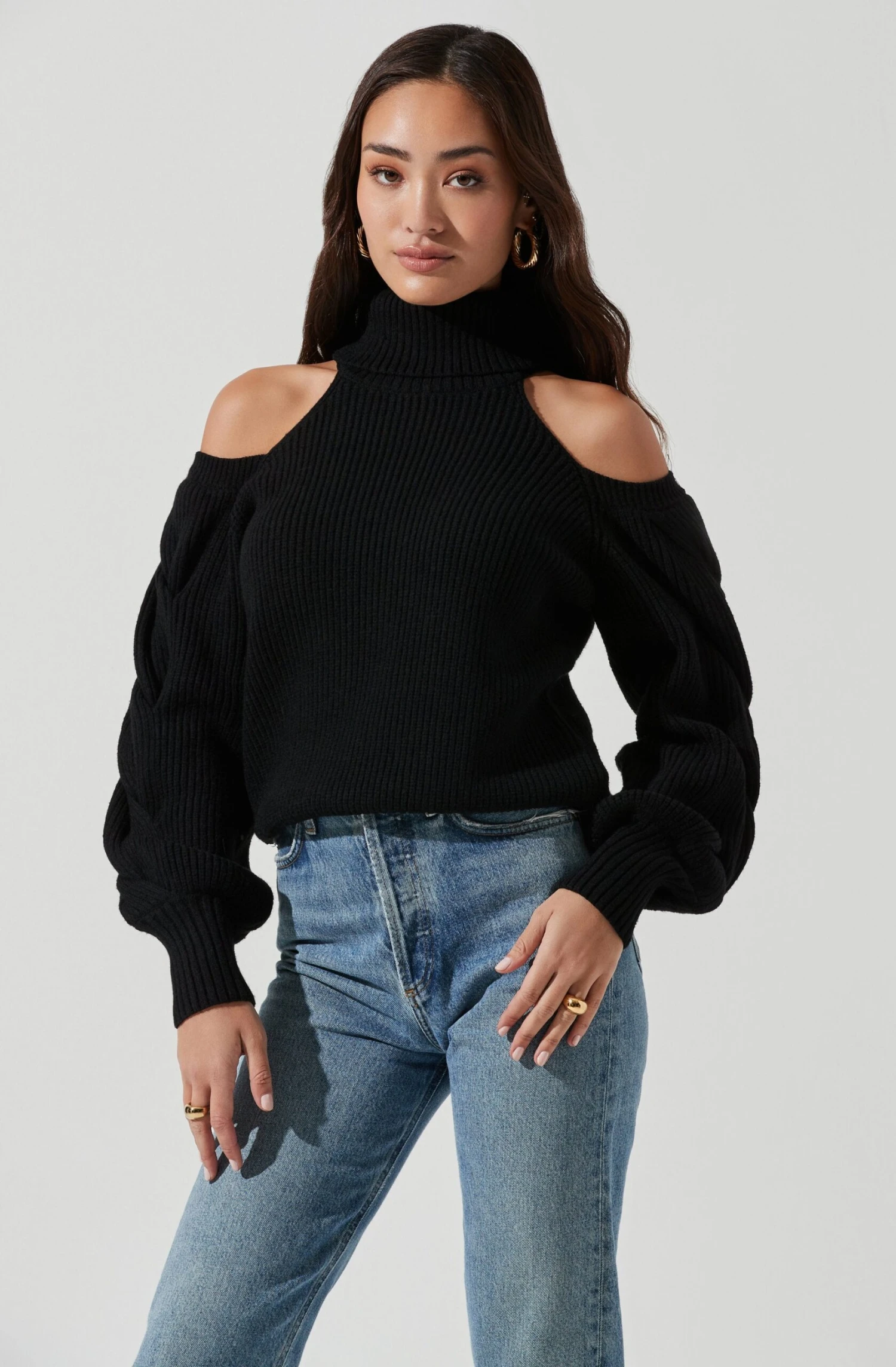 The Rhoswen Sweater features a cable knit design that’s perfect for cold days. Turtleneck leads to cold shoulder cutouts and long sleeves. Relaxed fit.Â