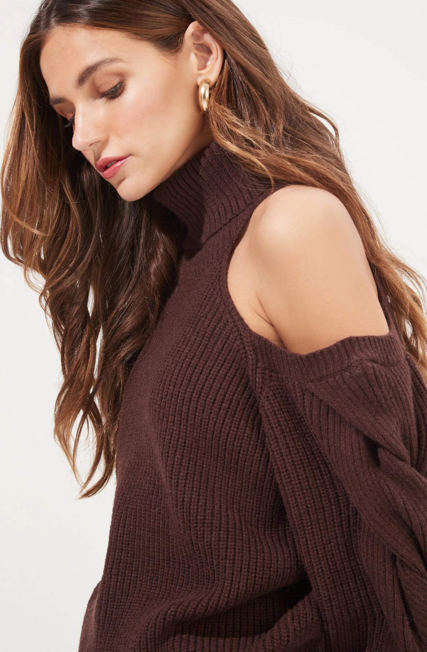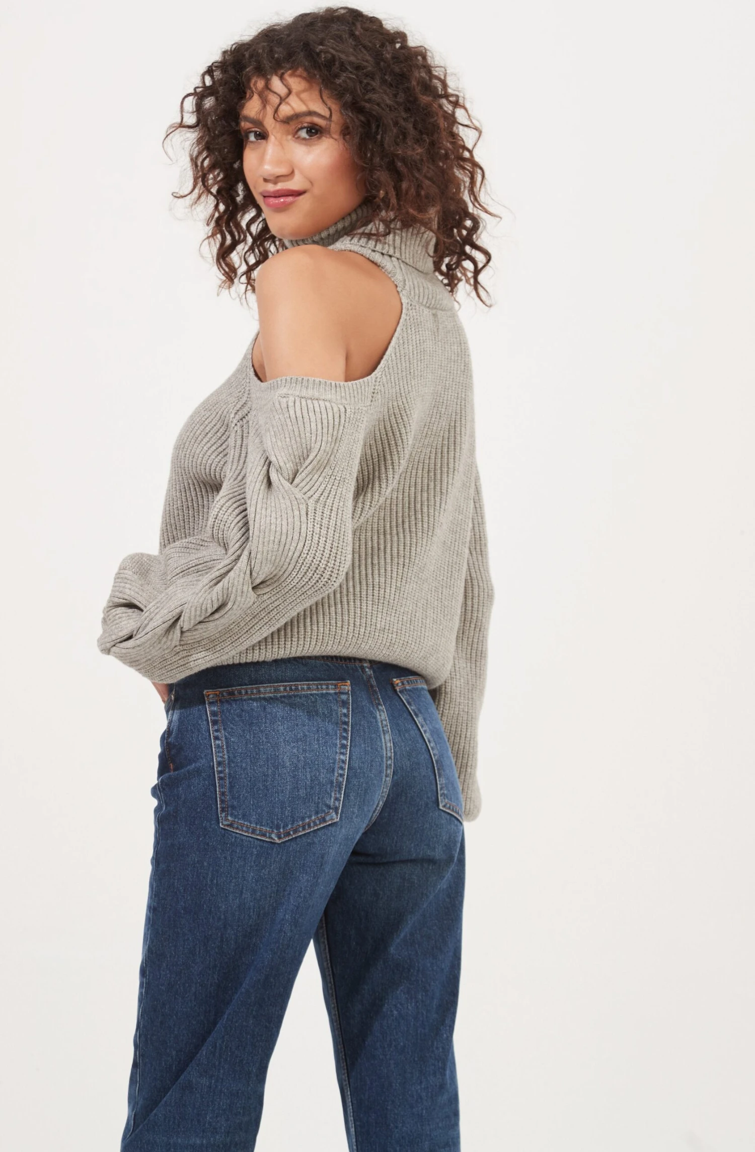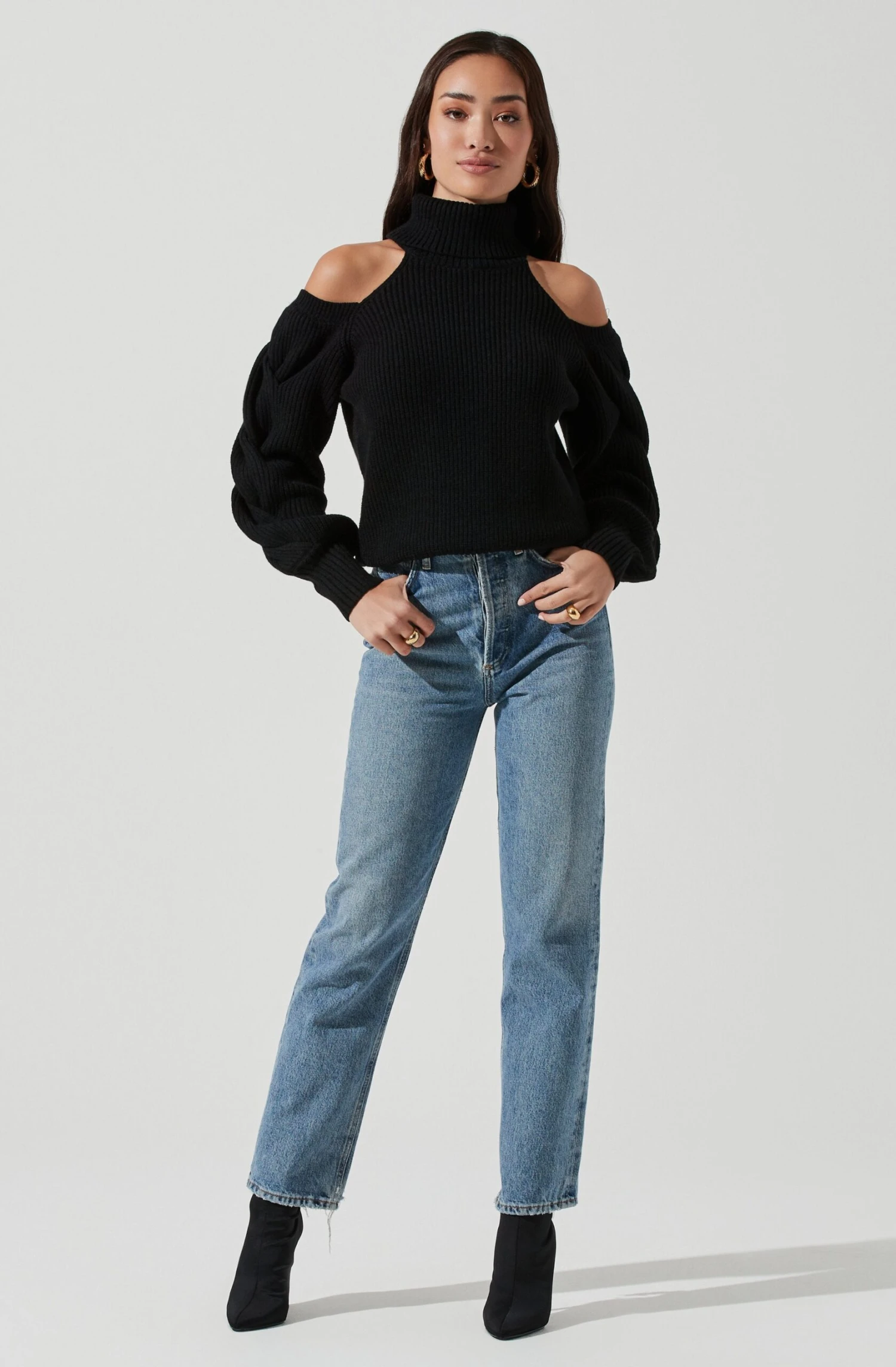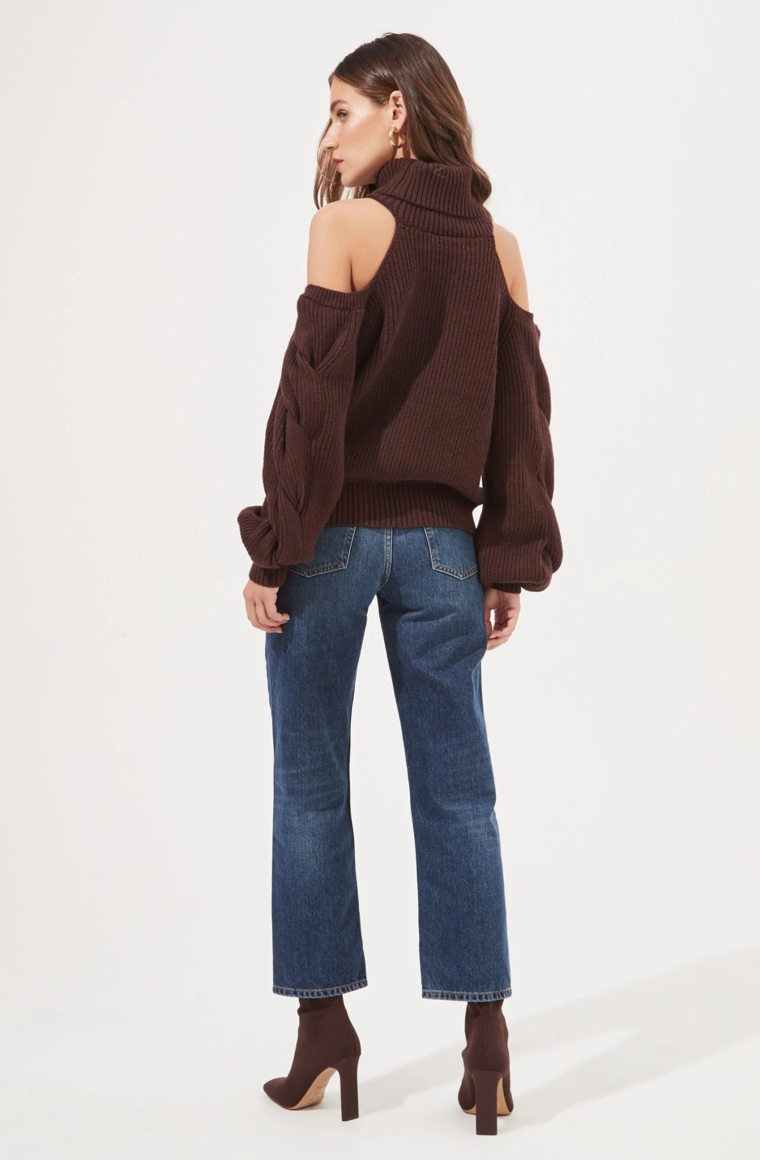 The Rhoswen Sweater features a cable knit design that’s perfect for cold days. Turtleneck leads to cold shoulder cutouts and long sleeves. Relaxed fit.Â
