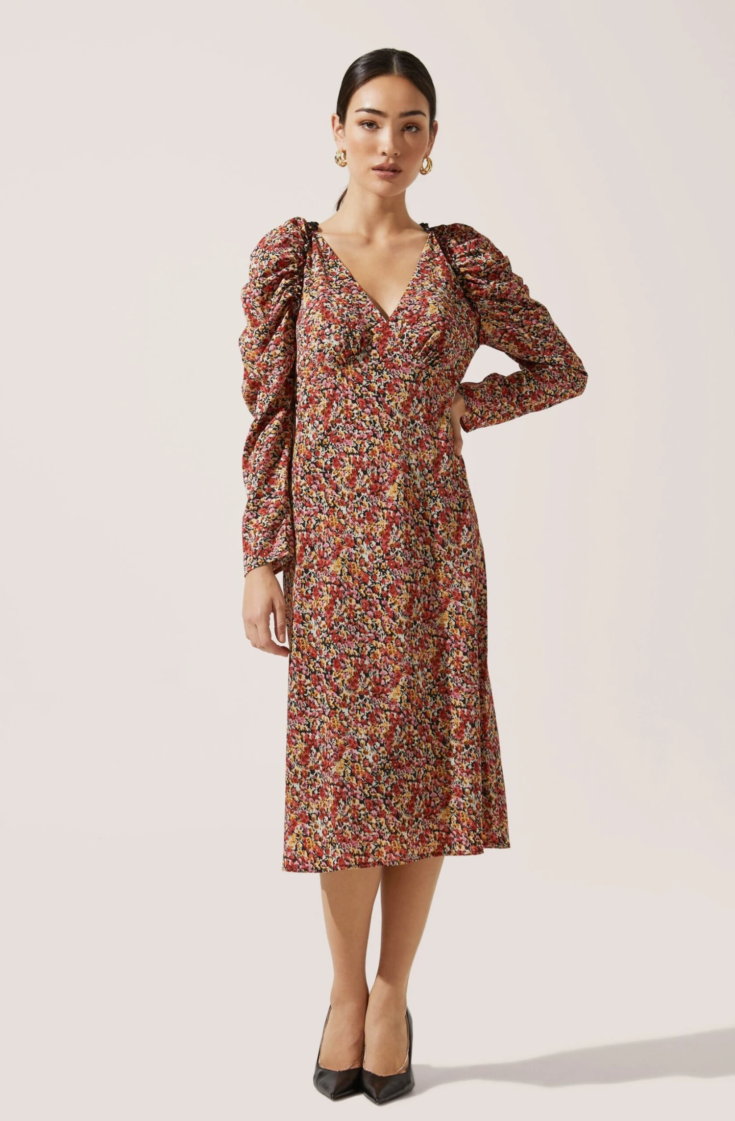 A perfectly romantic dress for special occasions. It features a ditzy floral print with a V neckline that leads to a midi-length skirt. Long sleeves with ruched detailing.