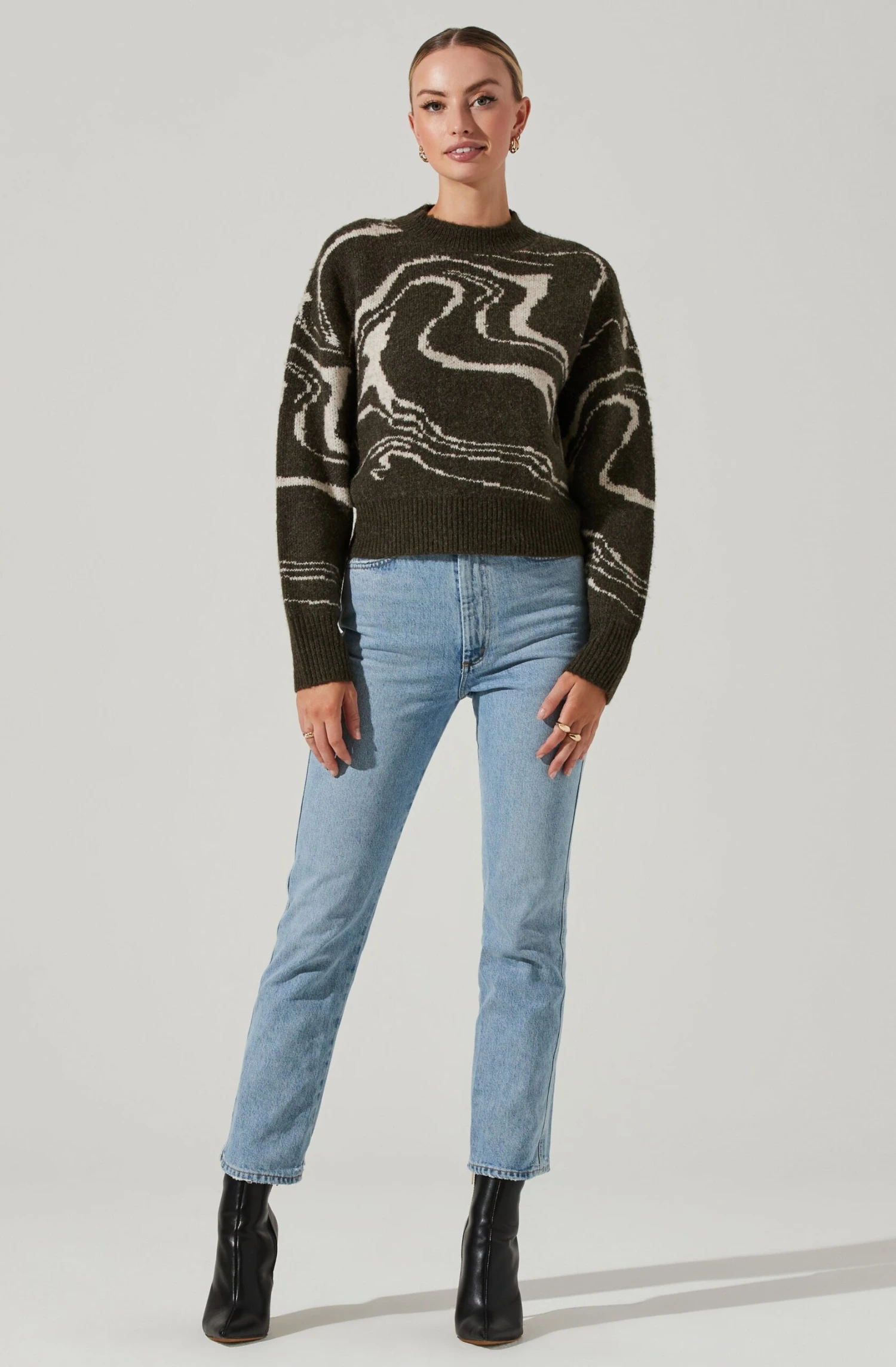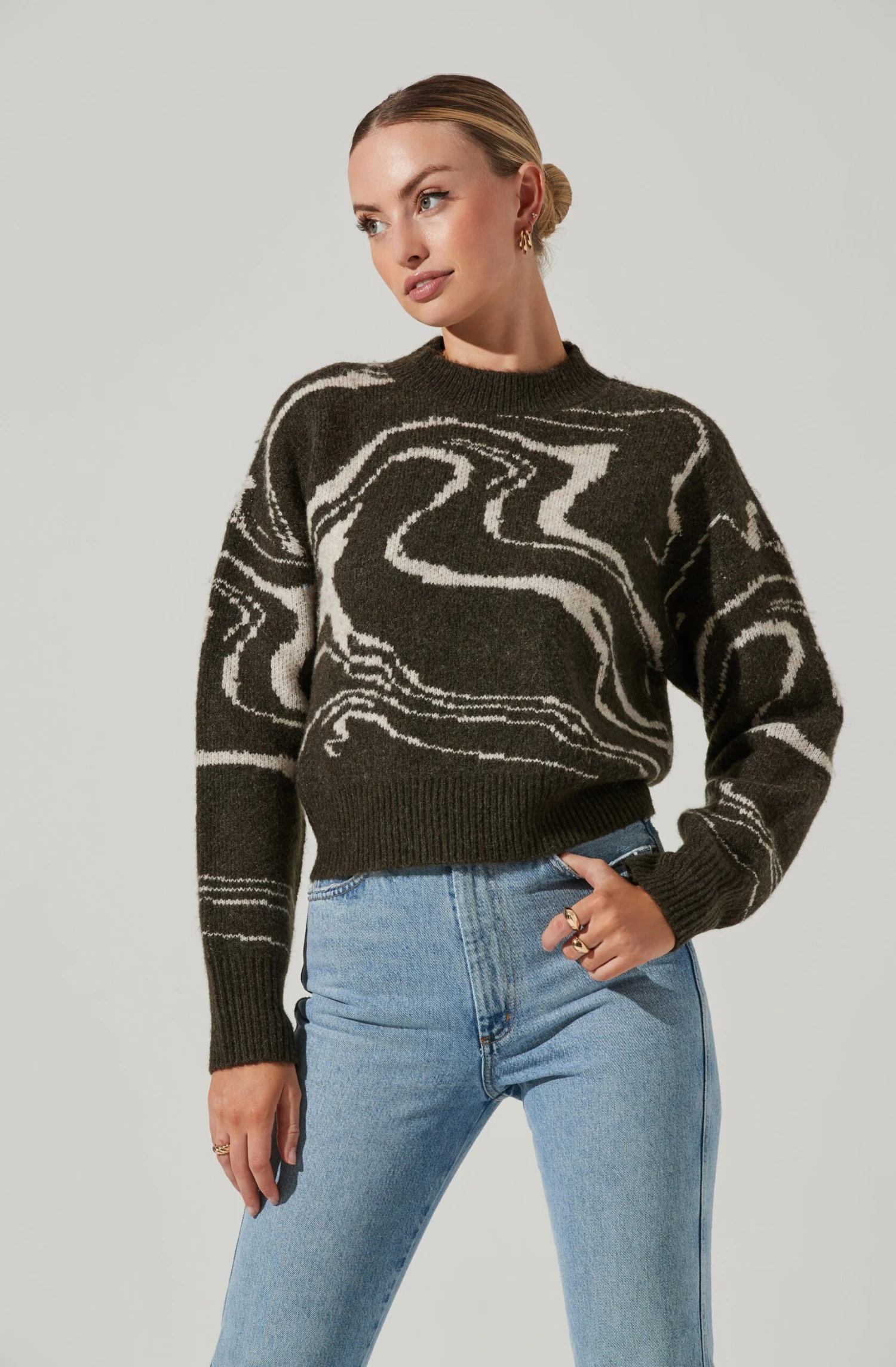 Keep it cozy in the Saira Sweater. It features a marbled swirl pattern throughout. Long sleeves. High neck collar.