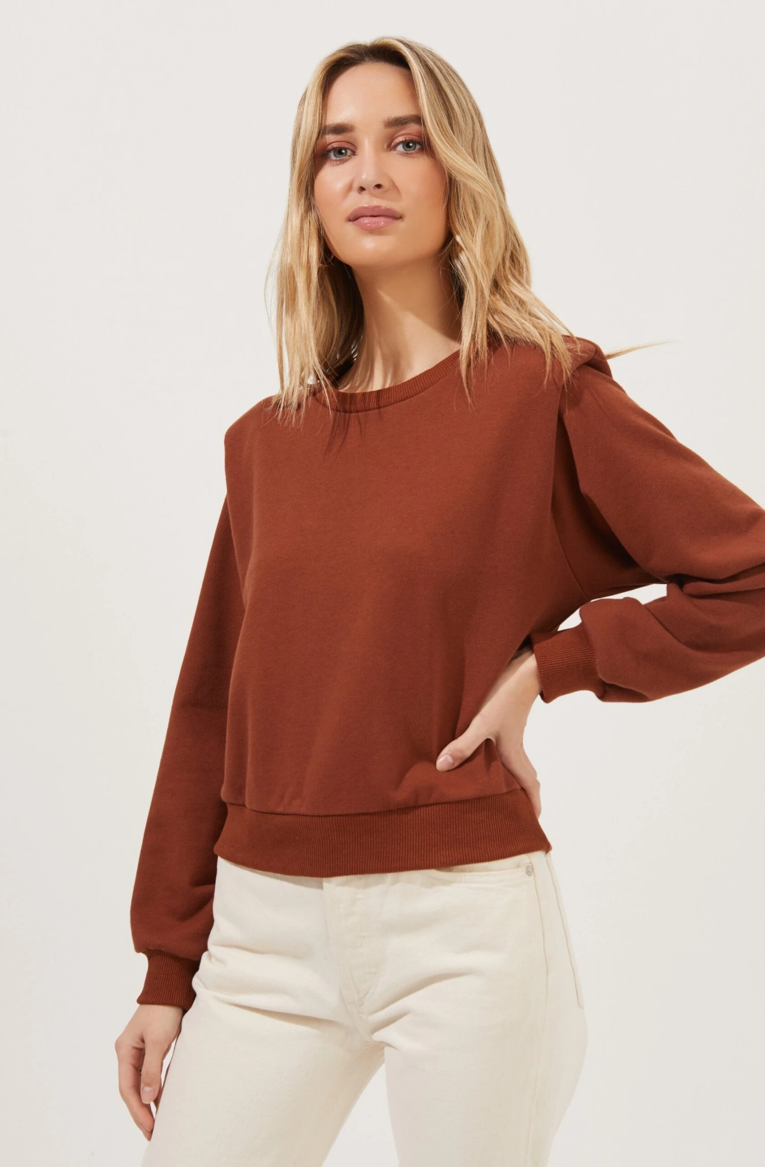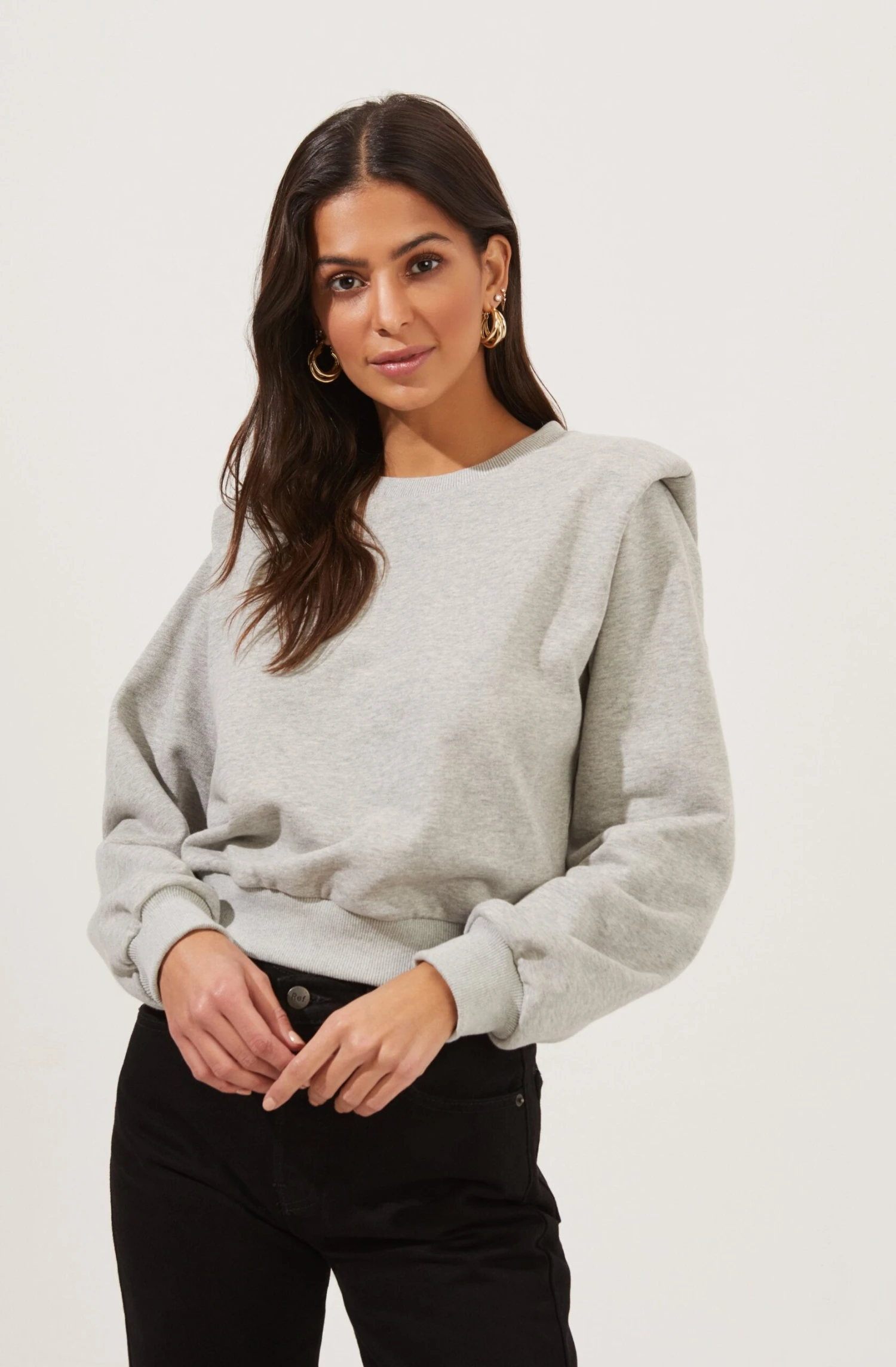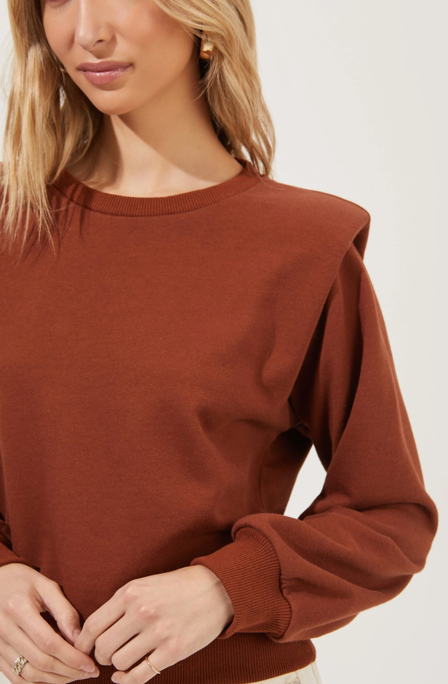 The Sparrow Sweatshirt features a crew neckline that leads to a relaxed fit. Long sleeves with statement padded shoulders.