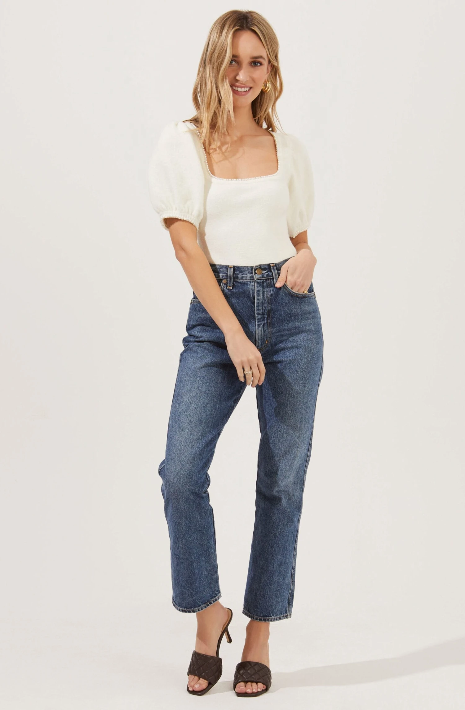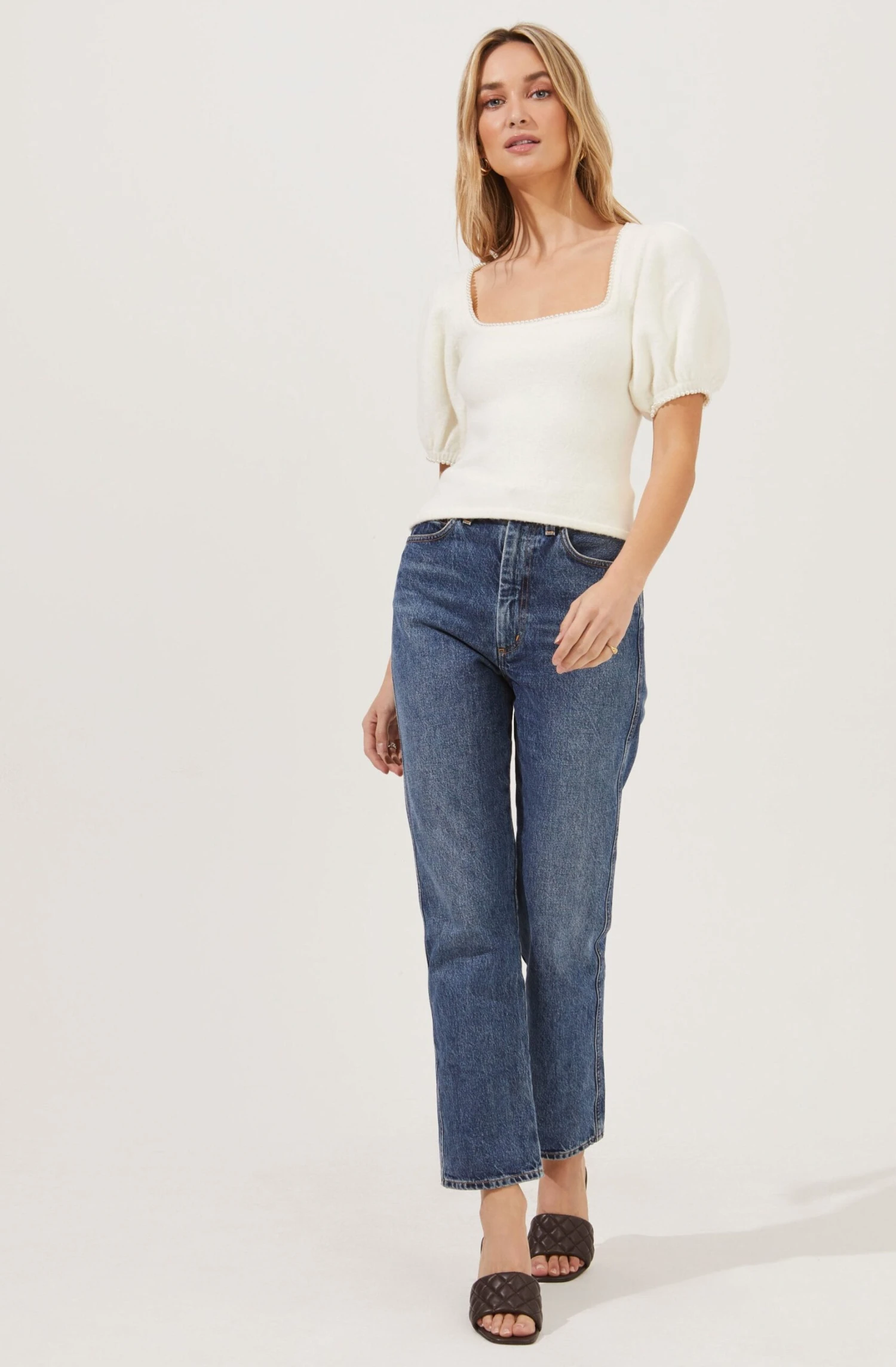 Wrap yourself up in the Sweet Life Sweater. It features a square neckline that leads to short puff sleeves. Faux pearl trim along the neckline and sleeves. Fitted design.