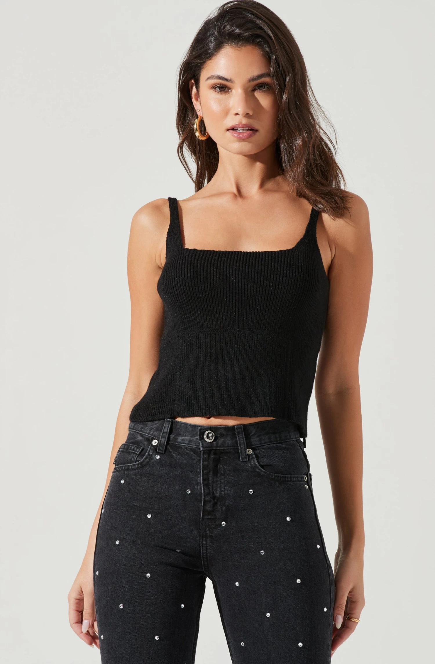 This shrug sweater set features a removable bolero top with a high neck and long sleeves. Knit tank features a square neckline.