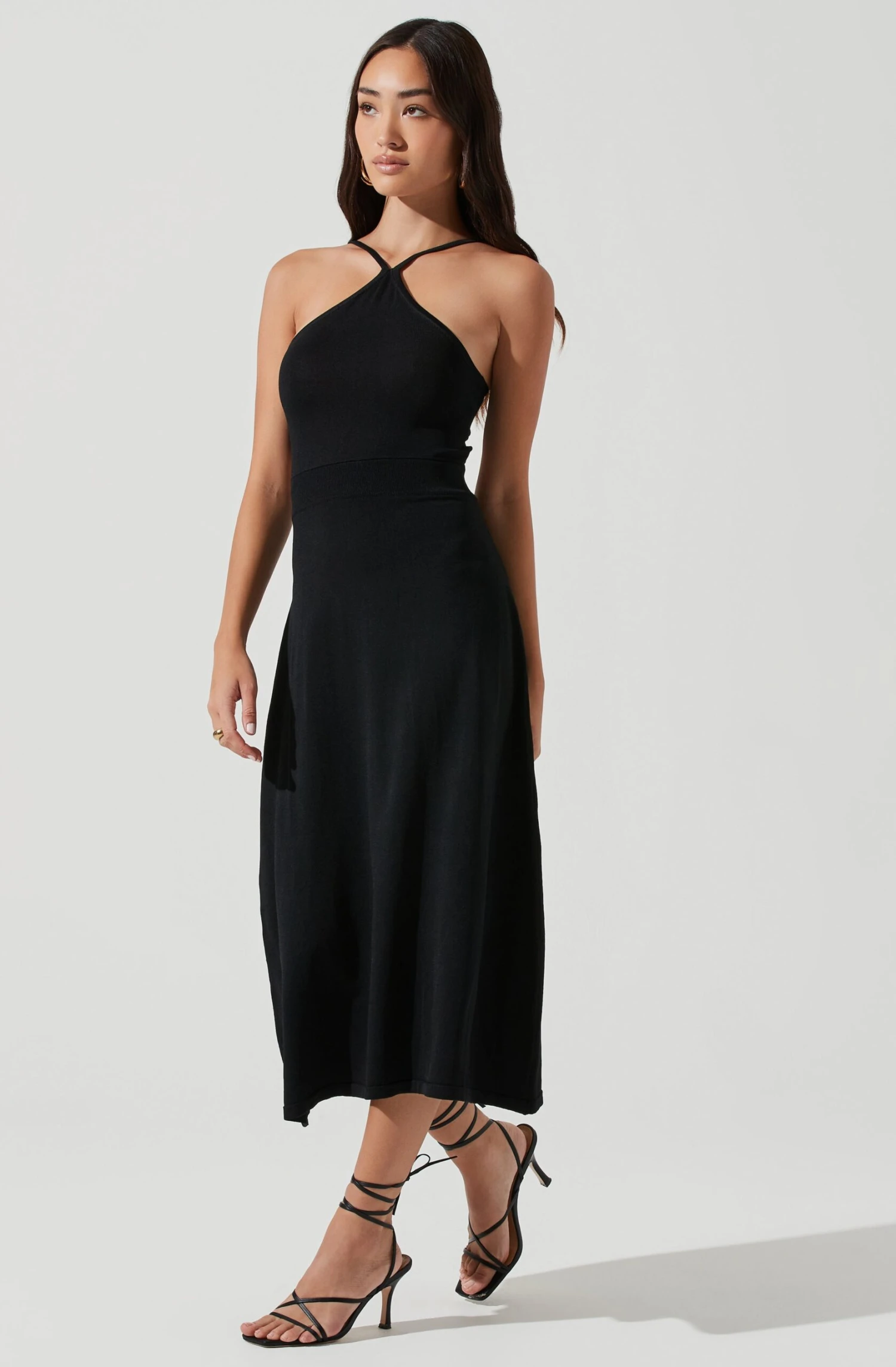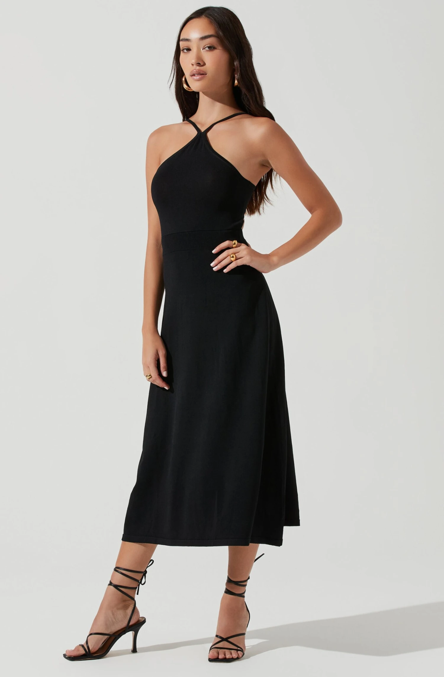 The Talia Dress features a halter neckline that leads to a cutout back detail and adjustable straps. Midi-length skirt.