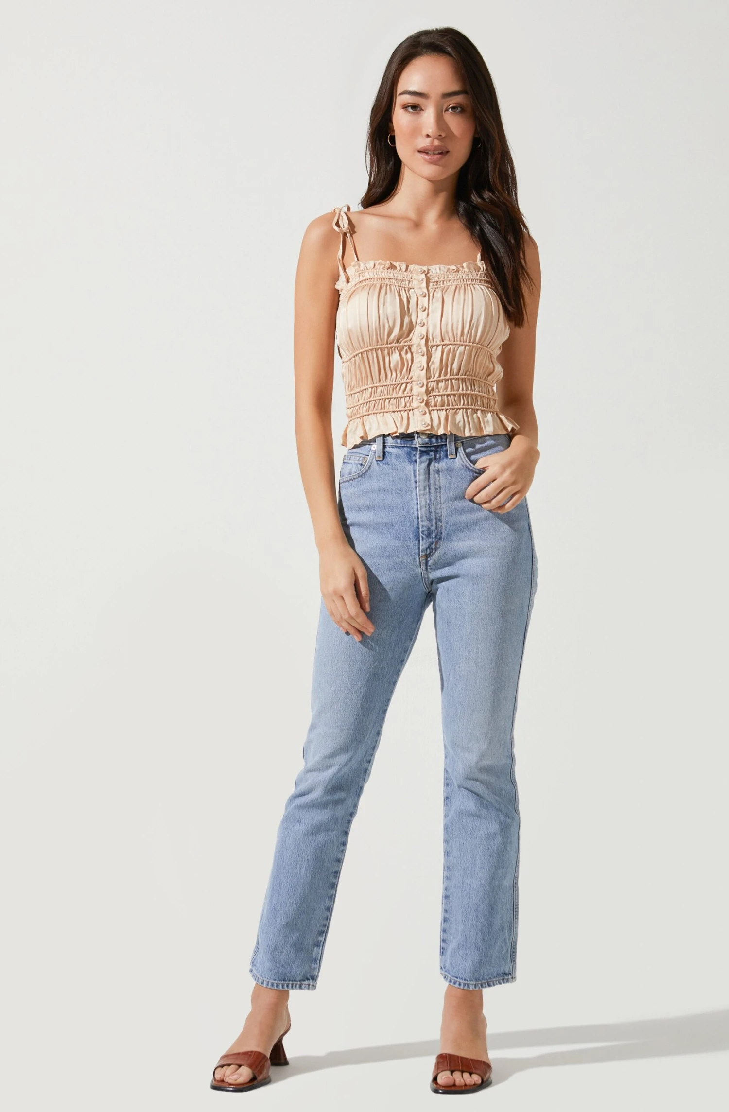 It’s all in the satin effect. This romantic cami features a square neckline with ruffle trim supported by tying straps. Faux pearl button accents along the front. Ruched silhouette with a ruffle trim along the hem.